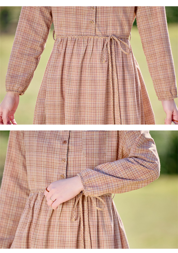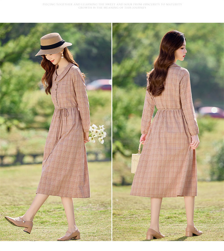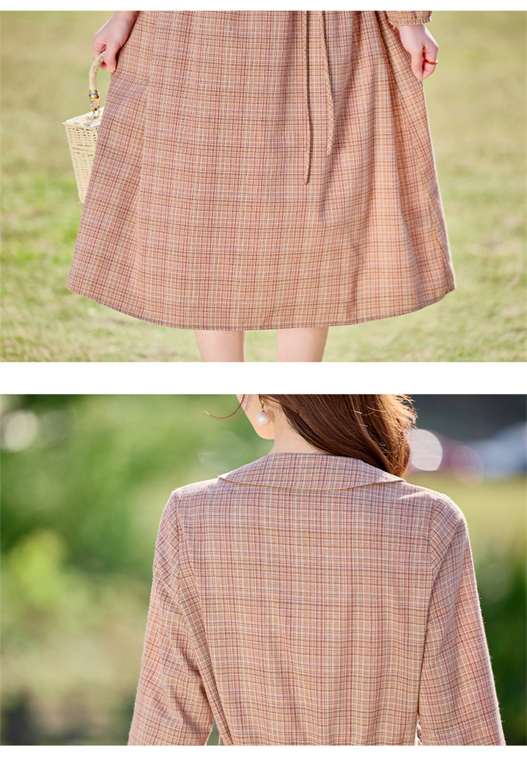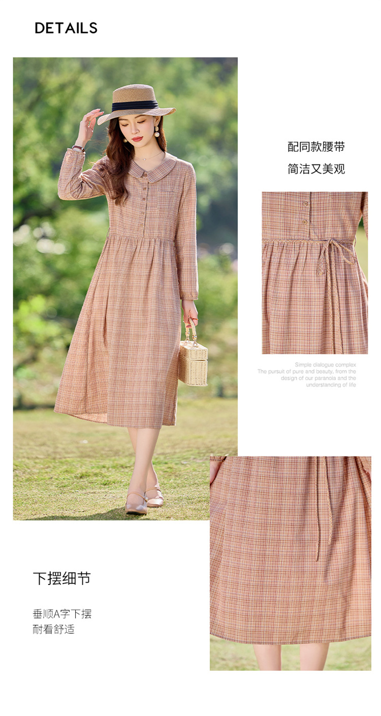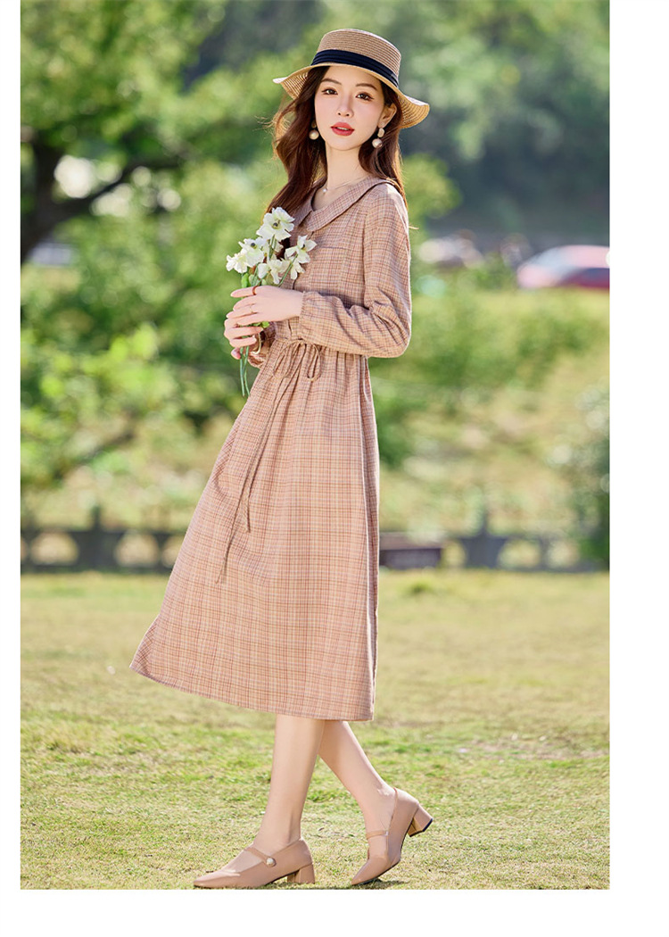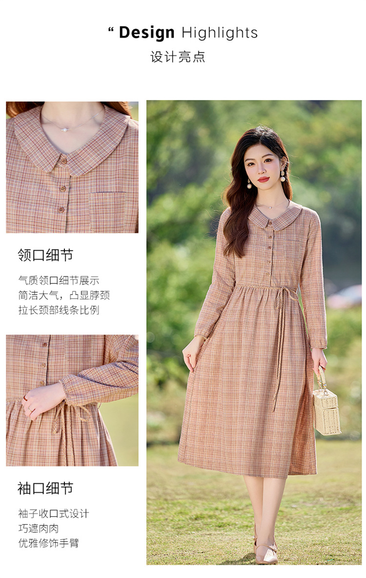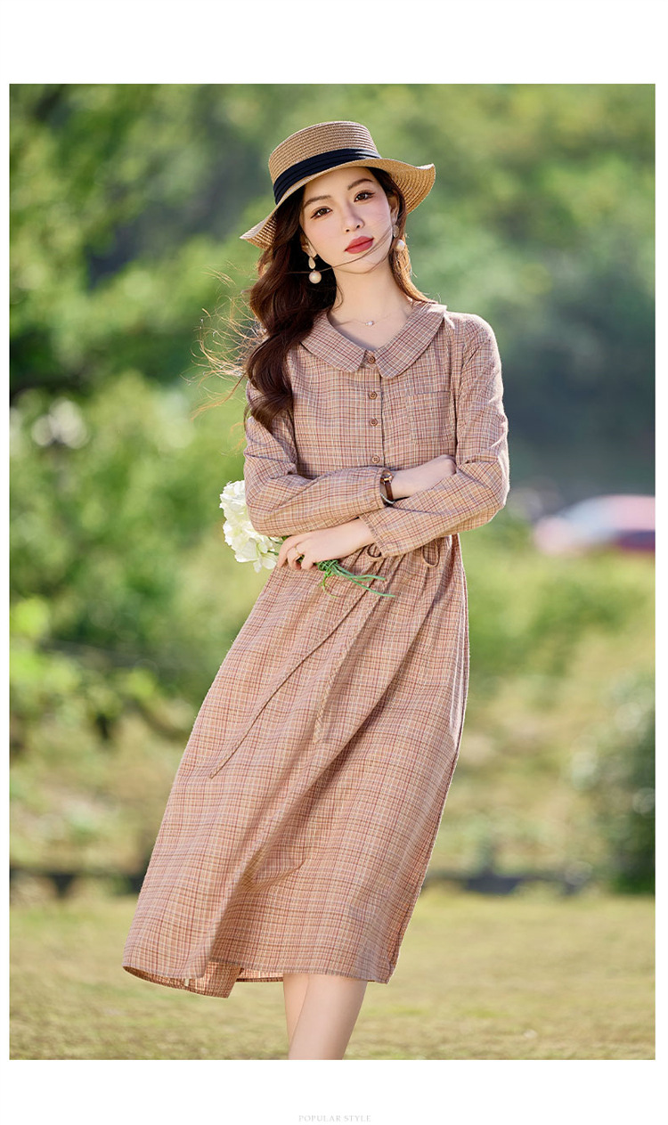 HR-SYY2676文艺格子中长裙春季2025优雅收腰复古系带长袖格纹气质显瘦连衣裙