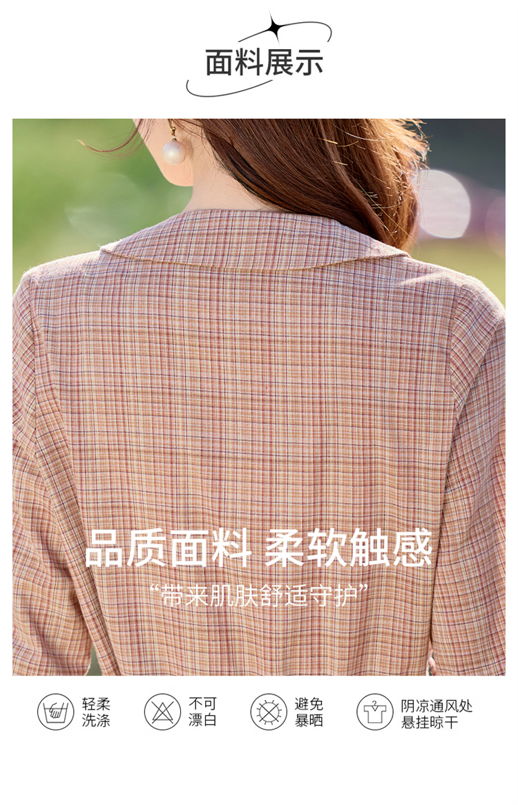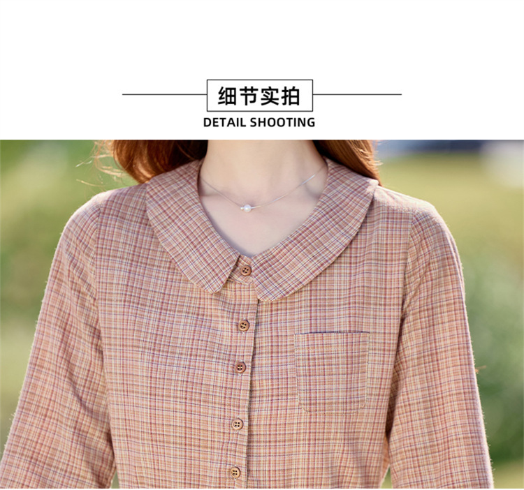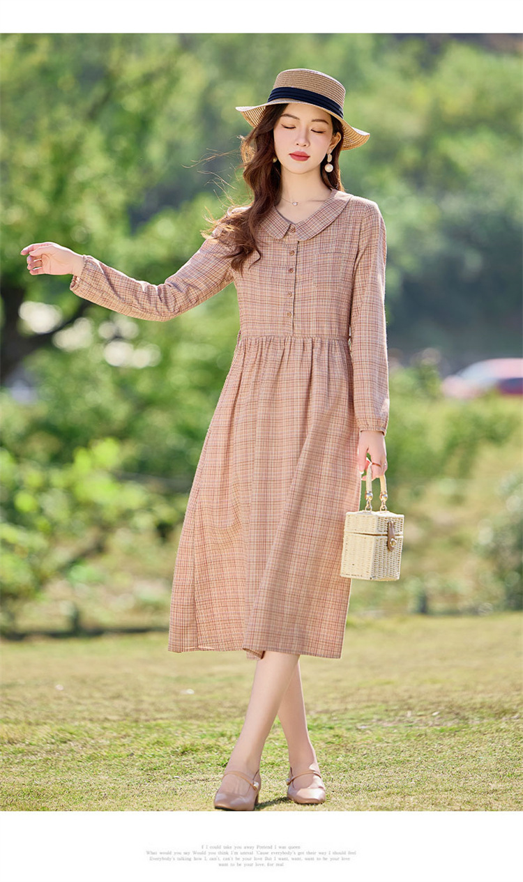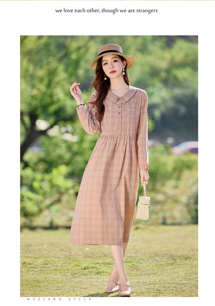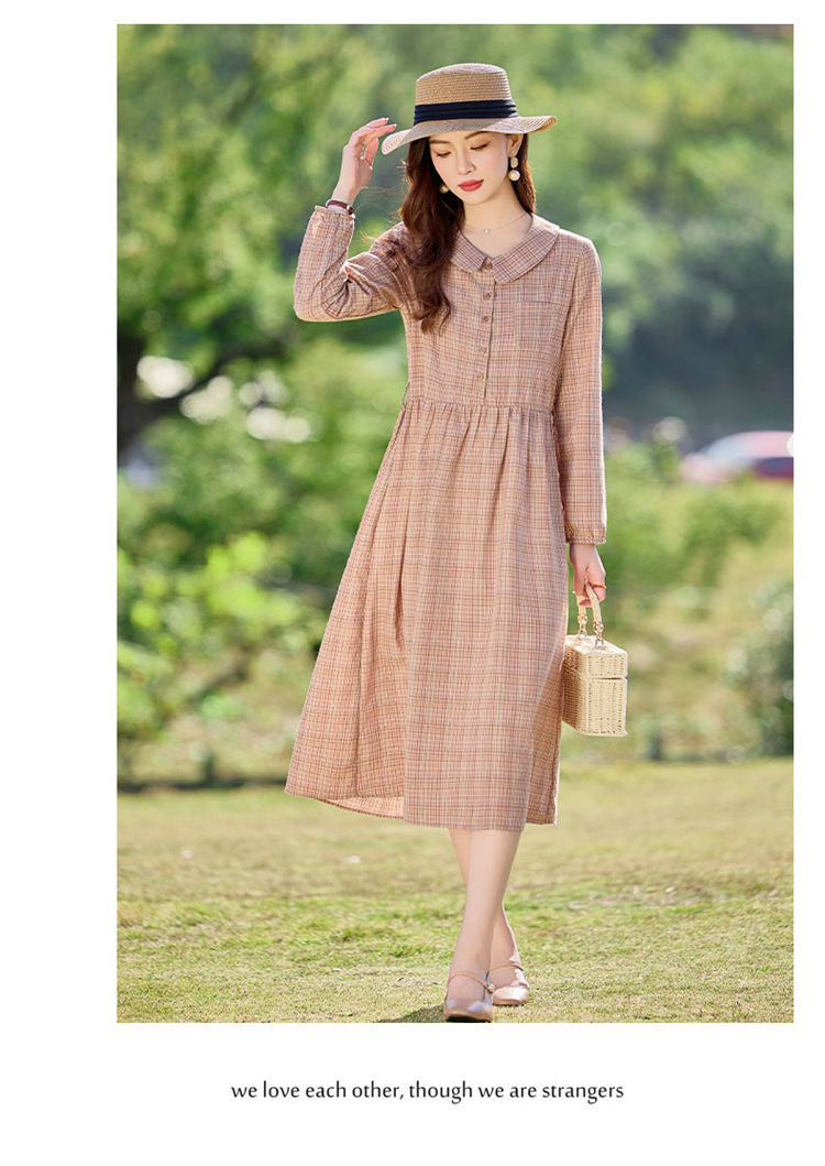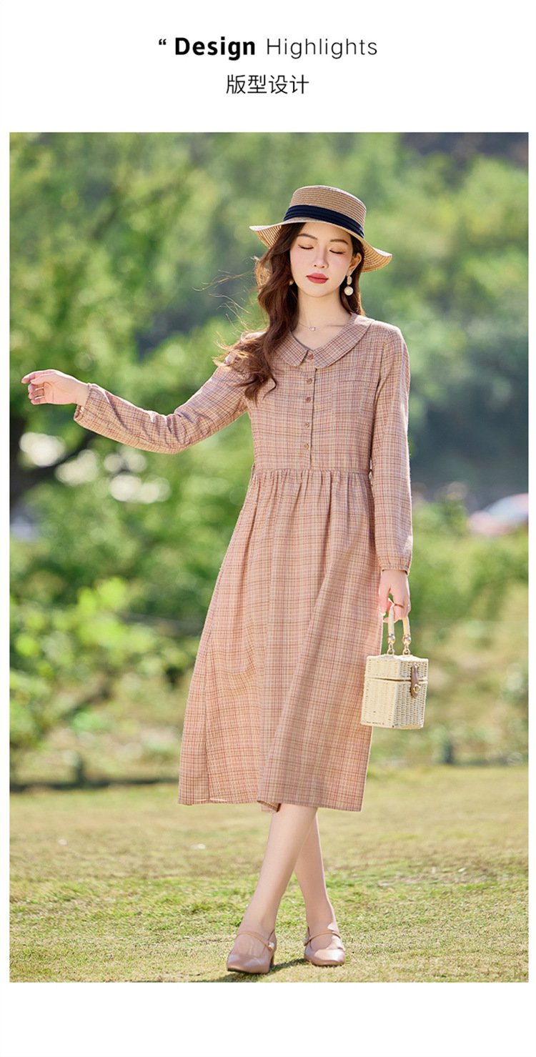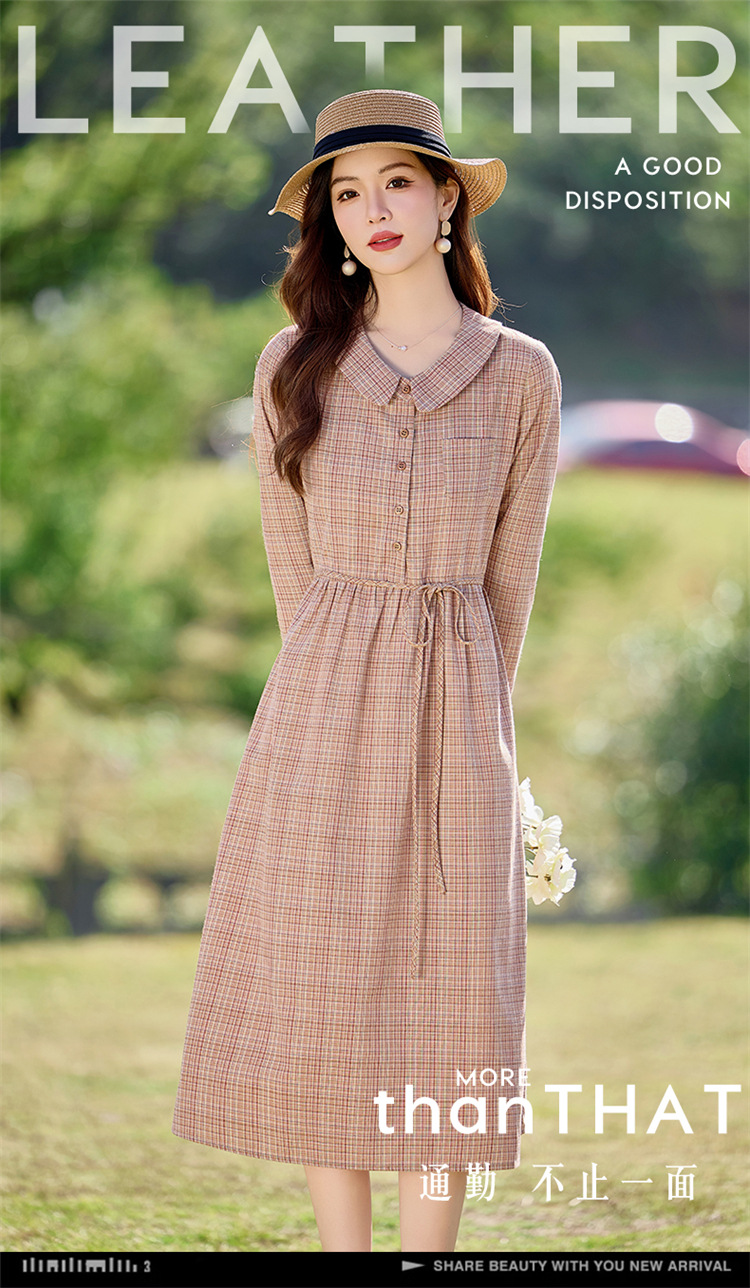 HR-SYY2676文艺格子中长裙春季2025优雅收腰复古系带长袖格纹气质显瘦连衣裙