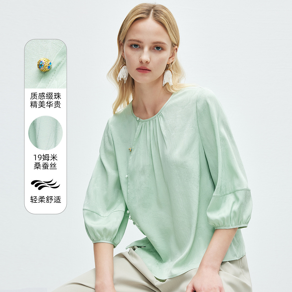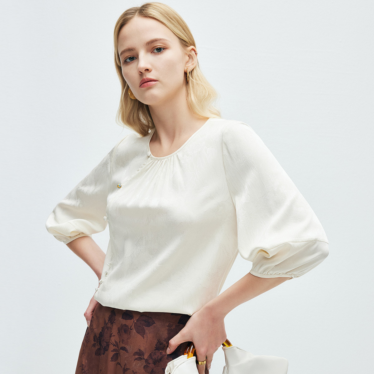 PALUOPO/PL19姆米弹力提花圆领新中式独特斜门襟桑蚕丝衬衫ES250108Z