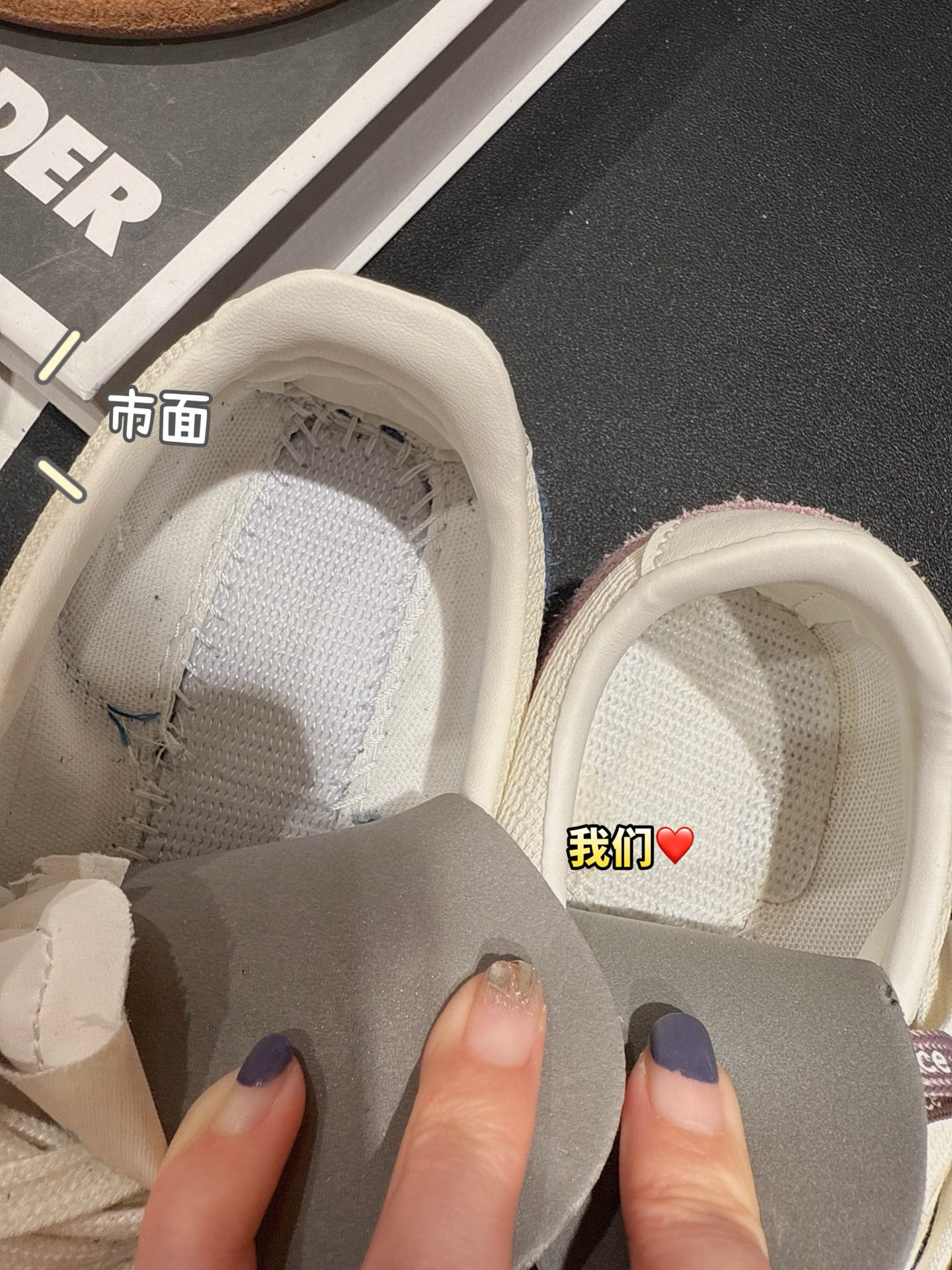 同步原版采用后帮工艺,市面版本为了节约成本,减配工序,用的都是X的套楦工艺,这一点就稳赢☝️