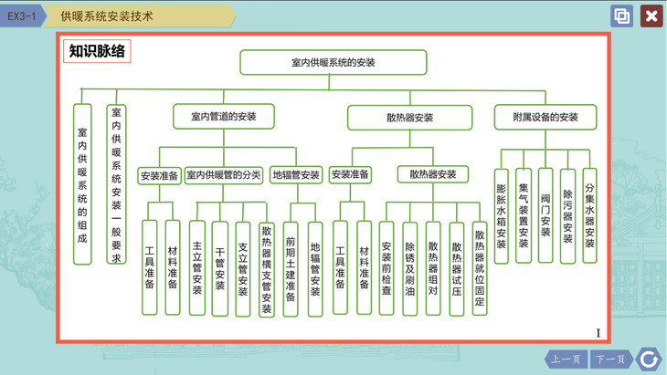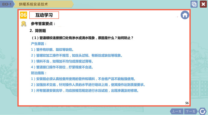本数字教材主要特色优势是:(1)教材体系更加完整。以纸质版教材内容为基础,数字版教材多视角的解读基本知识和亮点技术等,使得知识内容的完整性、系统性、可读性等进一步加强。(2)教材表达多元新颖,理论联系实际。根据安装工程施工的技术特点,用“图片示例”清晰、简明、直观地描述了安装工程施工的工艺过程、操作要点、质量要求等,同时,对于安装施工的重点内容,又以“视频示例”动态地表述其实际过程;对于建筑设备安装技术与经济管理的脉络知识和案例分析,进行了梳理和展示。(3)开放性的知识框架与“问题-解析”式的互动学习。在教学课件使用过程中,与纸质教材相比,该数字课件在多媒体教学平台上很容易实现与不断发展的新知识、新内容协同共享,使教学内容与时俱进,包容开放。同时,在“知识演示”板块的基础上,为进一步引导与激励学生学习有关知识兴趣,还制作了相应的“互动学习”板块,问题包括:基础性知识、系统性知识、挑战性知识等;有问有答,可反复学习、练习,加深知识的理解和有助于重点知识的掌握。