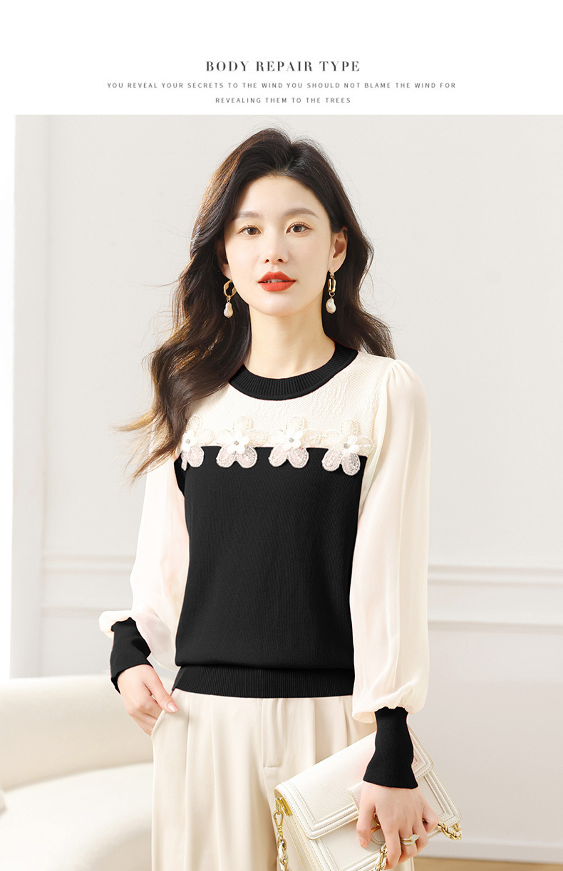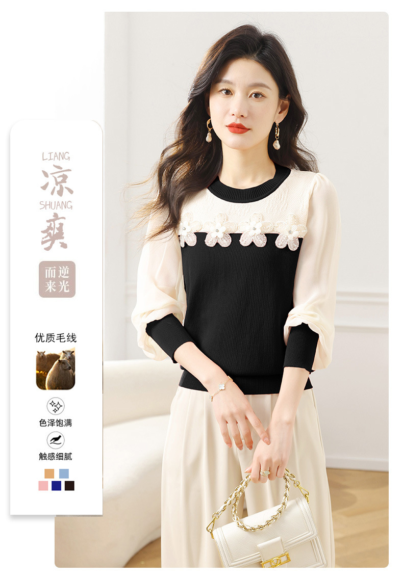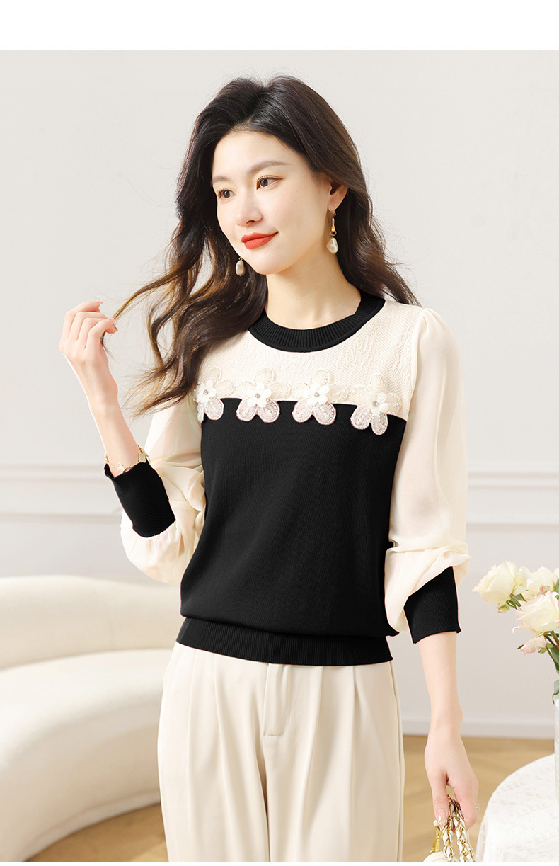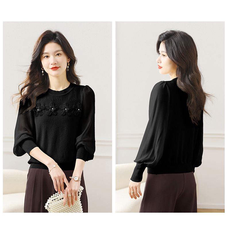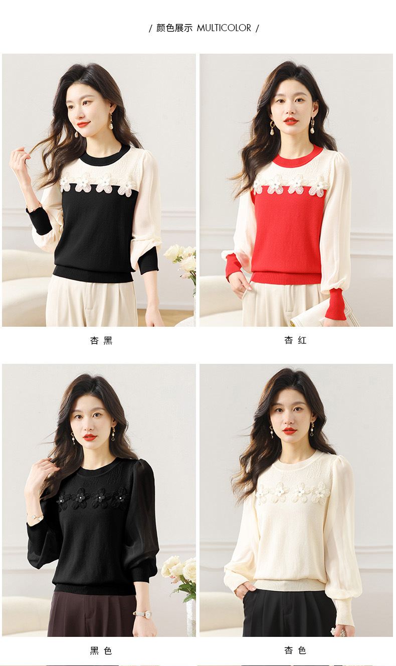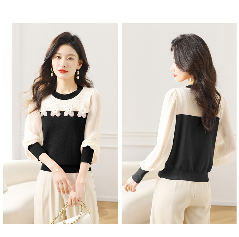 春款长袖T恤内搭圆领打底衫,洋气百搭雪纺拼接针织上衣CC-MY3531