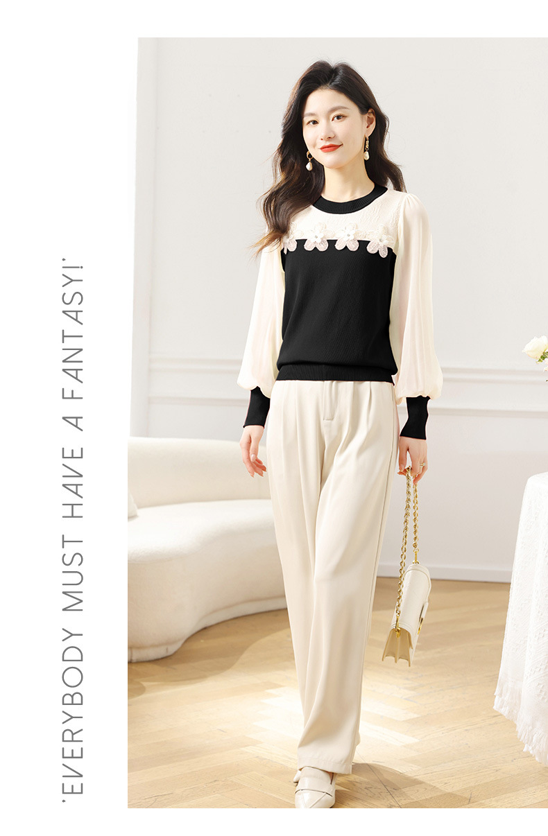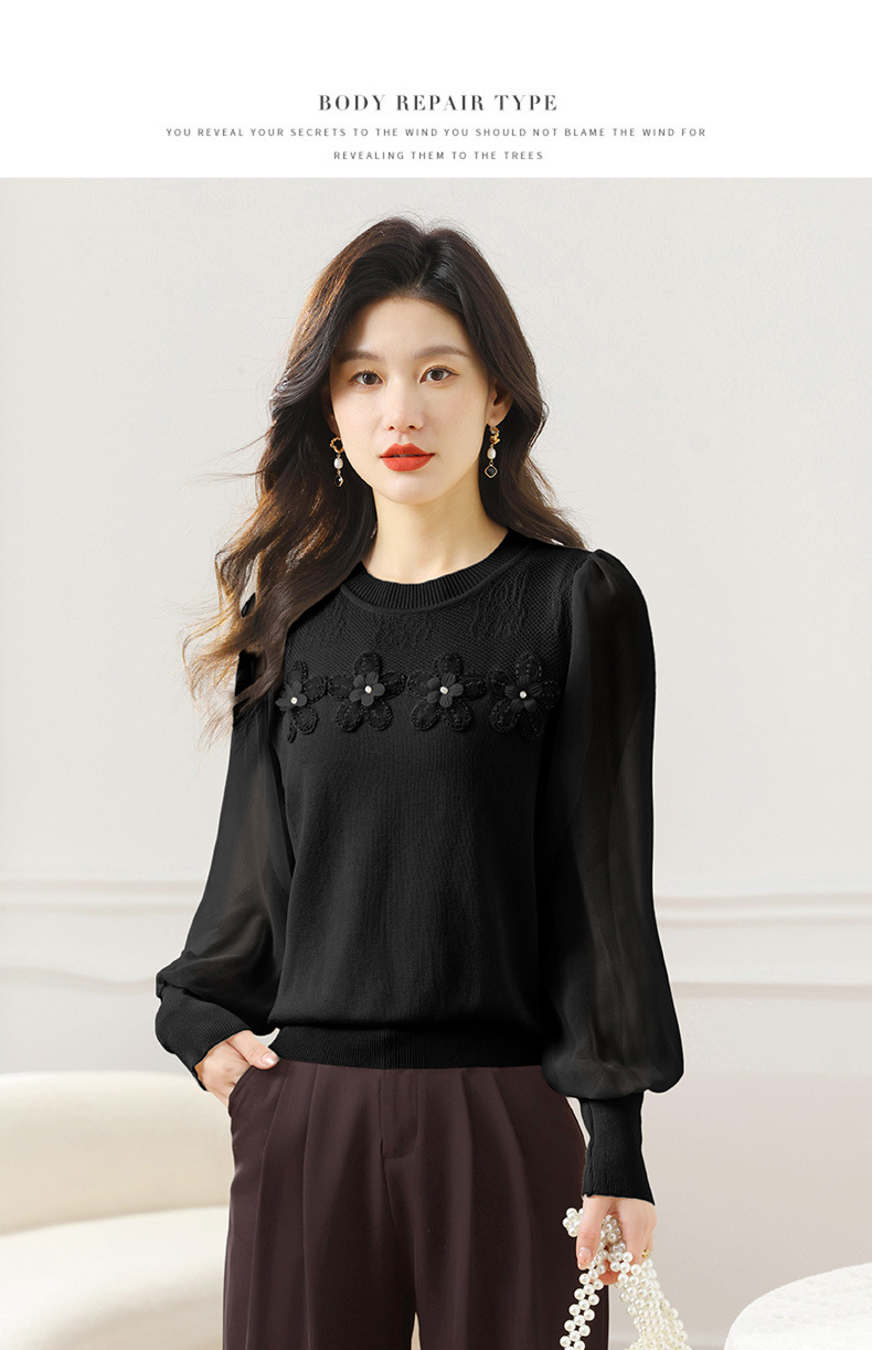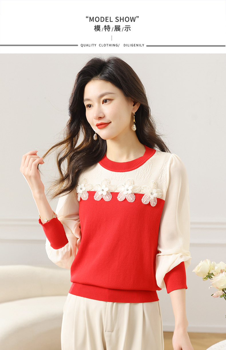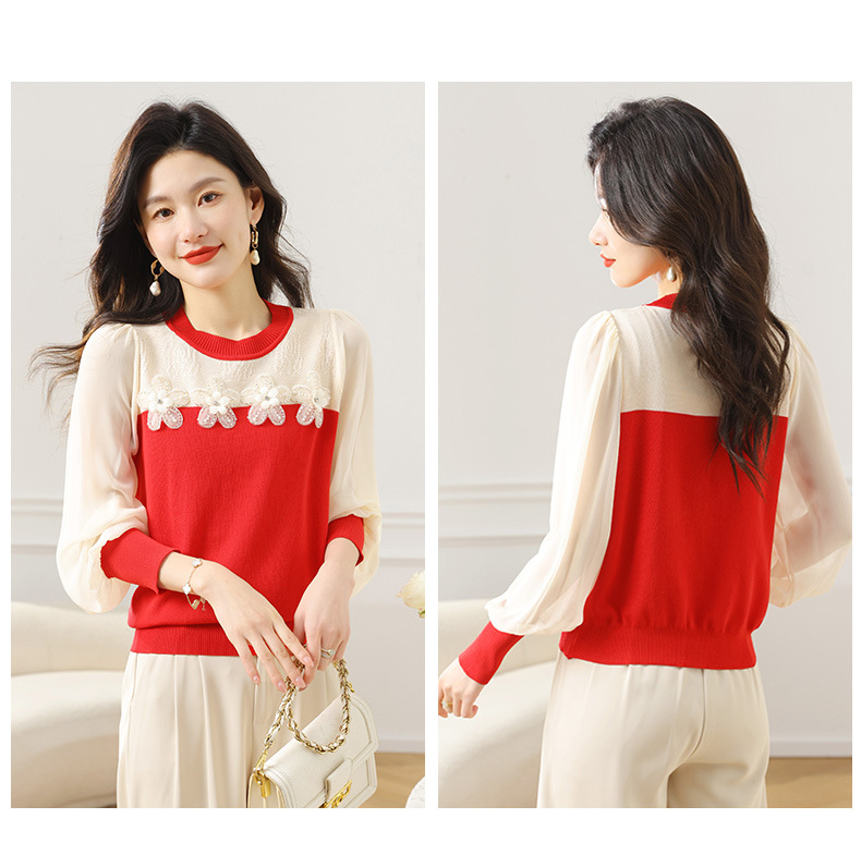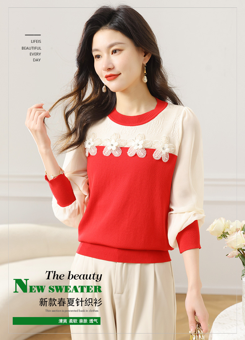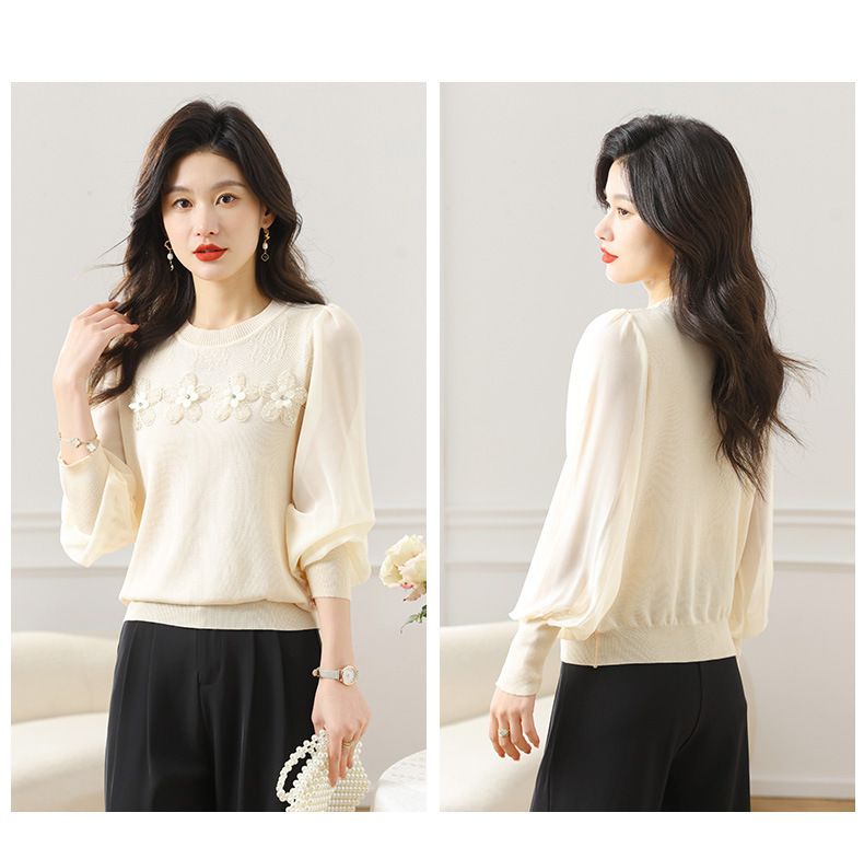 春款长袖T恤内搭圆领打底衫,洋气百搭雪纺拼接针织上衣CC-MY3531