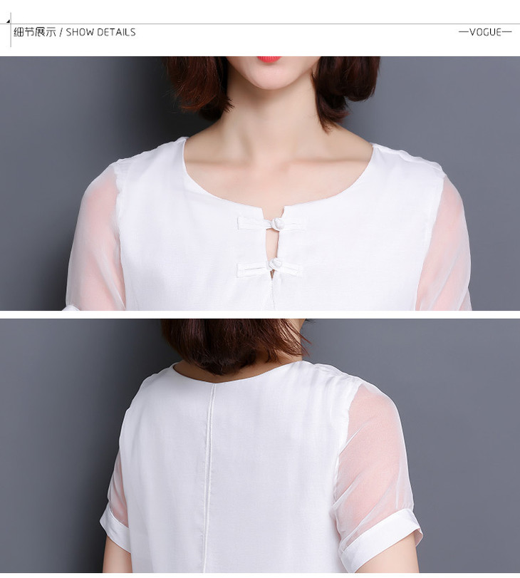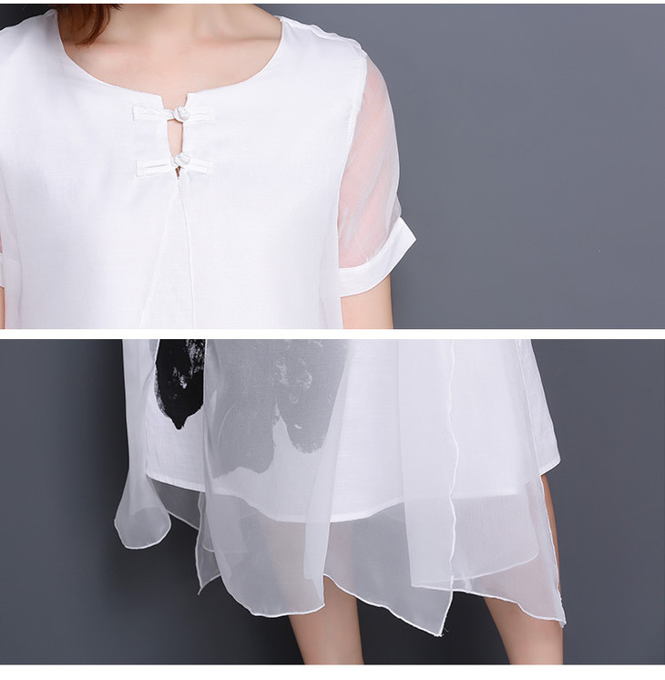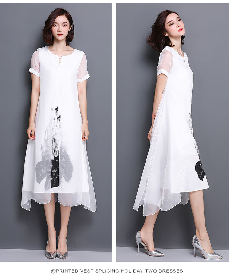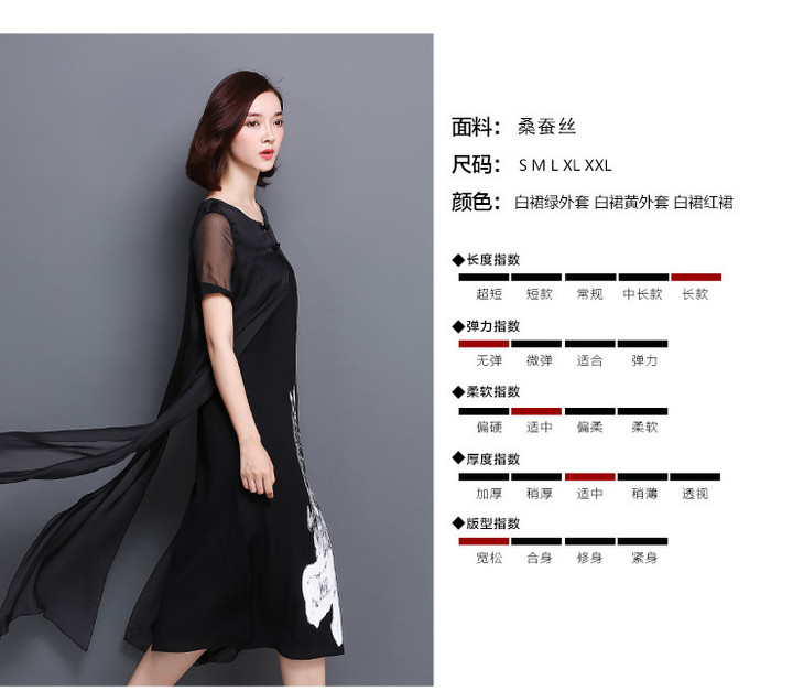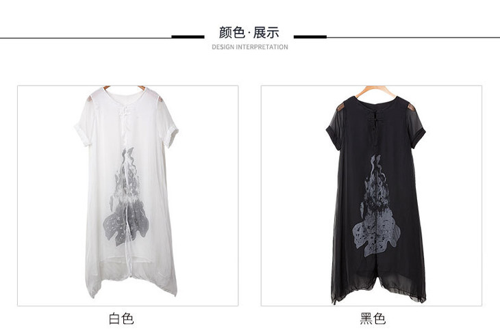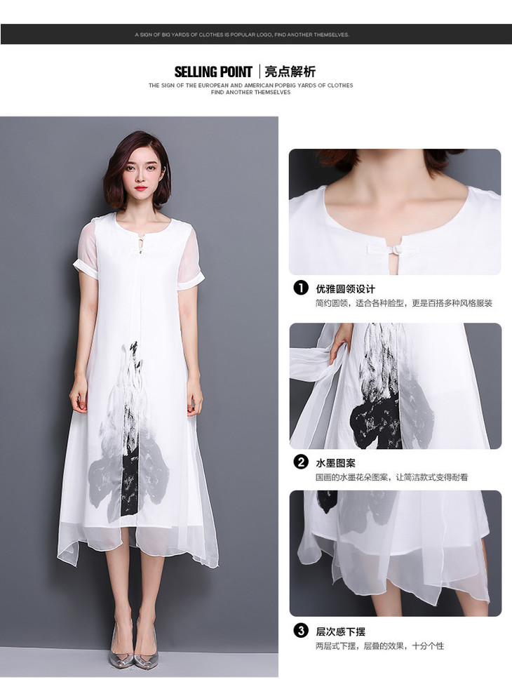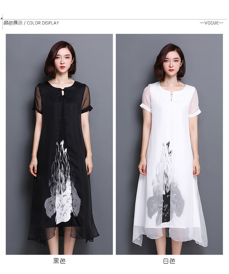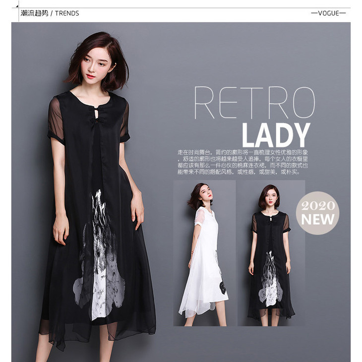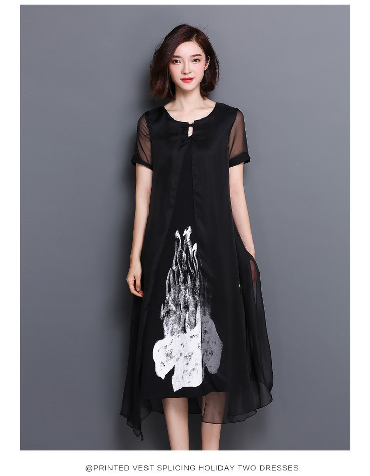 YS-1150复古仿真丝短袖拼接印花雪纺大码连衣裙