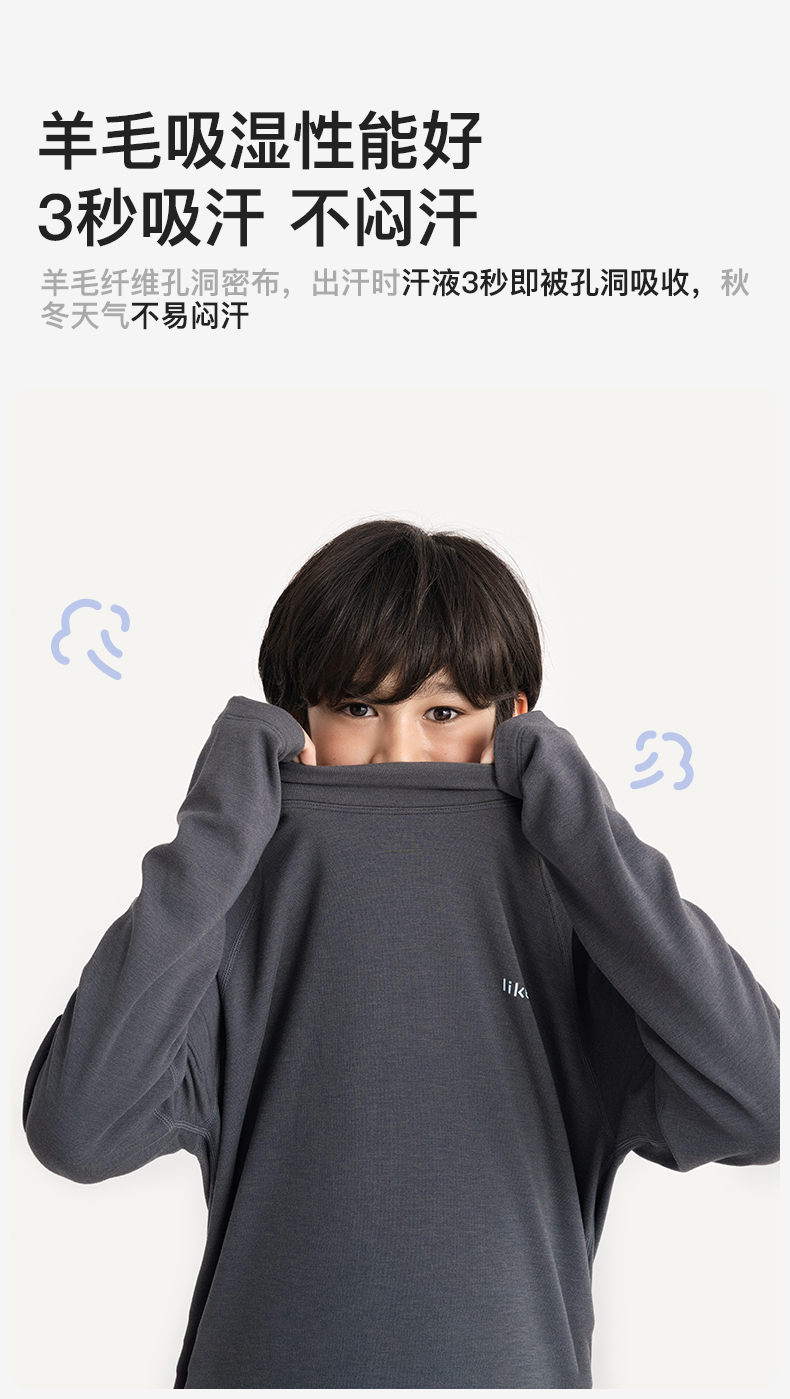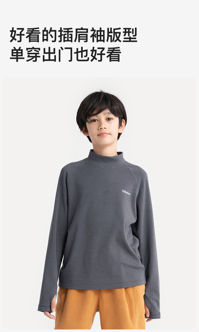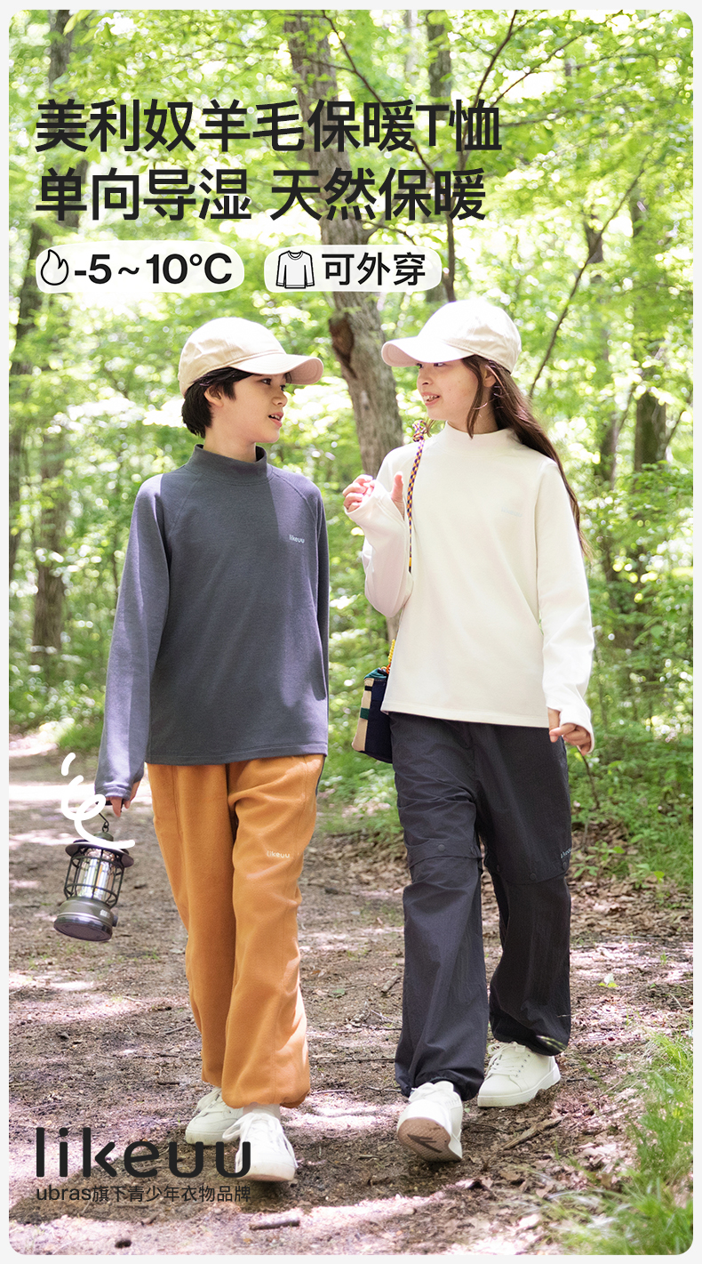 likeuu儿童T恤长袖男女大童美利奴羊毛排汗秋冬保暖A类吸湿透气ZY