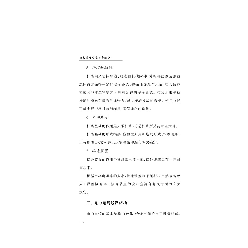 本教材以35kV~110kV的架空线路和电力电缆相关运行维护知识以及工作流程为主要学习内容和目标,并以此为基础扩展到更多电压等级的运维知识。首先介绍了电力生产的常识以及输电线路在电力生产中的地位和作用,然后介绍运维工作的目的以及作用,对设备运行过程中产生的故障和其他问题分类阐述并讲解常规防治措施和思路,最后介绍了应用较为广泛的几种新技术新工艺新方法,与新兴科技和产业进行对接。本书旨在为学员介绍一个尽量贴近于现实生活环境的知识体系架构,快速对生产环境有一个总体的了解和掌握,同时也能够对工作目的和工作中产生的问题进行系统性思考。