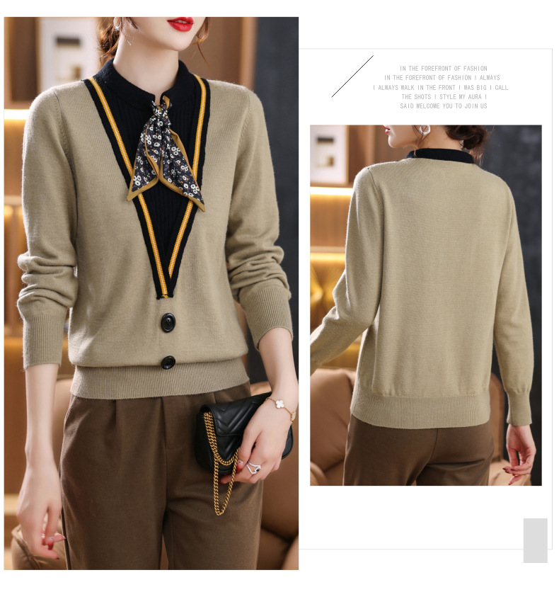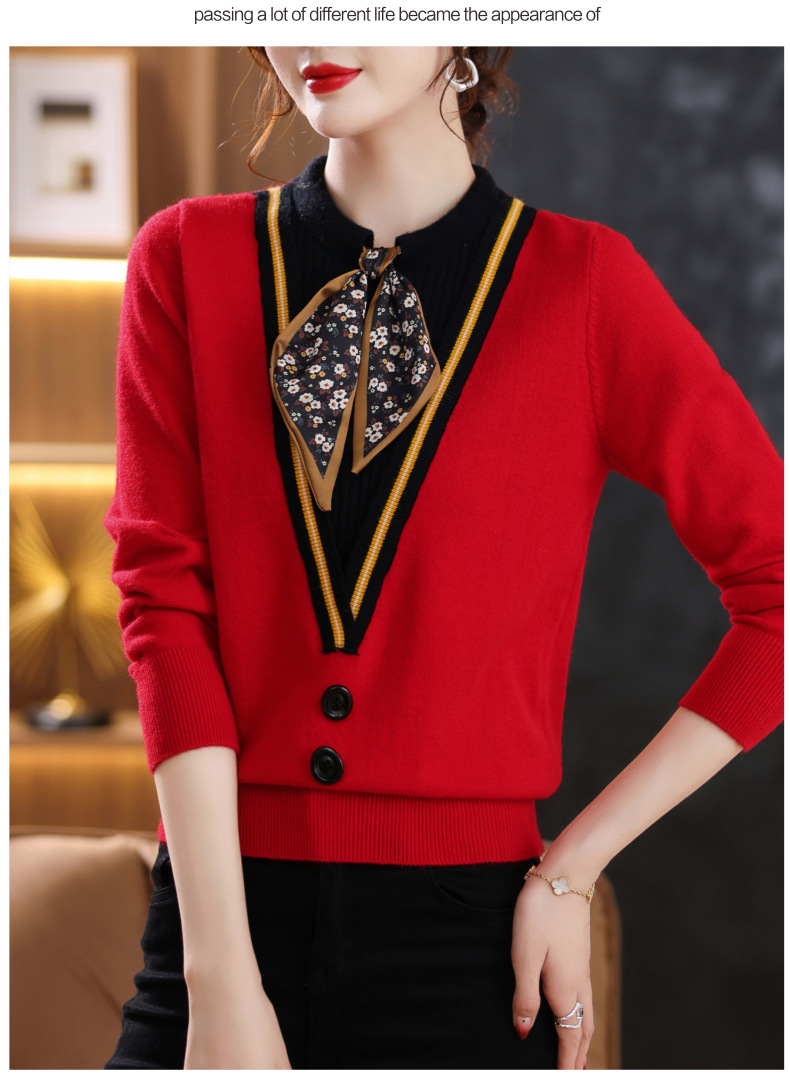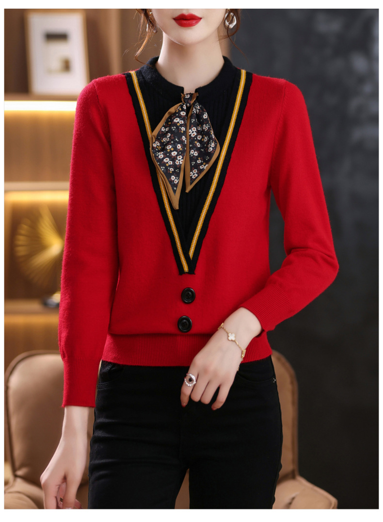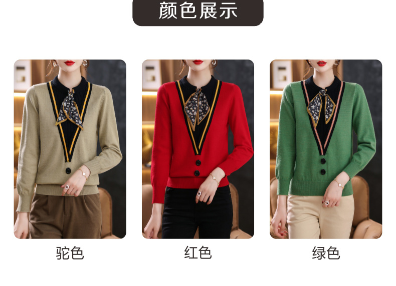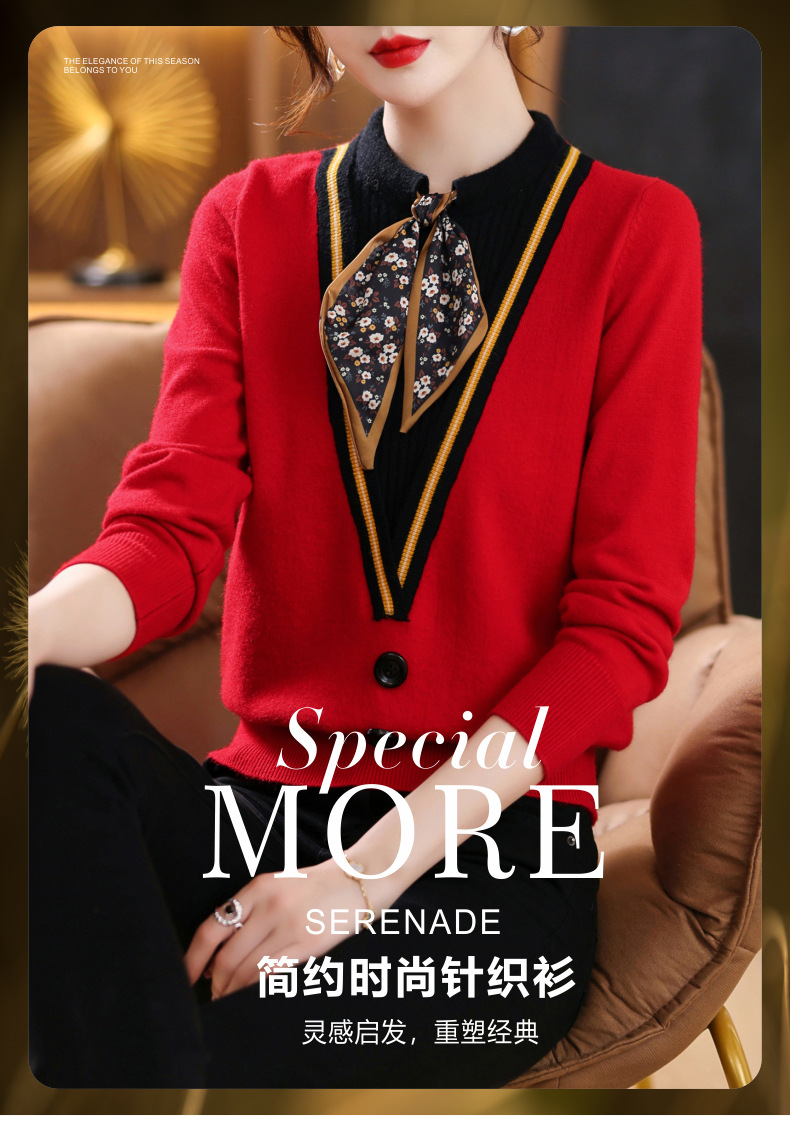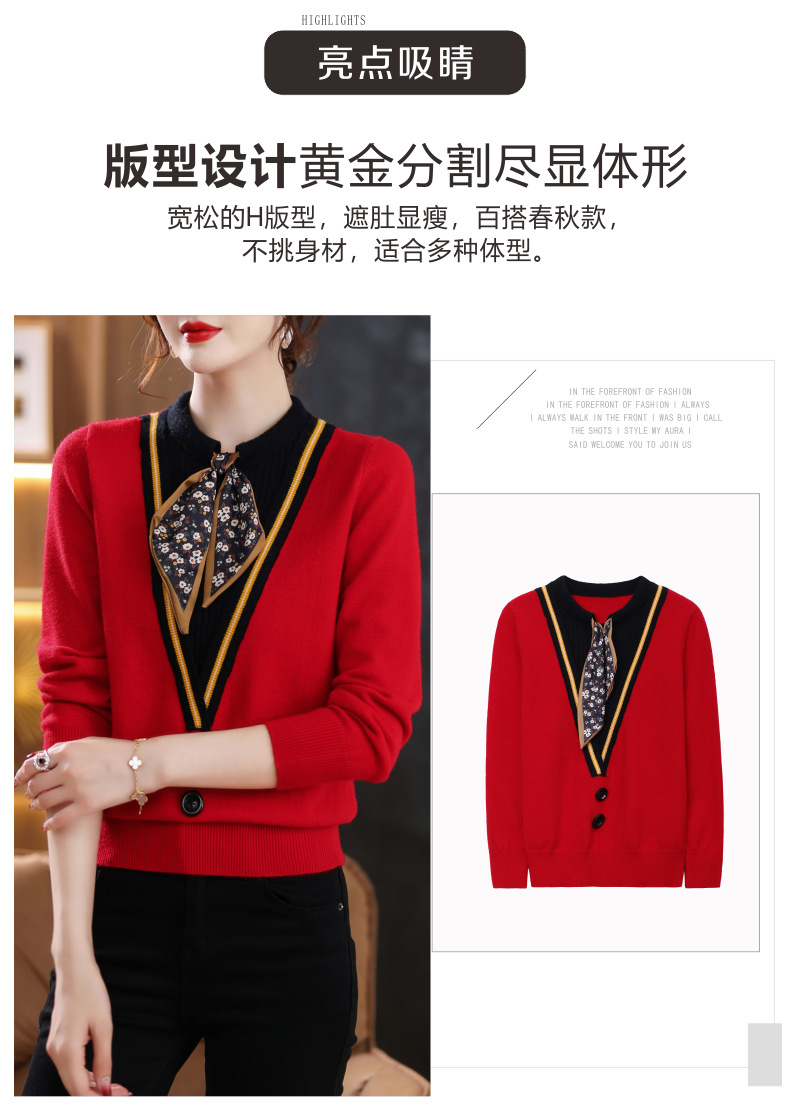 SC33-92003 假两件毛衣时尚洋气飘带针织衫2022新款秋季上衣女长袖拼色打底衫