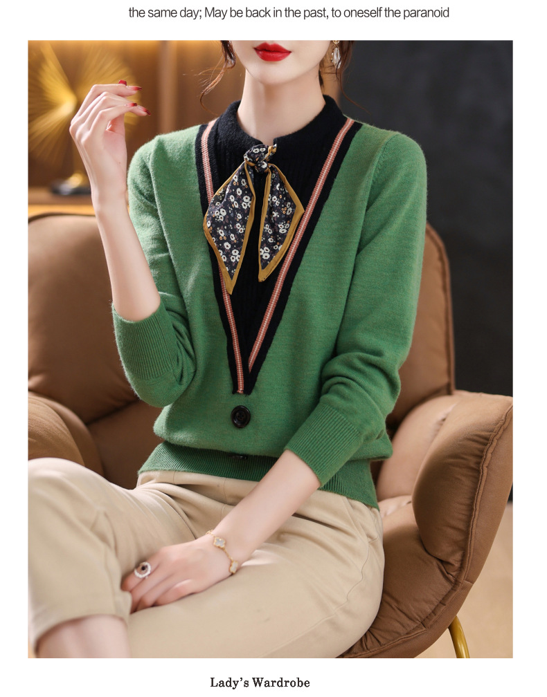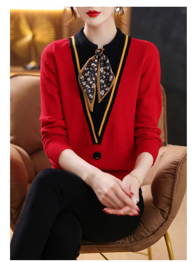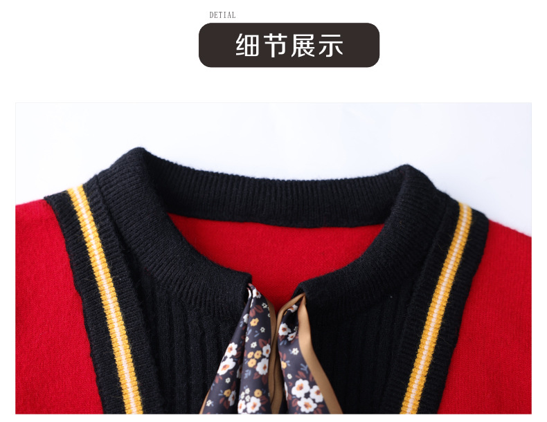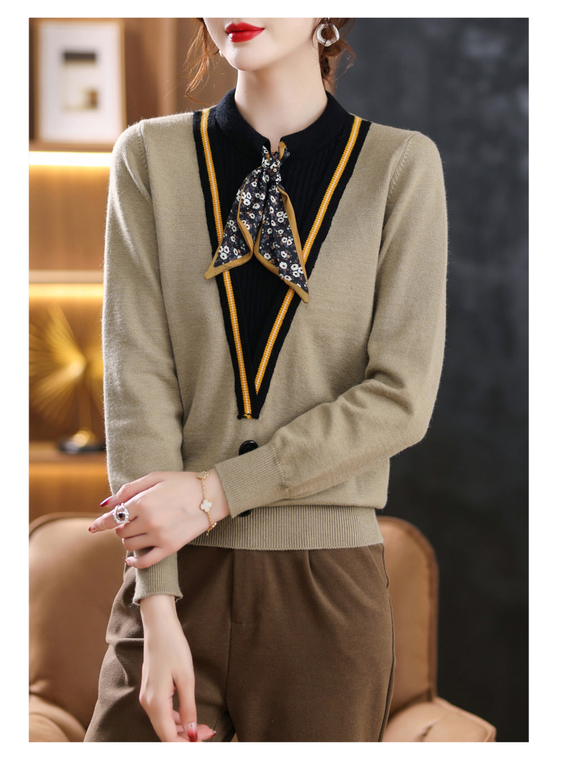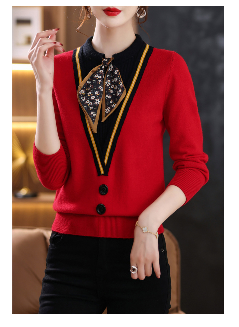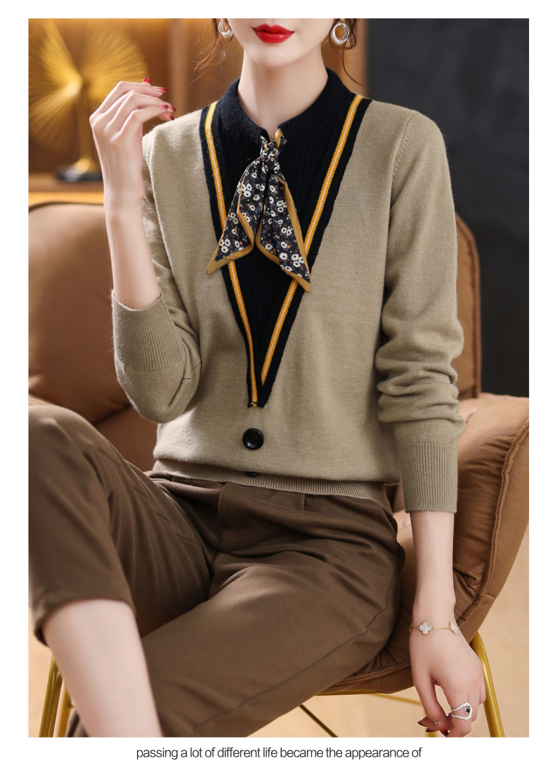 SC33-92003 假两件毛衣时尚洋气飘带针织衫2022新款秋季上衣女长袖拼色打底衫