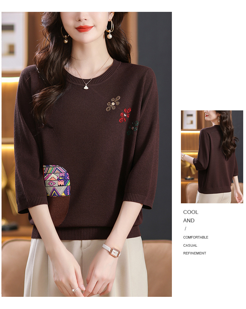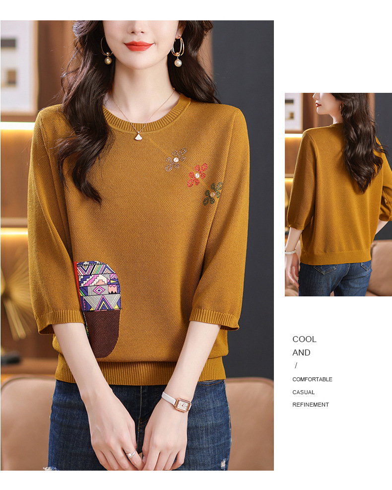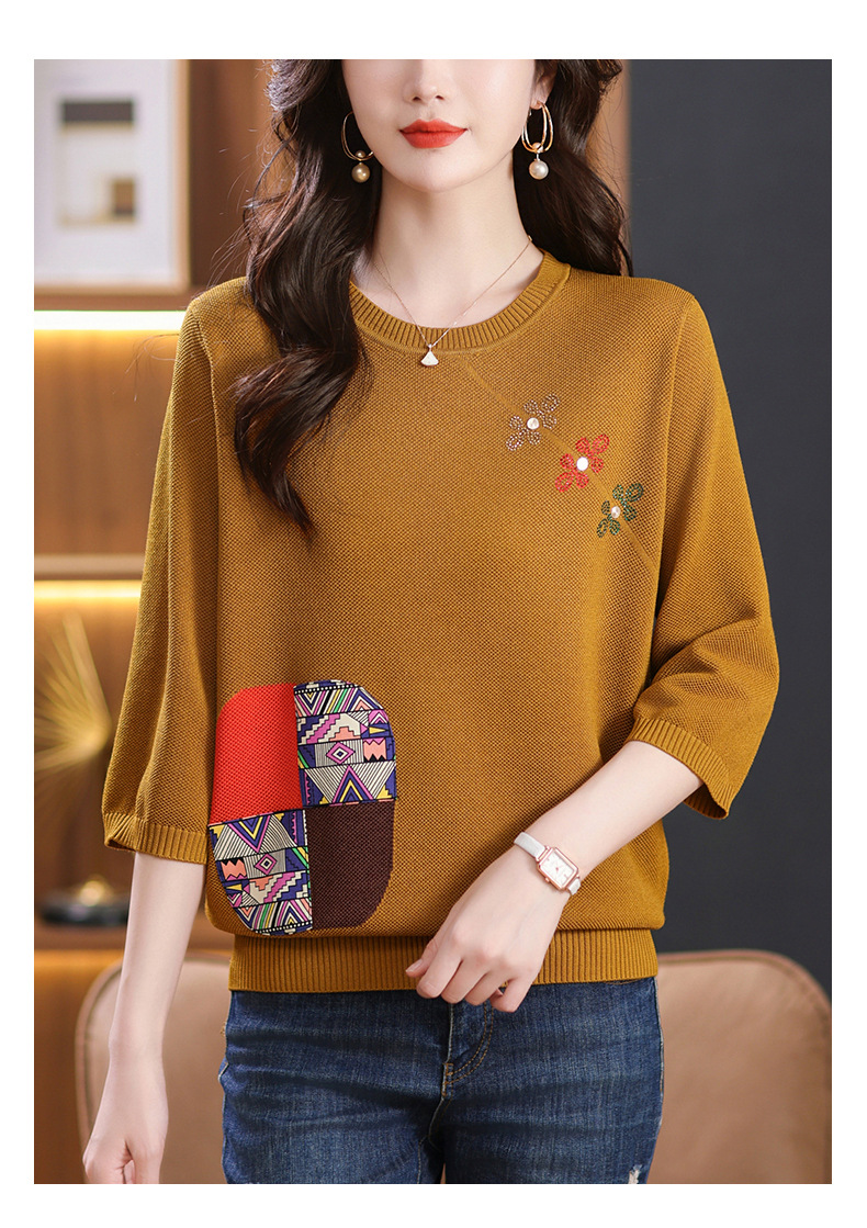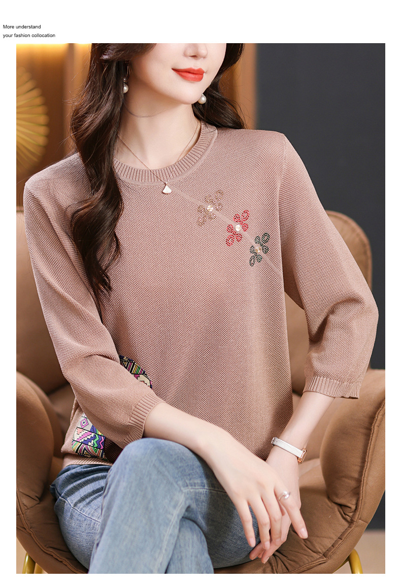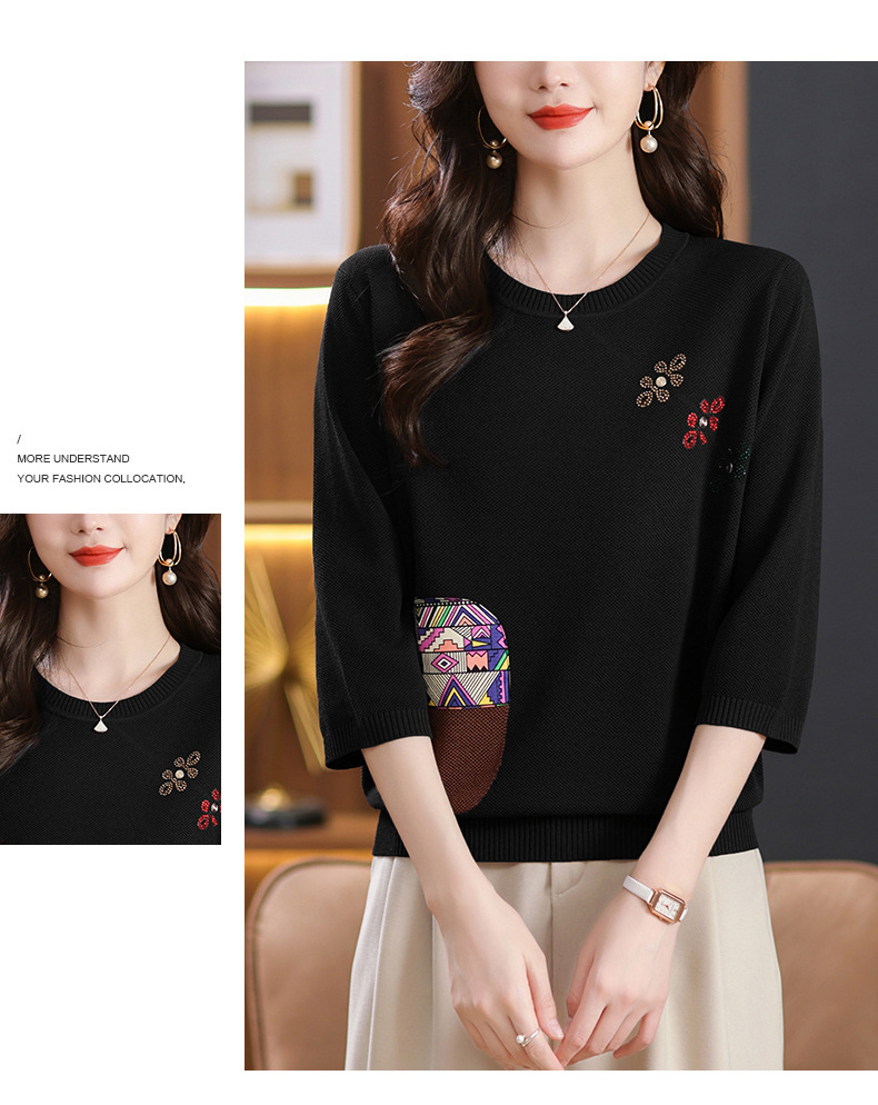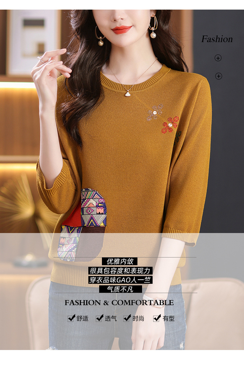 CC10-5128春装2024新款七分袖上衣冰丝针织衫百搭宽松大码印花夏天t恤