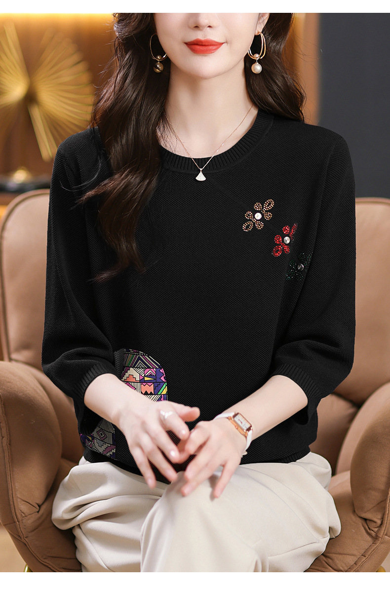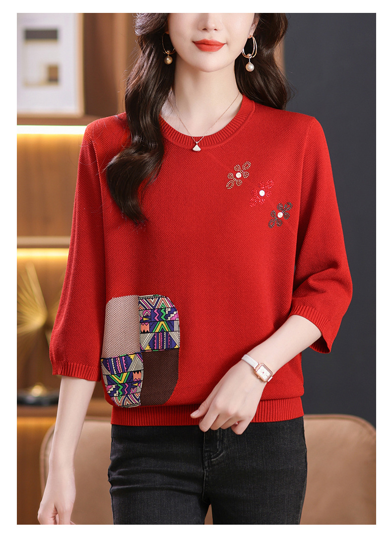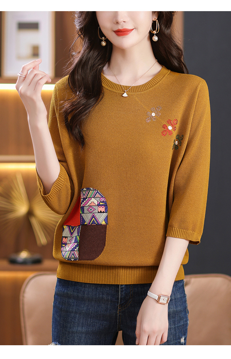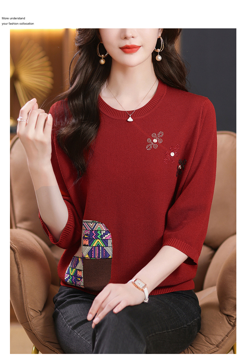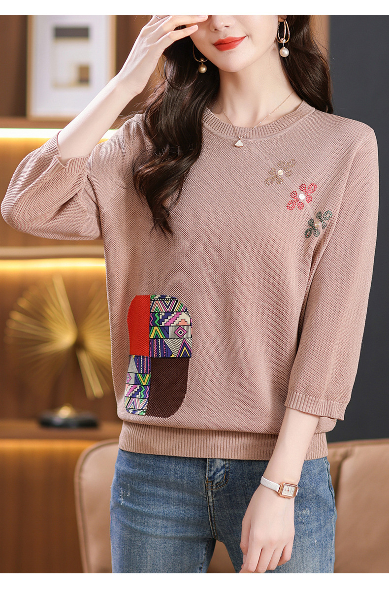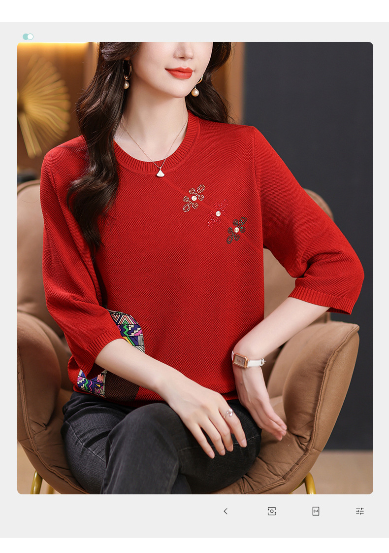 CC10-5128春装2024新款七分袖上衣冰丝针织衫百搭宽松大码印花夏天t恤