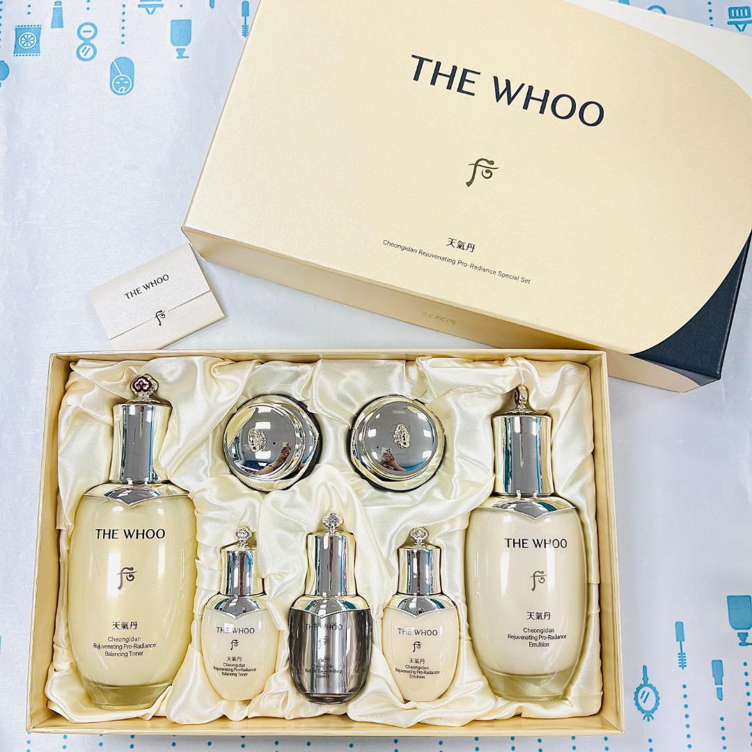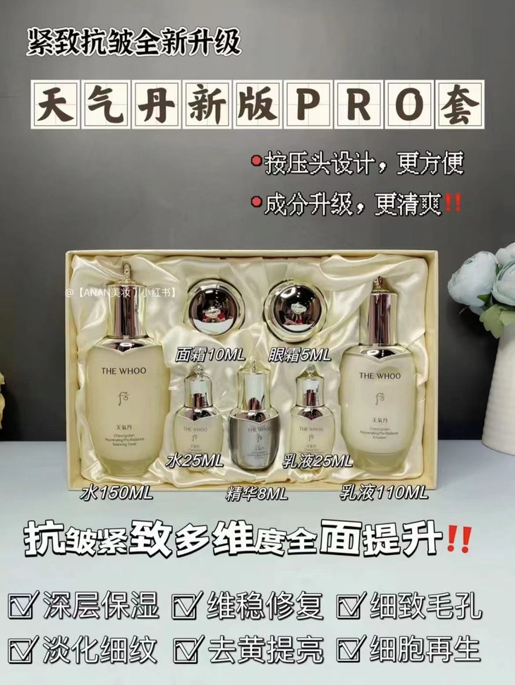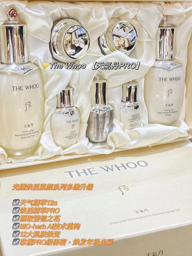 👑WHOO后天气丹PRO紧颜滋养水乳套 💥【PRO升级版】主打多效护肤,焕活修护 ✨12维度全面抗老在线,光彩抗皱! 💎根据亚洲女生肌肤的特性专门研发,灵魂成分【天气精粹12α】 🌱【自然植物精萃+前沿AI技术】能顾及到12种肌肤问题 💦质地清爽不油腻,春夏对皮肤都很nice~ 💫集于保湿补水、舒缓、修护、抗老、紧致于一身! 🎀很适合25+以上有抗老需求的熟龄肌✔️ 【套盒包括】:水(150ml+25ml)+乳(110ml+25ml)+面霜10ml+精华8ml+眼霜5ml