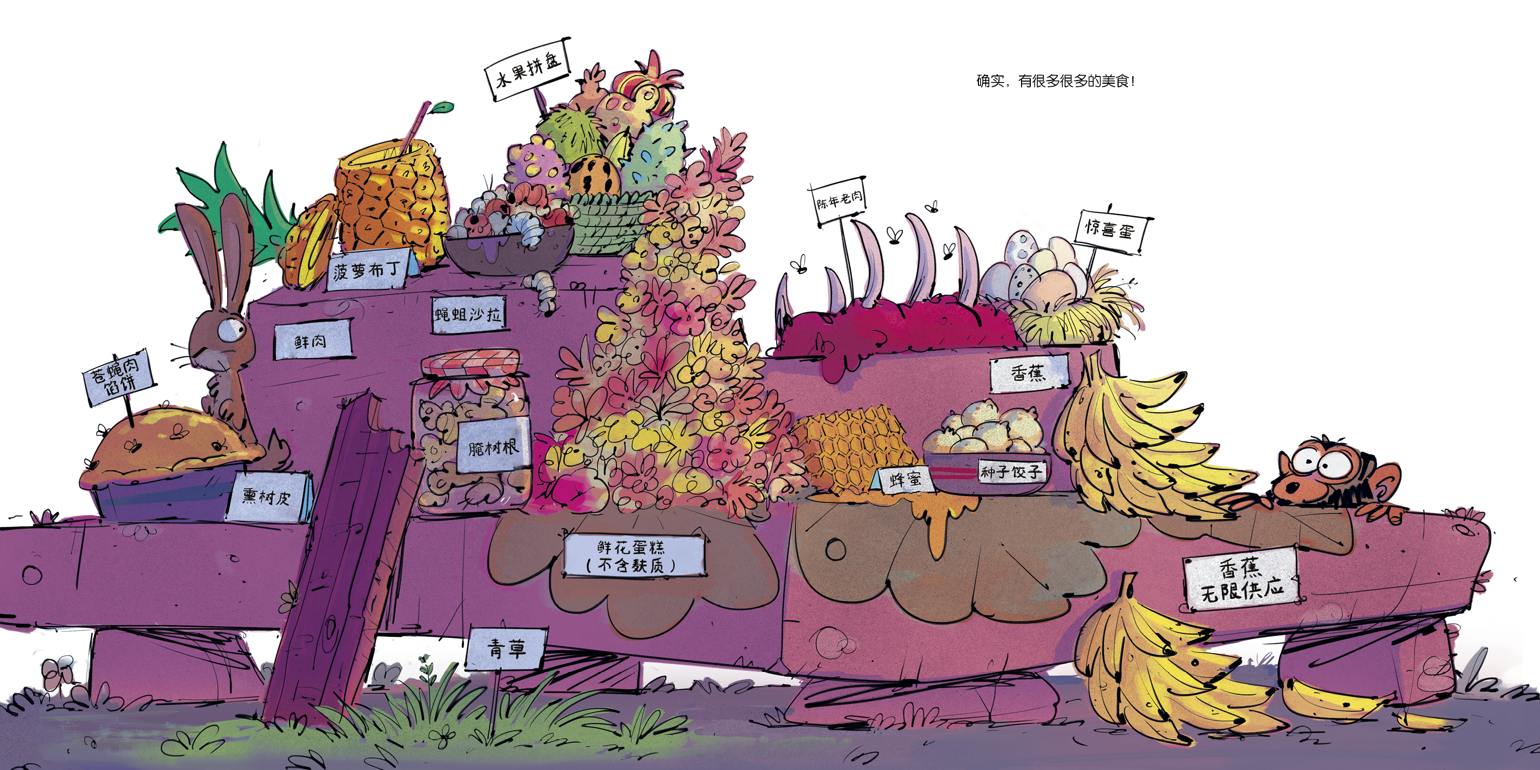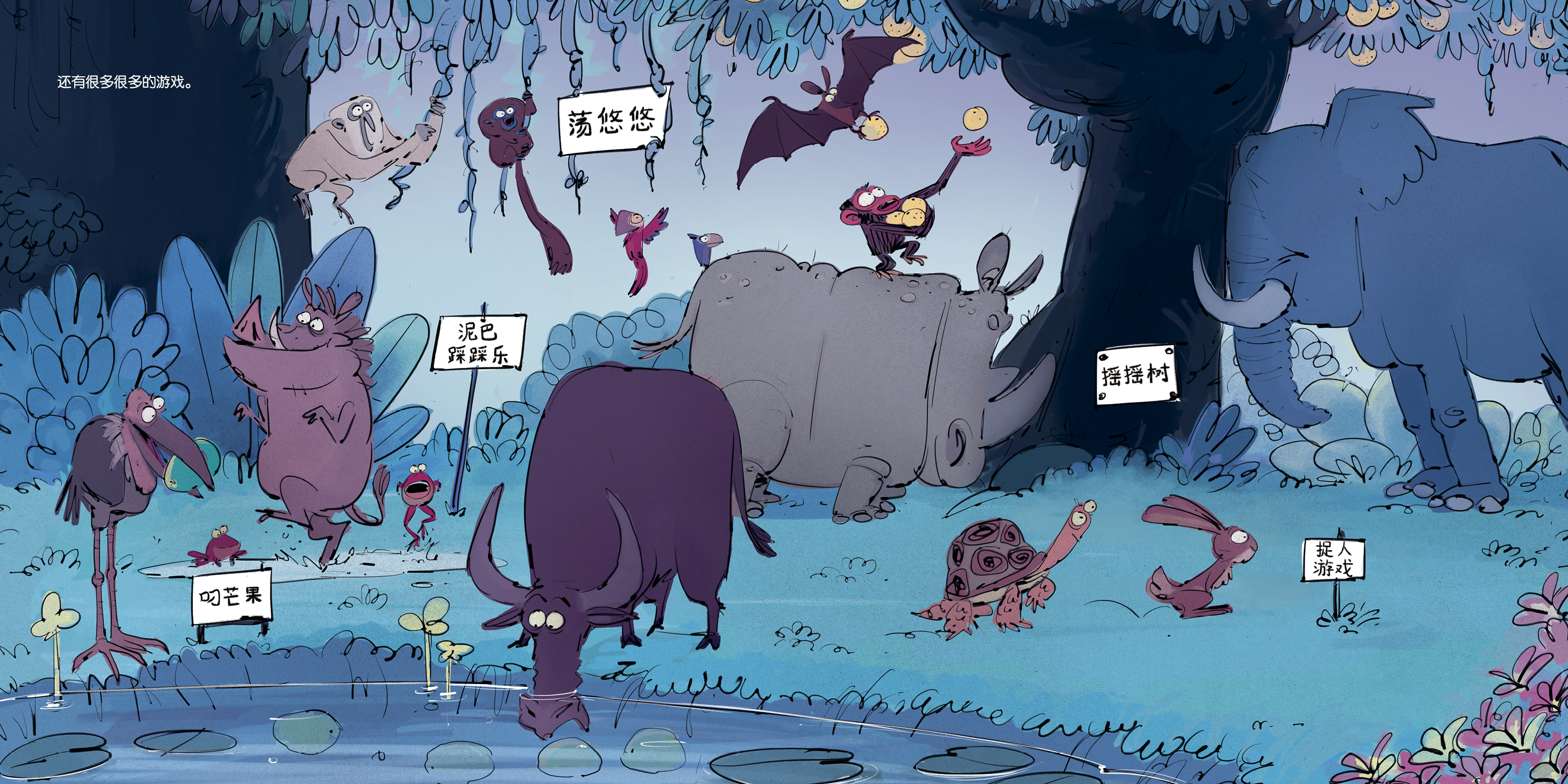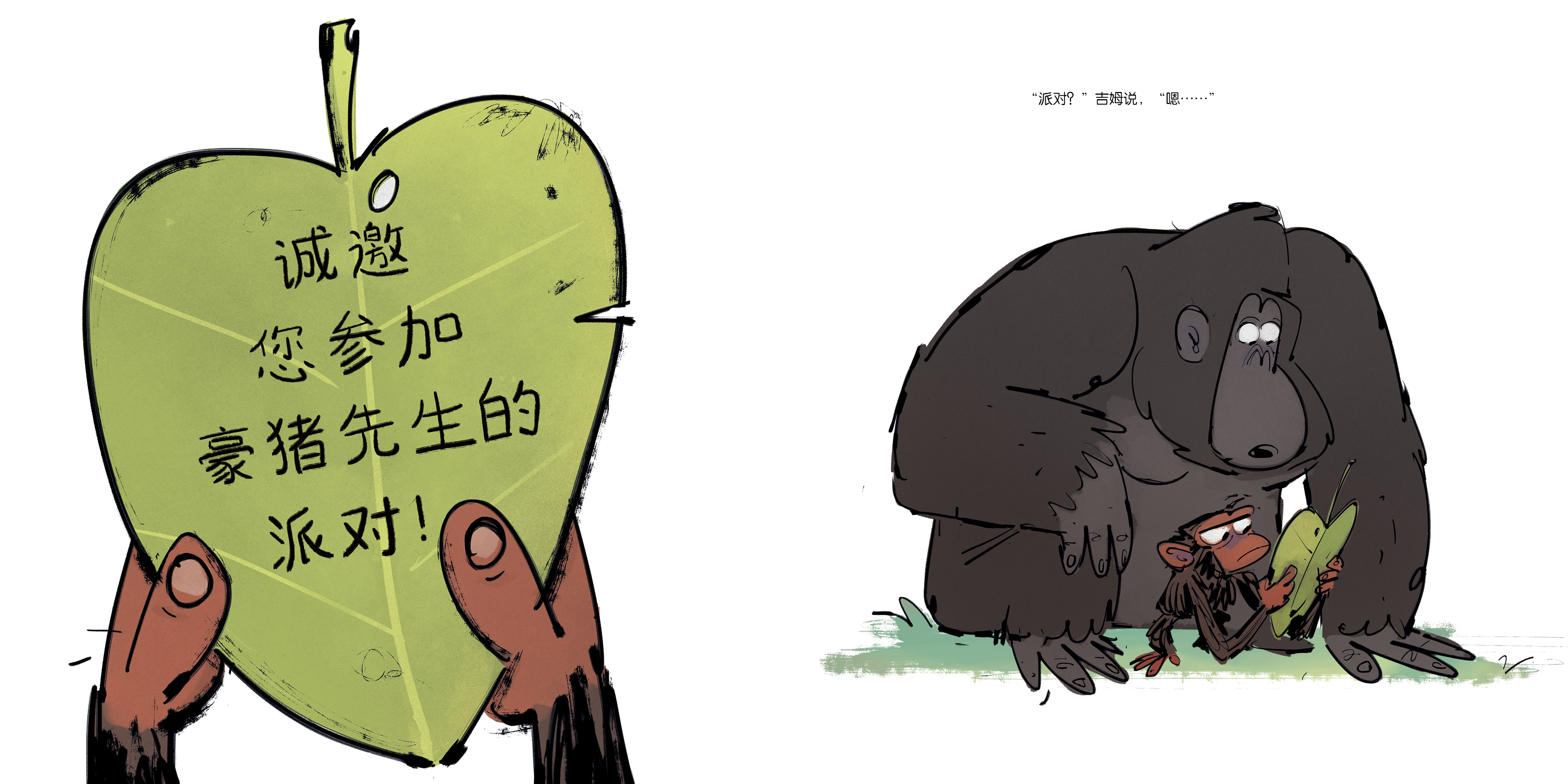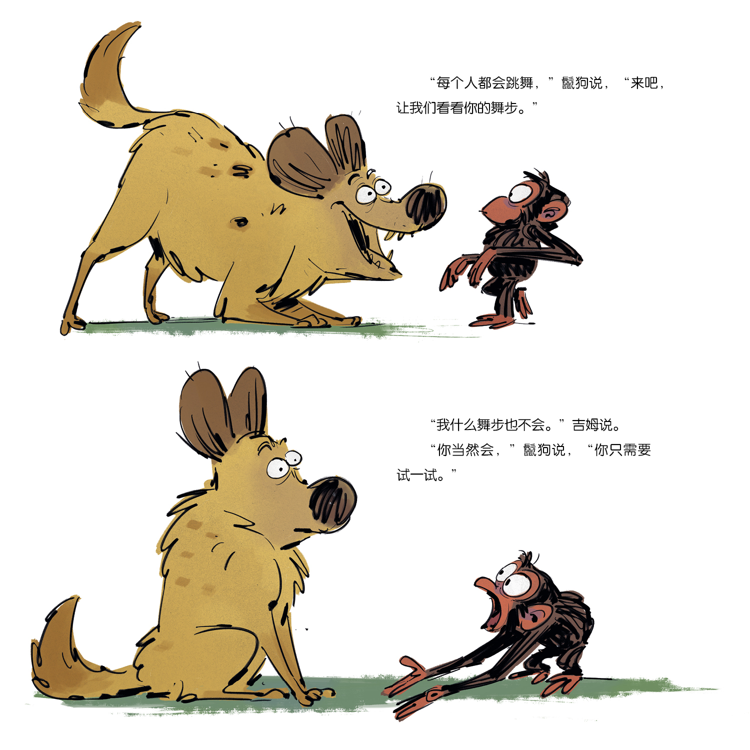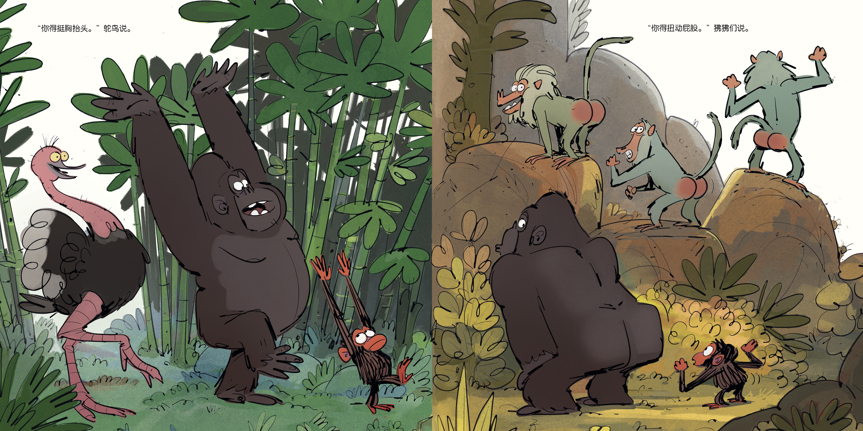 本书内含拉页,宽幅画面把动物们的“大齐舞”场面和心烦的猴子吉姆感受到的压迫感表现得更完整。