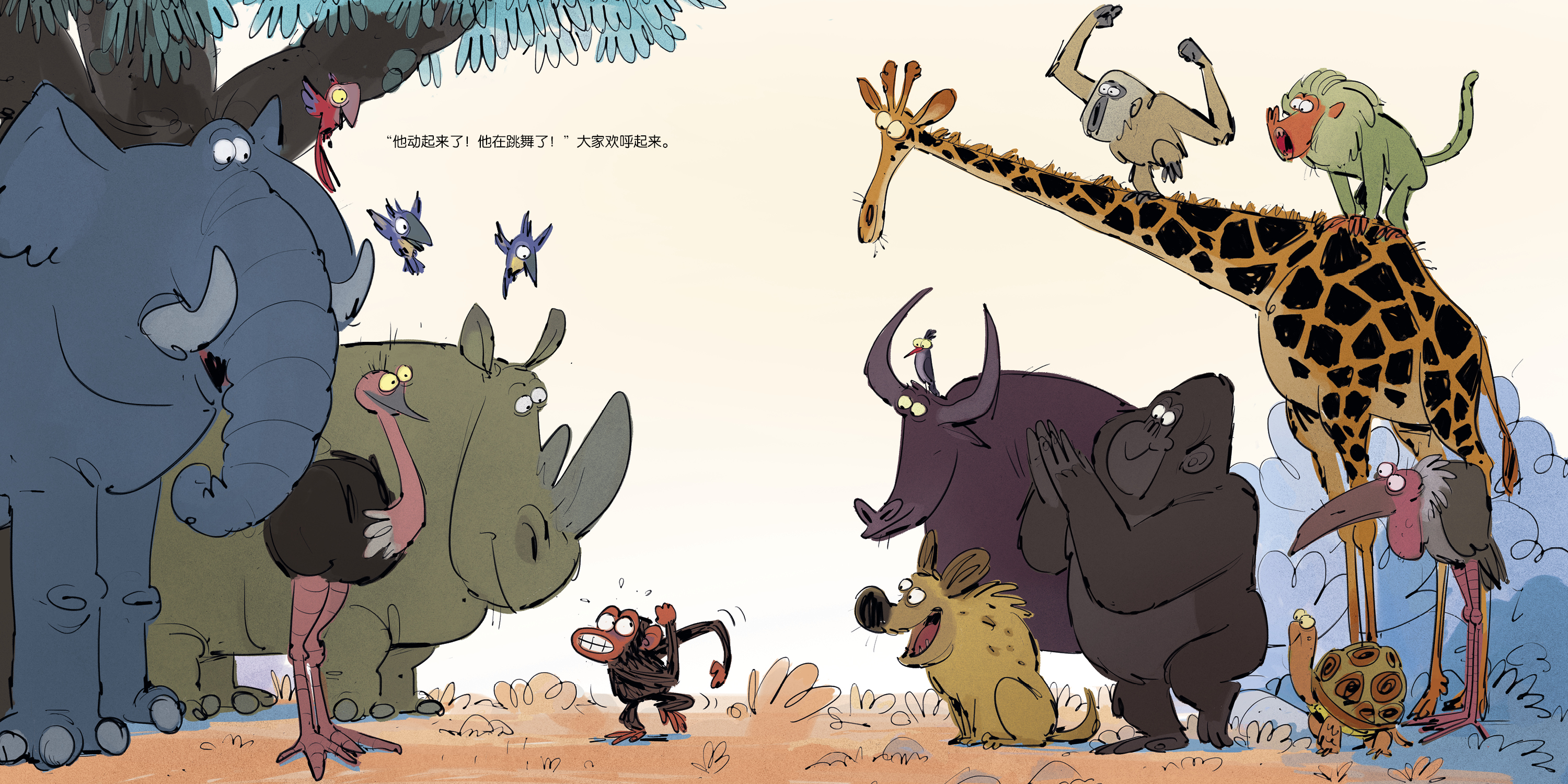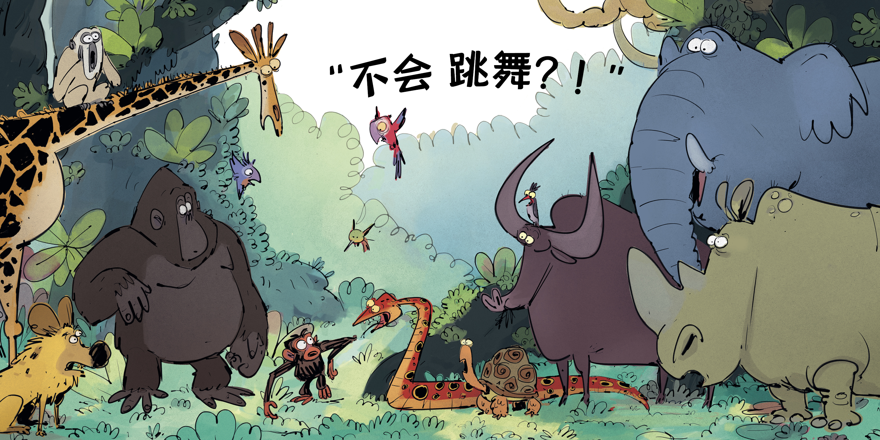心烦的猴子吉姆收到了一张派对请柬,可是他不想去,因为他不会跳舞。朋友们很惊讶,蜥蜴、鸵鸟和狒狒们教他感受节拍、挺胸抬头、扭动屁股。就这样,吉姆被大家带到了派对现场,还被团团围住、摇晃、旋转。终于,他再也无法忍受……