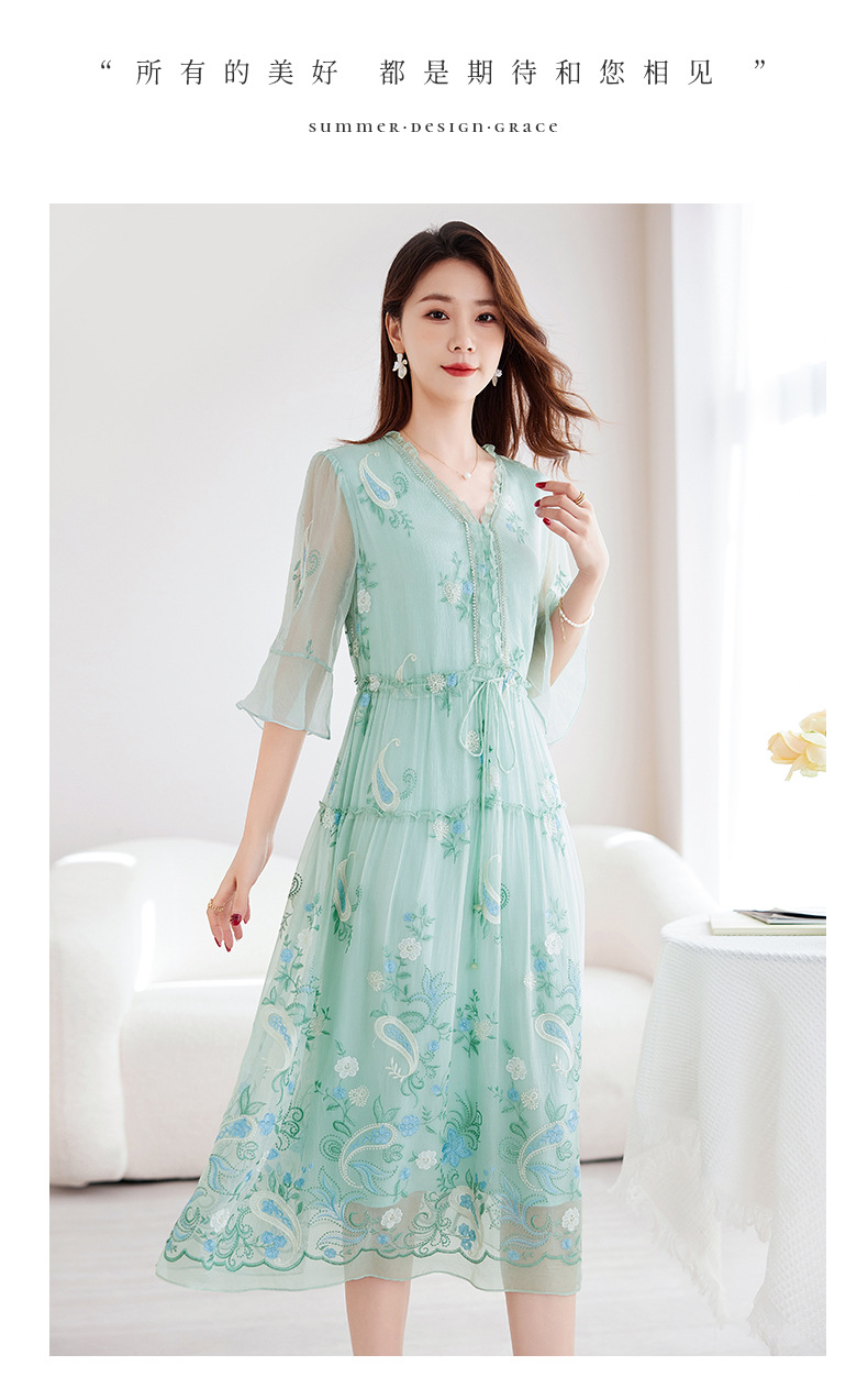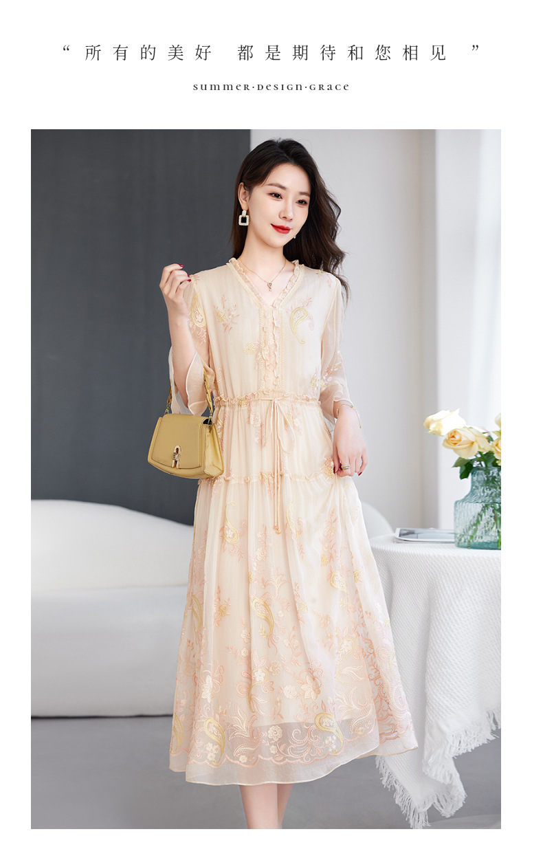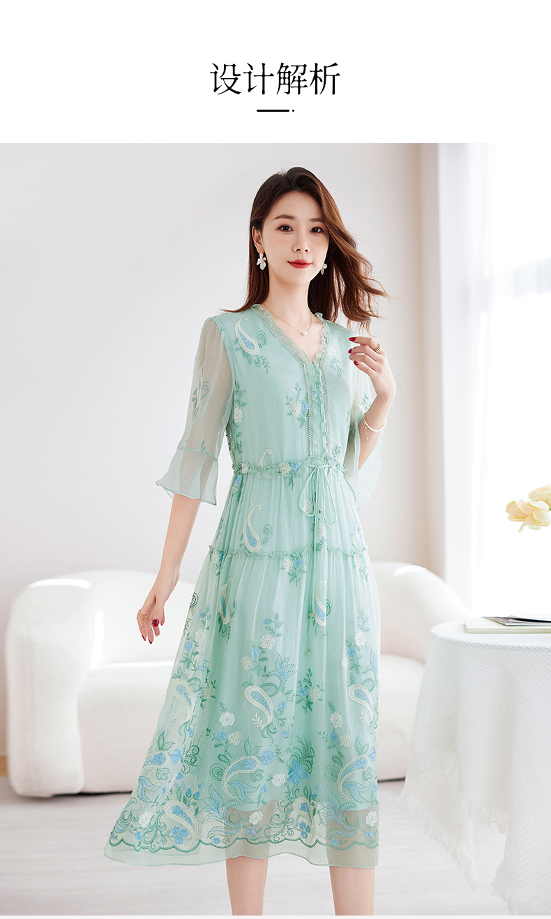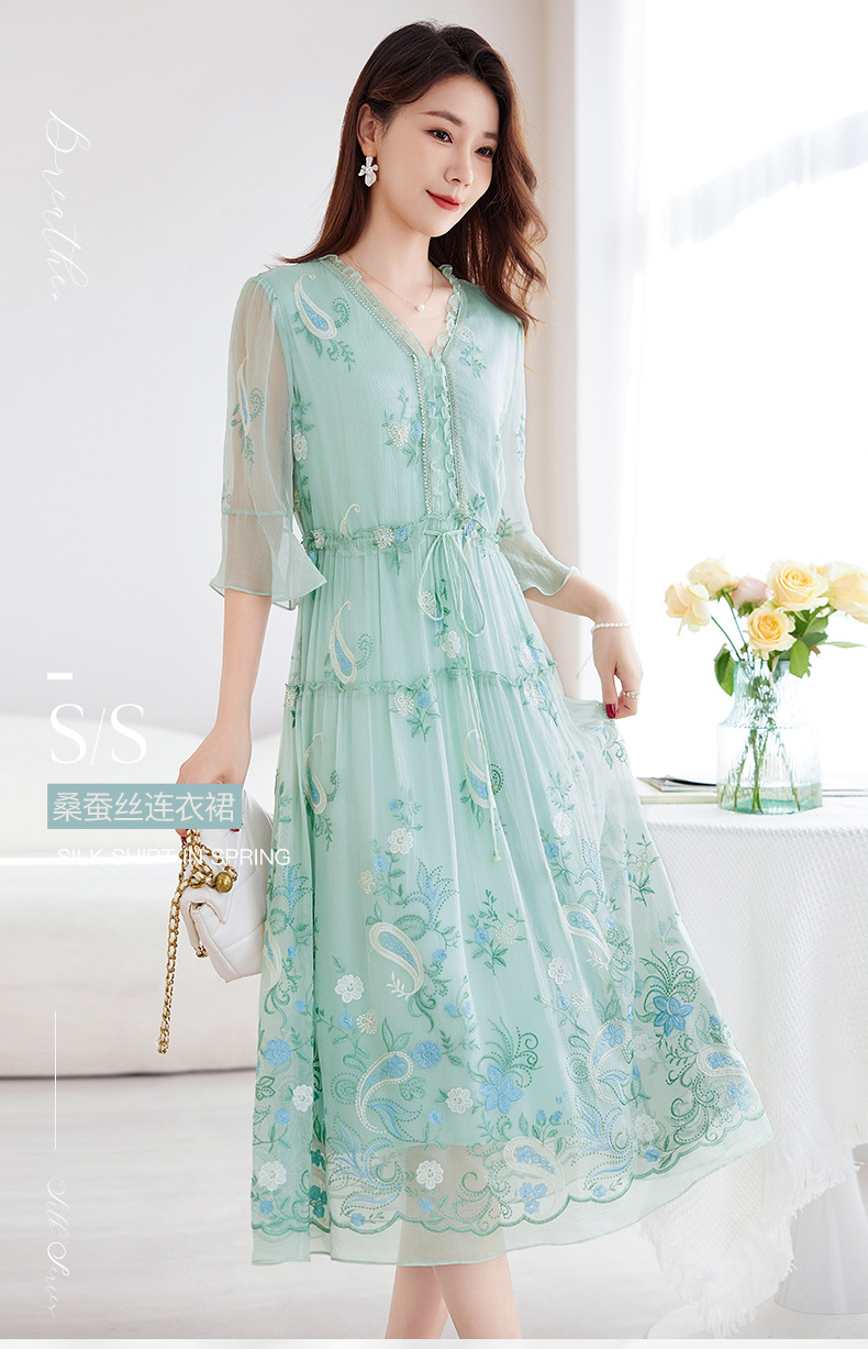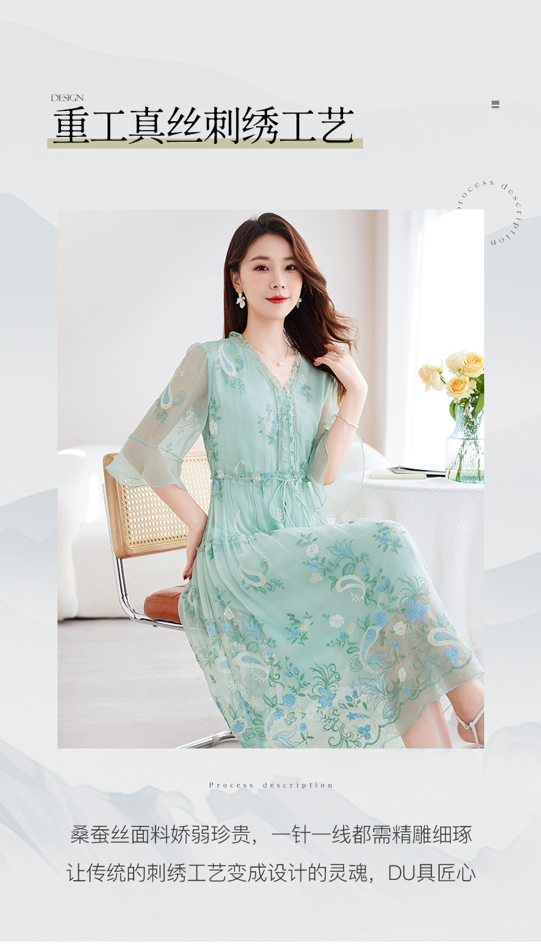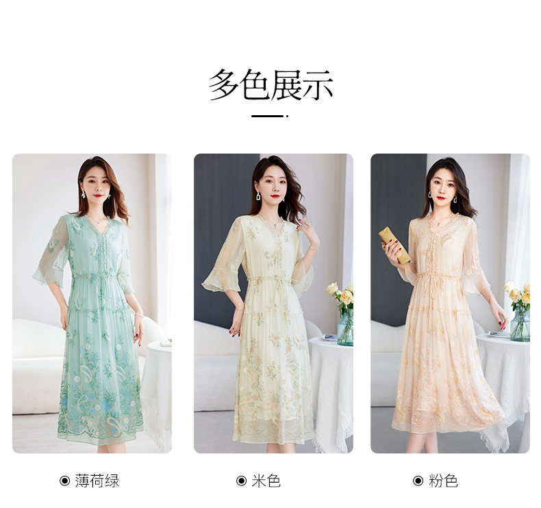 QS-82599168丝韵天香 真丝源头工厂 桑蚕丝连衣裙宽松中大淑绣花连衣裙女9168