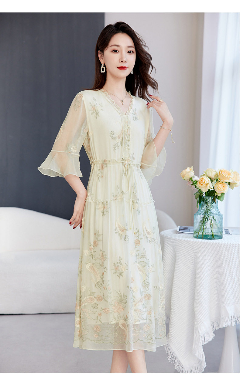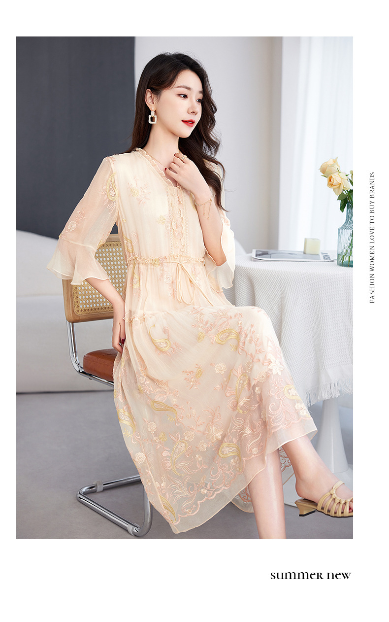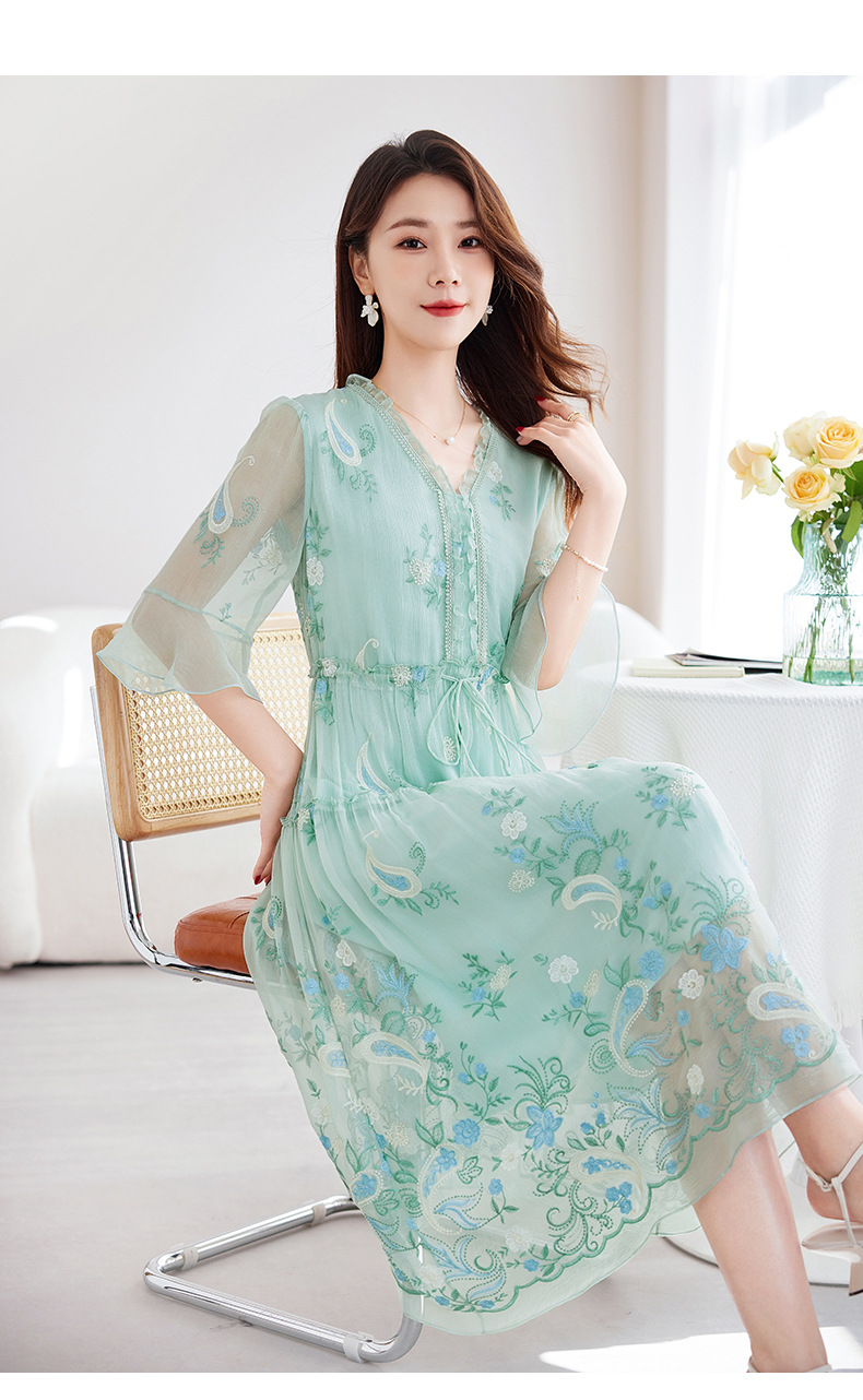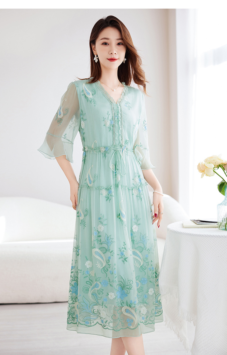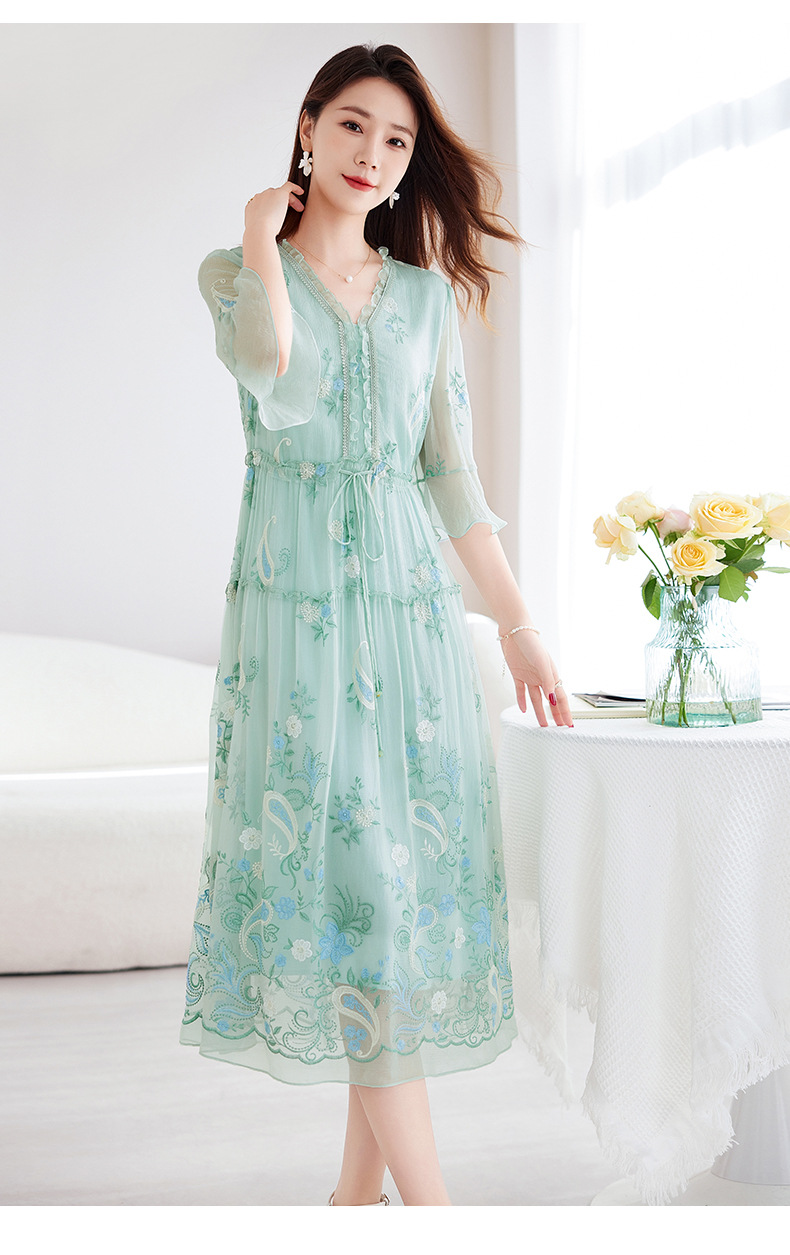 QS-82599168丝韵天香 真丝源头工厂 桑蚕丝连衣裙宽松中大淑绣花连衣裙女9168