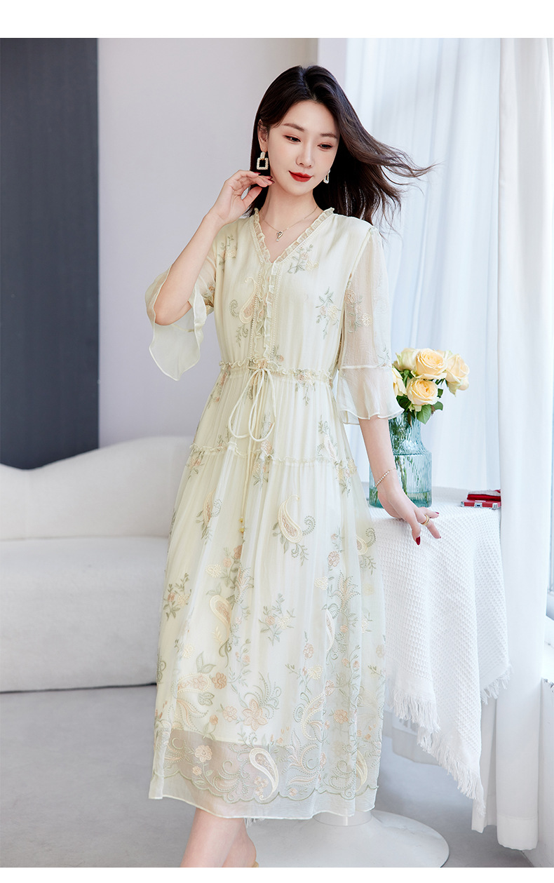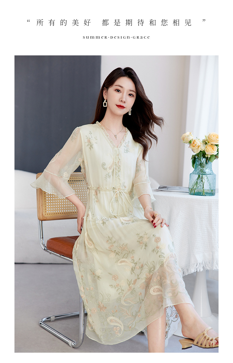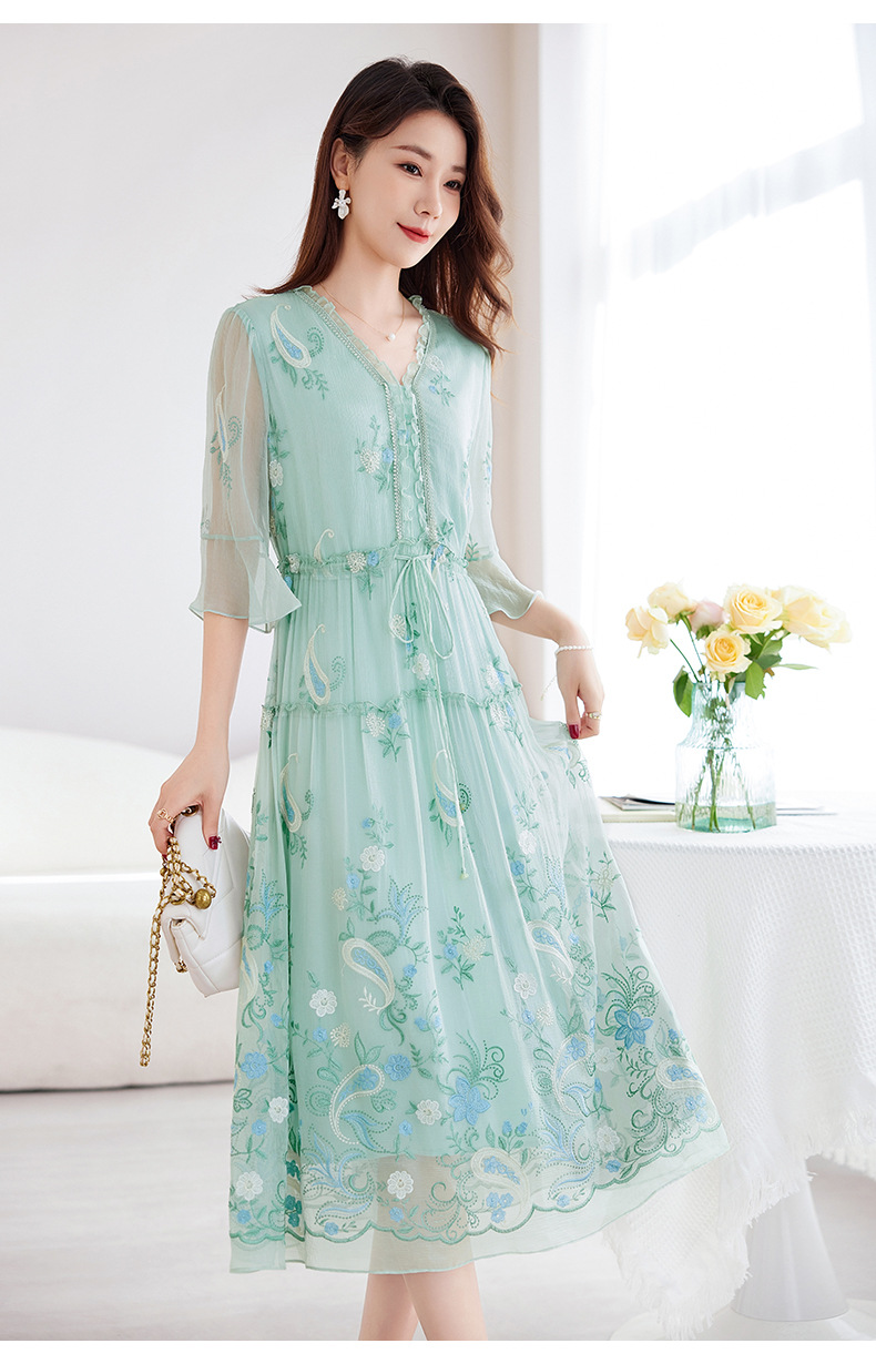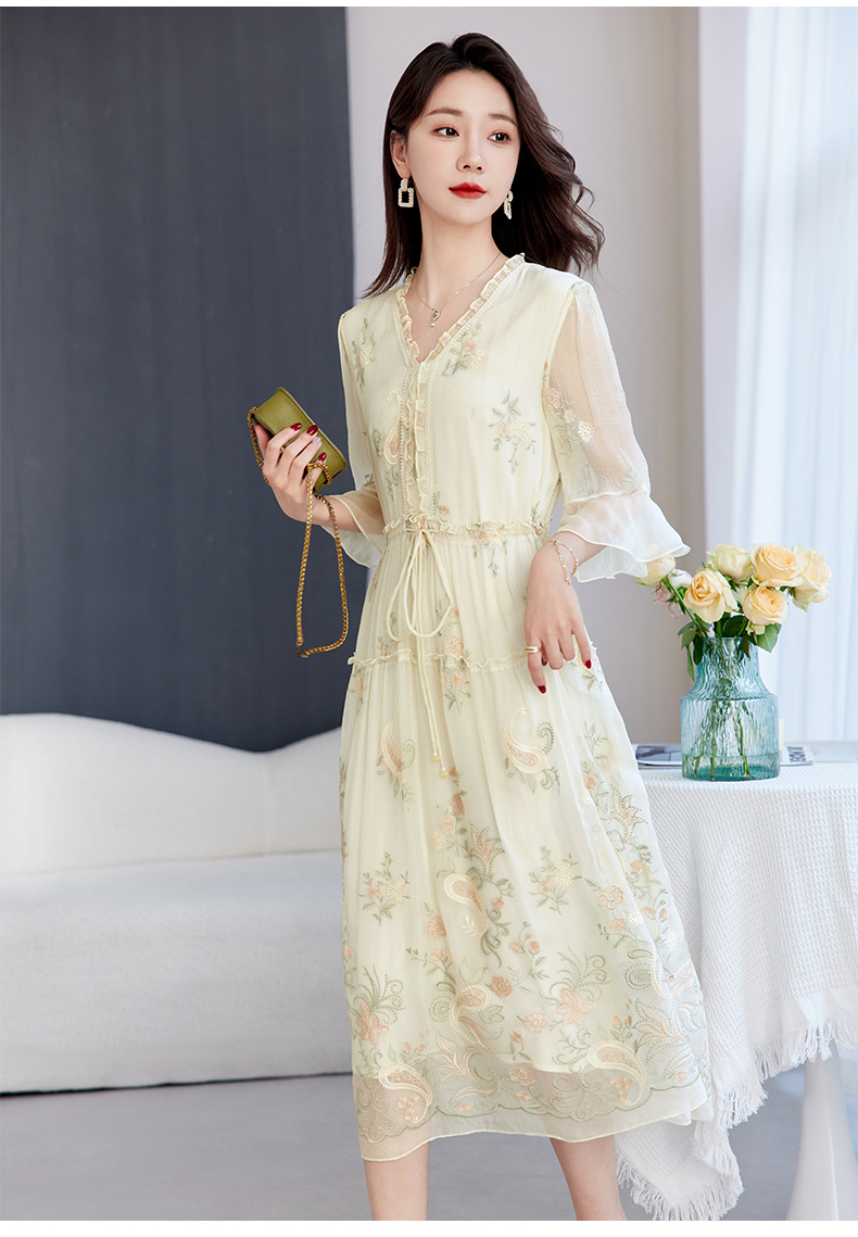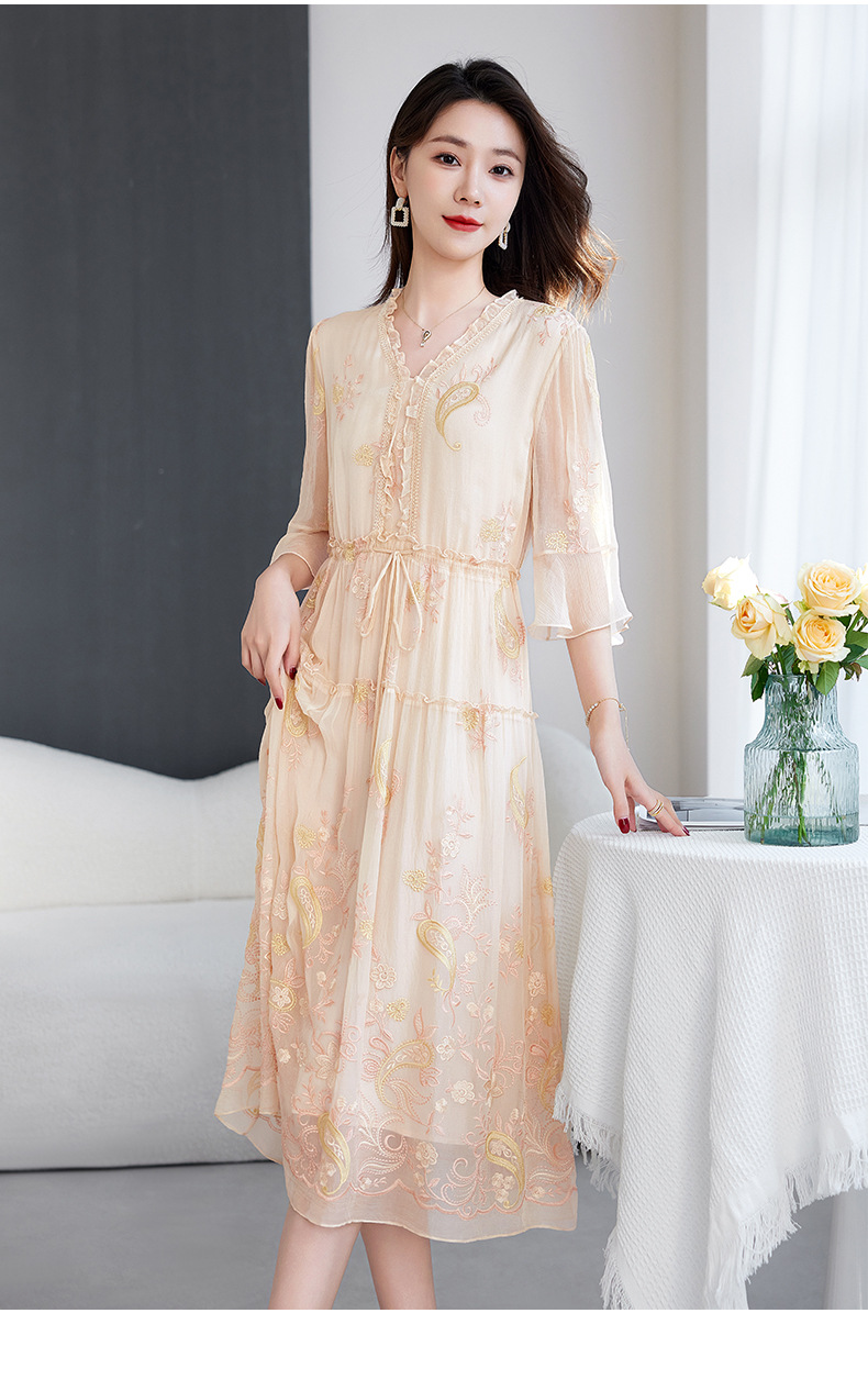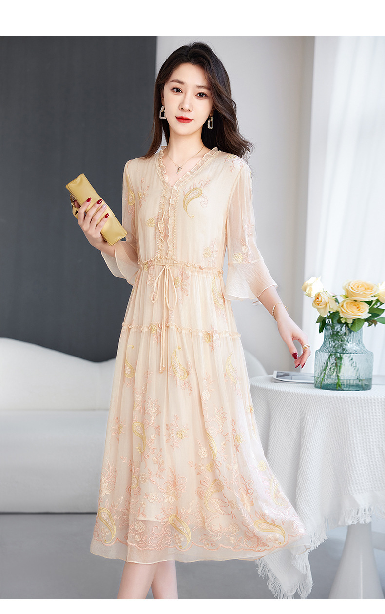 QS-82599168丝韵天香 真丝源头工厂 桑蚕丝连衣裙宽松中大淑绣花连衣裙女9168