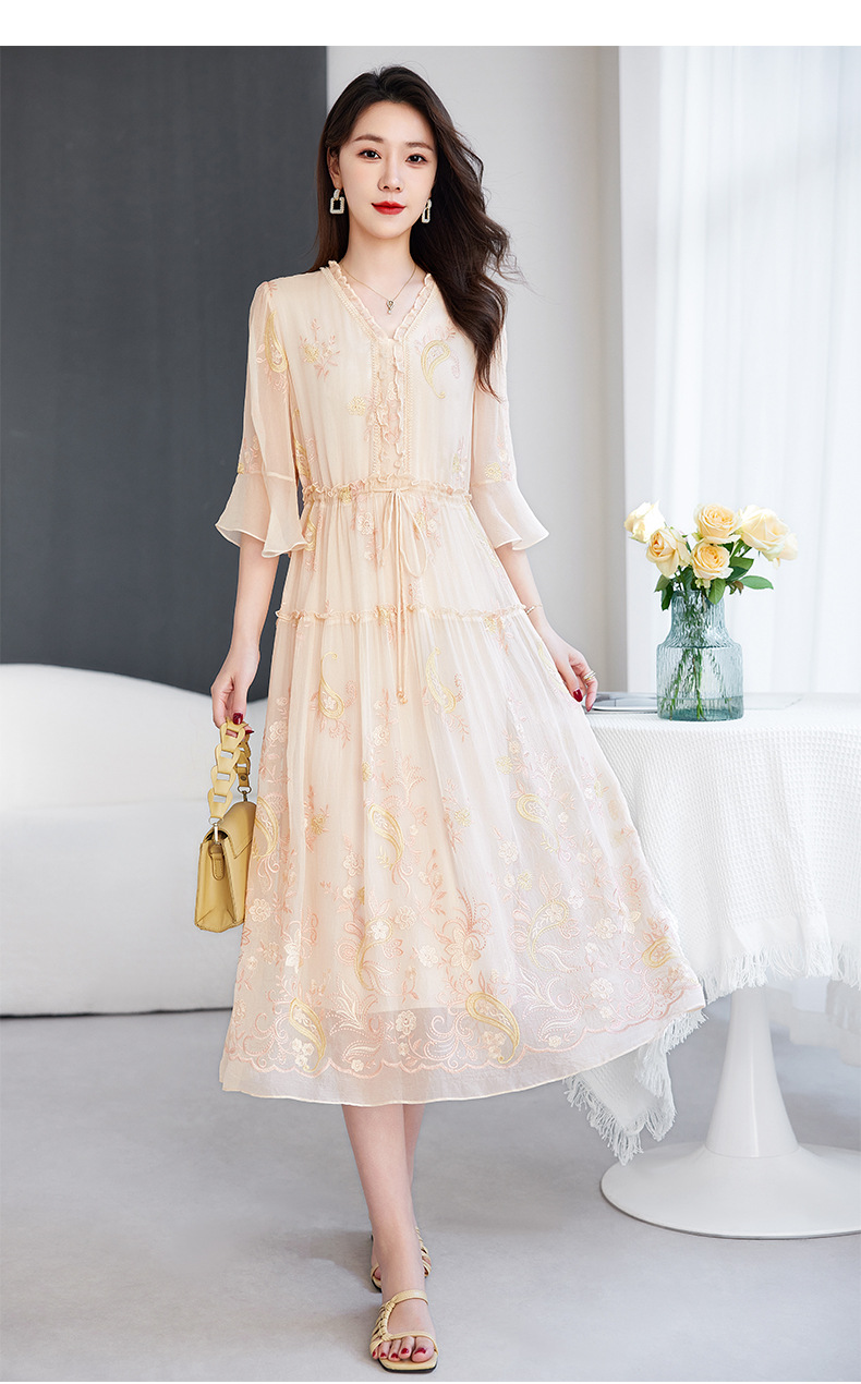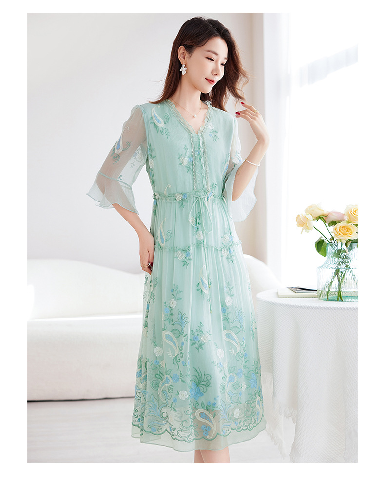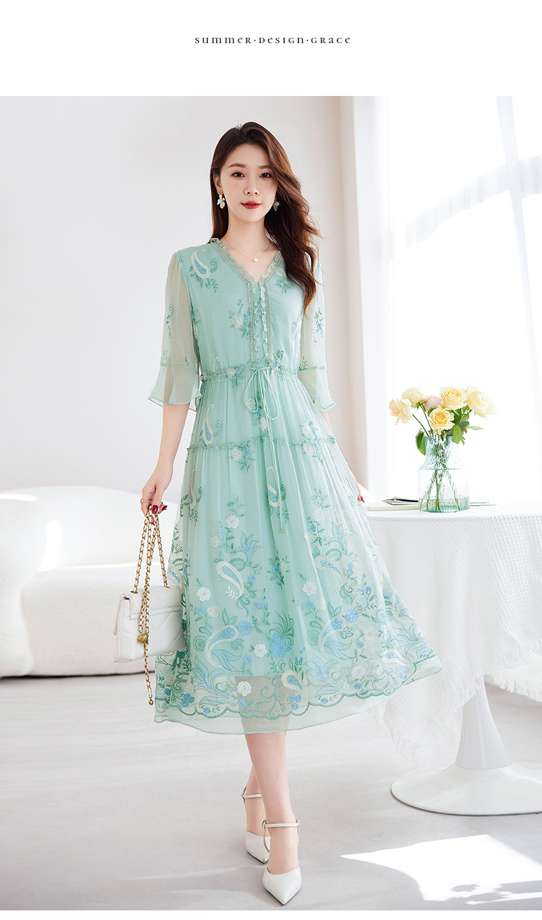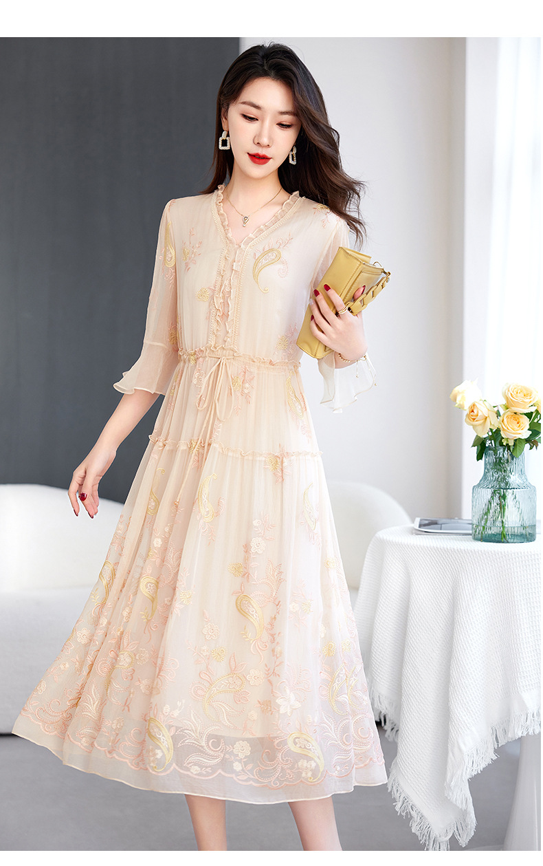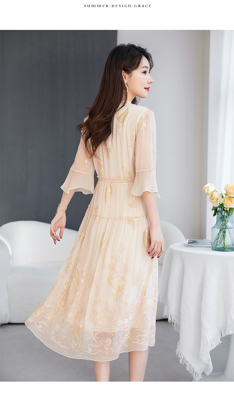 QS-82599168丝韵天香 真丝源头工厂 桑蚕丝连衣裙宽松中大淑绣花连衣裙女9168