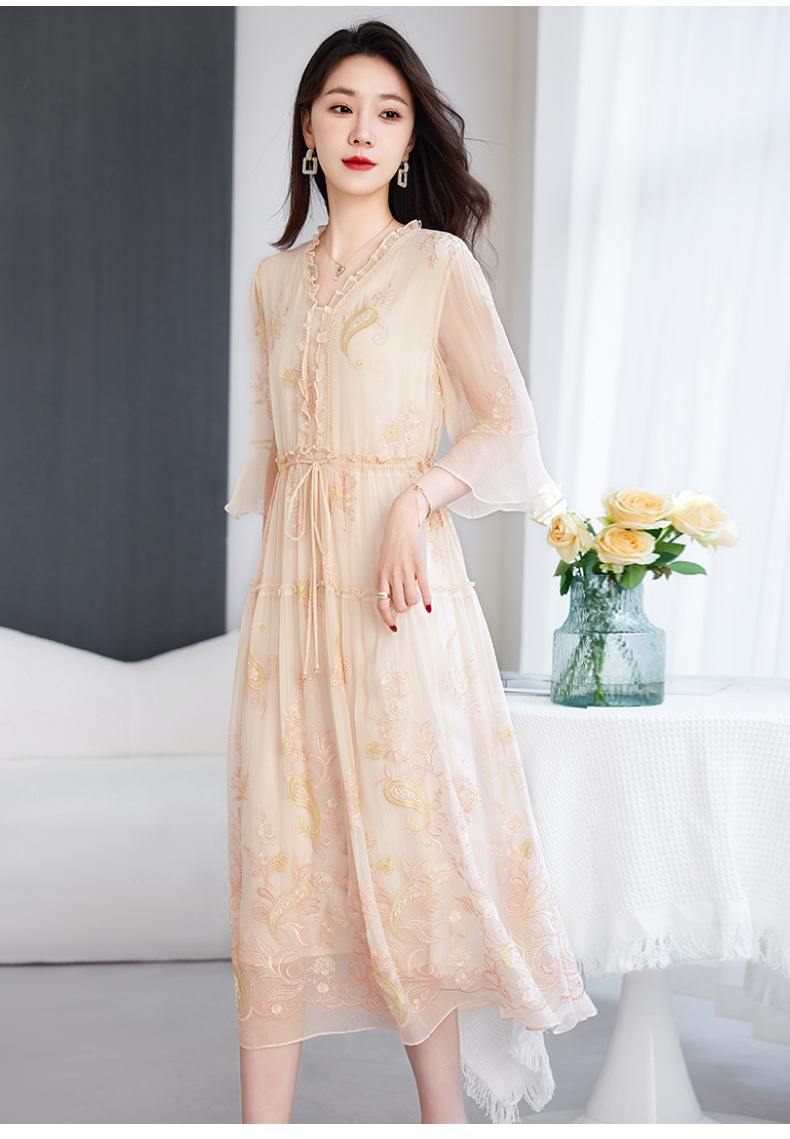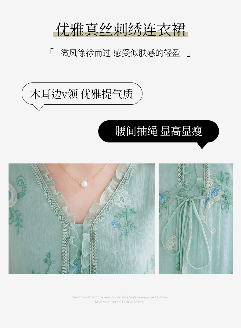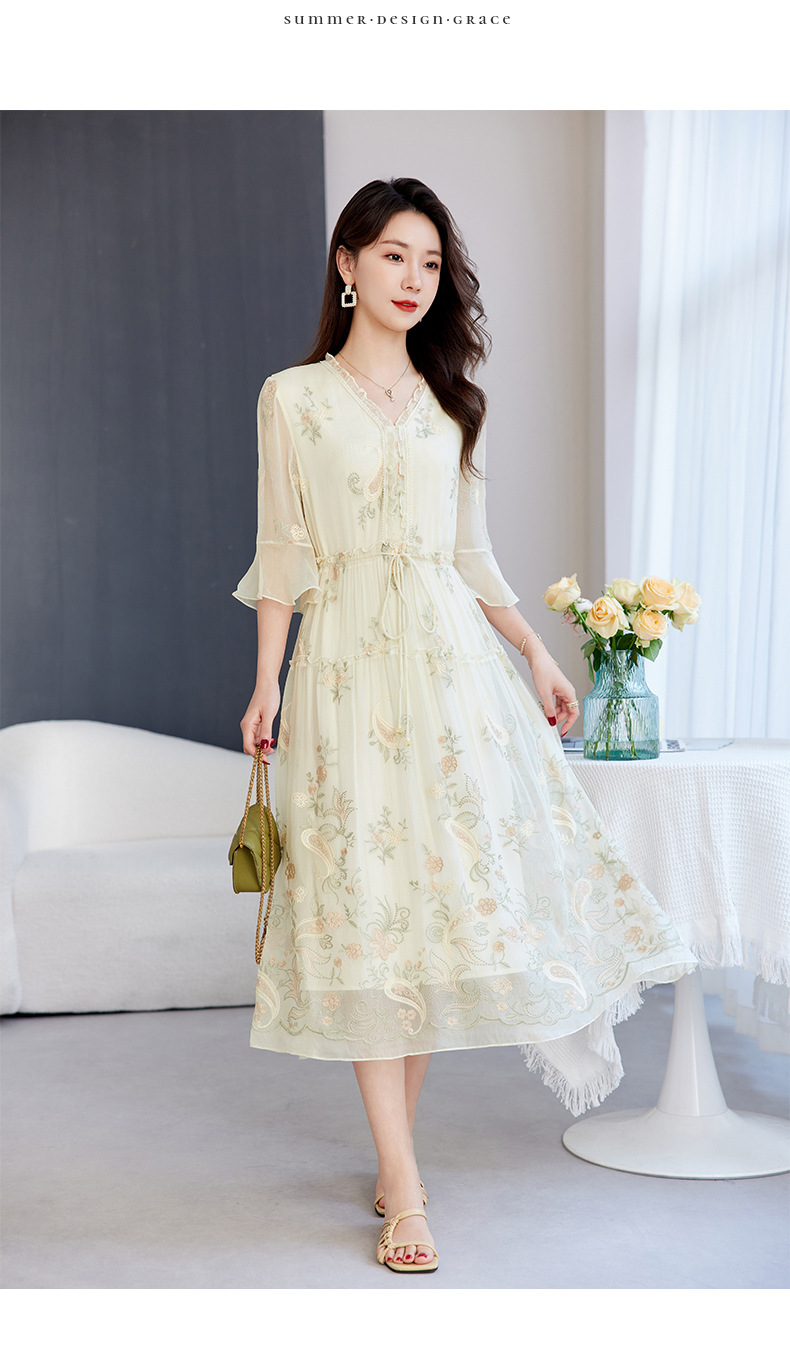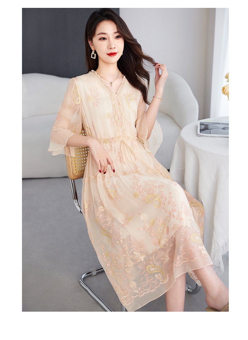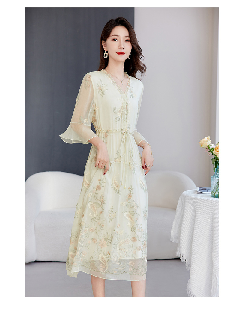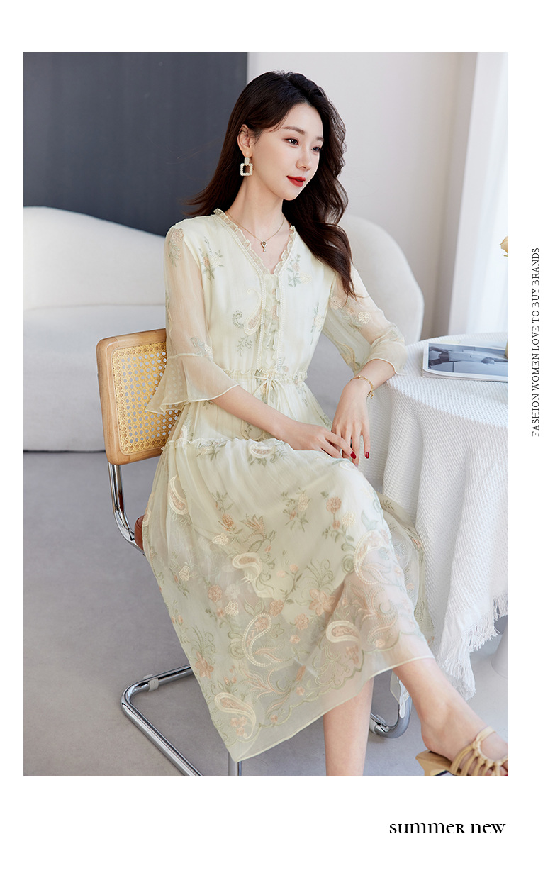 QS-82599168丝韵天香 真丝源头工厂 桑蚕丝连衣裙宽松中大淑绣花连衣裙女9168