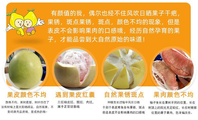 5.关于口感:柚子刚摘,来自果树的营养突然断供,这时吃口感不是最佳,好吃的柚子需要时间的酝酿,将柚子包装全部撒掉,放于阴凉通风处,果皮水分逐渐蒸发后,果皮开始皱缩,此过程称为“辞水”,大约5~7天时间,此时果肉细嫩柔软多汁,糖分沉淀,甜度更佳!属于正常范围不在售后范围内。
