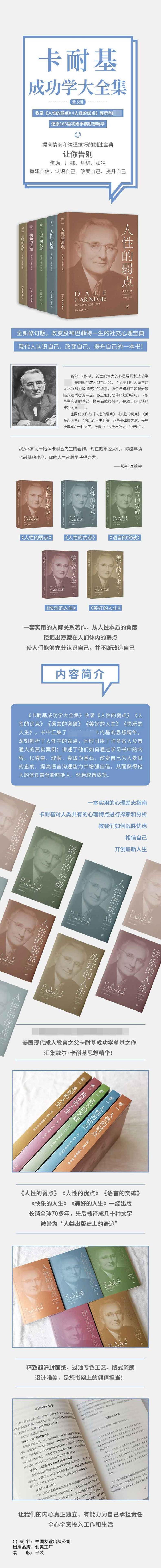 9.《人性的弱点》《人性的优点》《语言的突破》《快乐的人生》《美好的人生》一经出版,长销全球70多年,先后被译成几十种文字,被誉为“人类出版史上的奇迹”