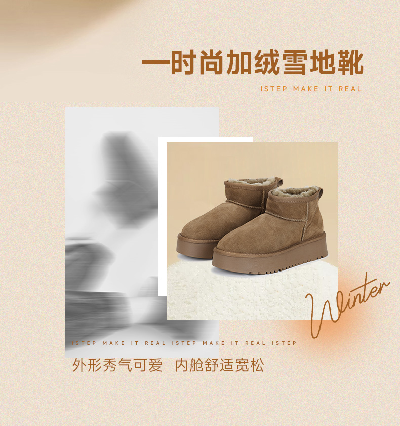 istep冬季保暖舒适厚底棉鞋加绒加厚短筒女士羊毛雪地靴