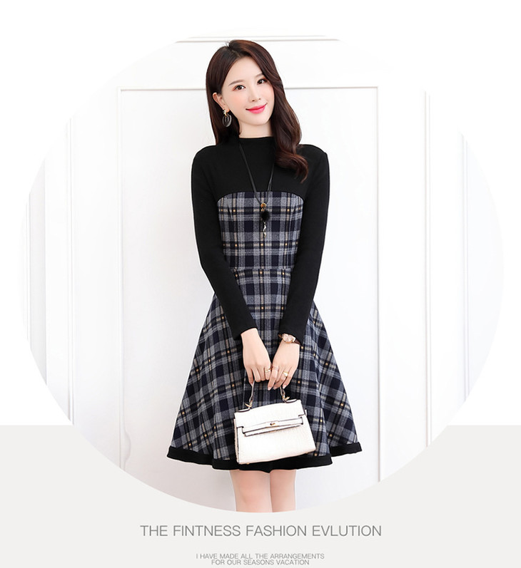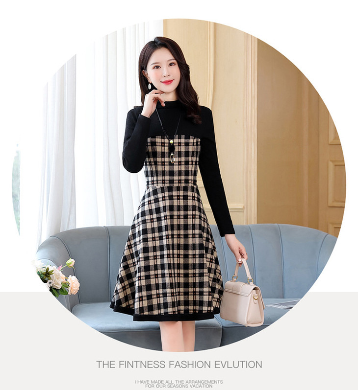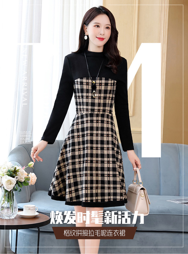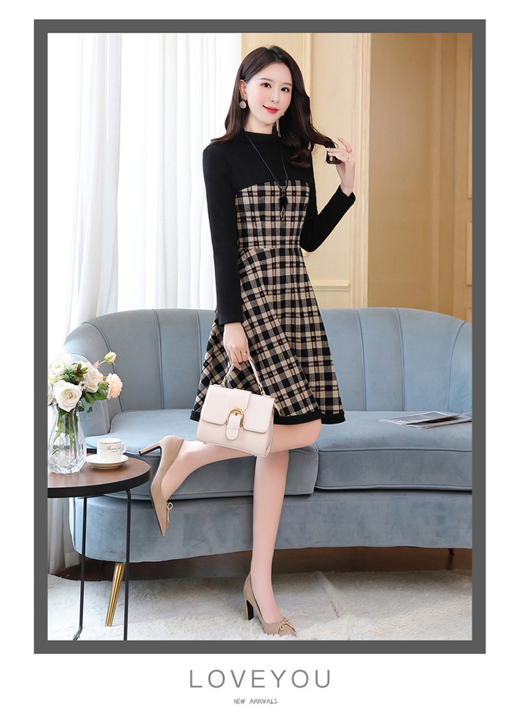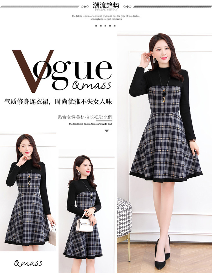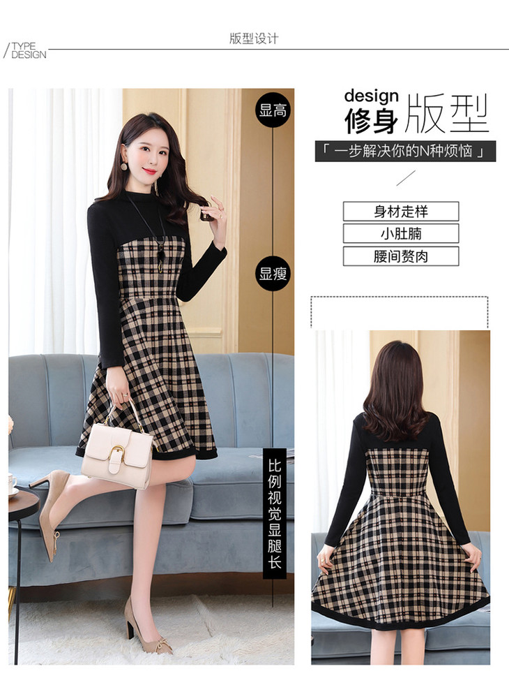 CQ-BLKE0066 2020年秋冬季时尚百搭收腰显瘦圆领拼接色A字裙连衣长袖