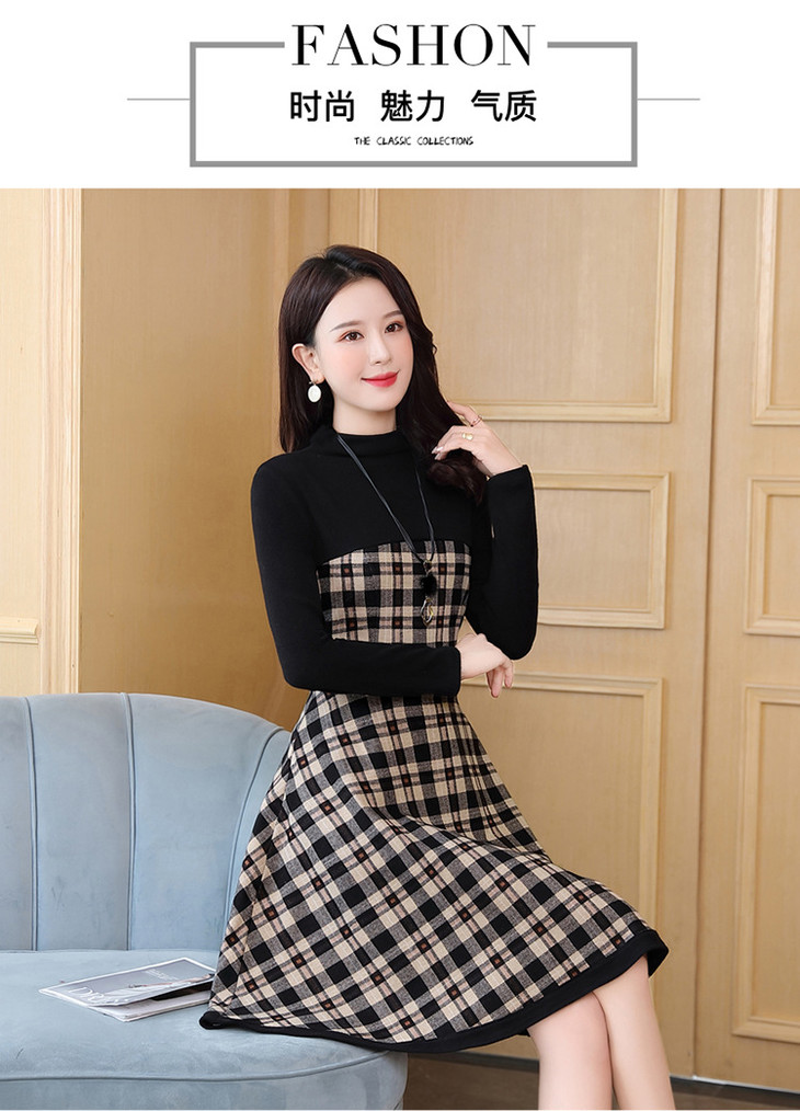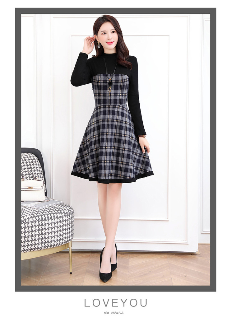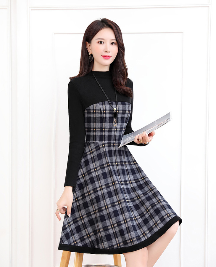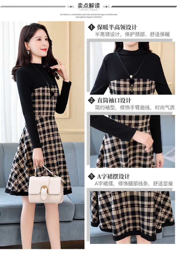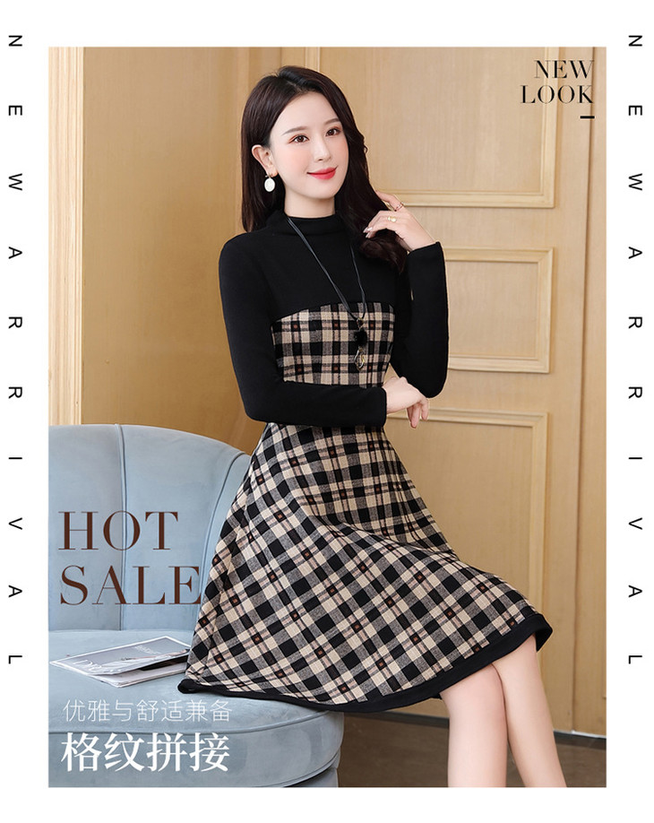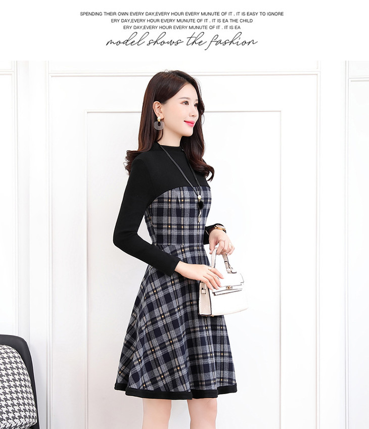 CQ-BLKE0066 2020年秋冬季时尚百搭收腰显瘦圆领拼接色A字裙连衣长袖
