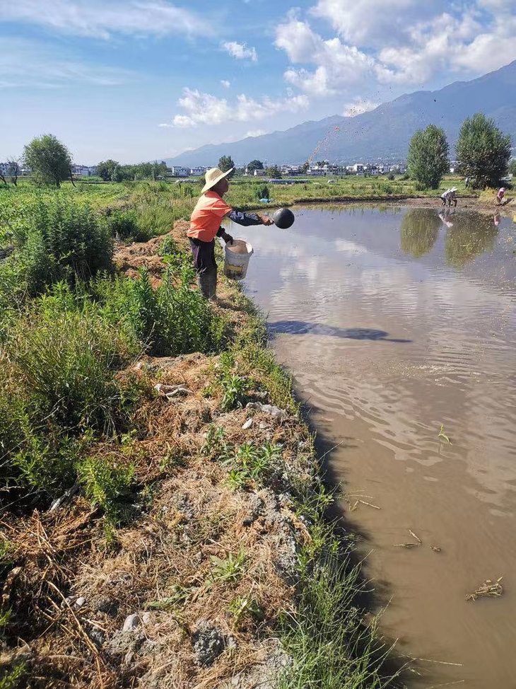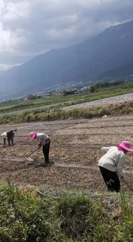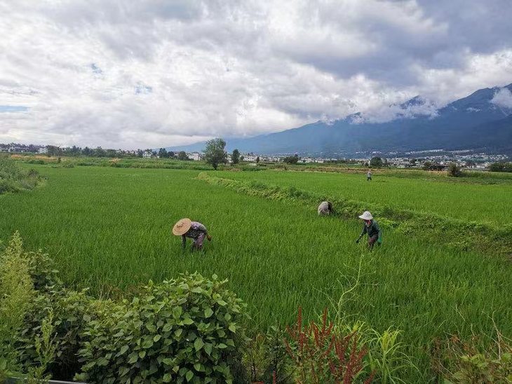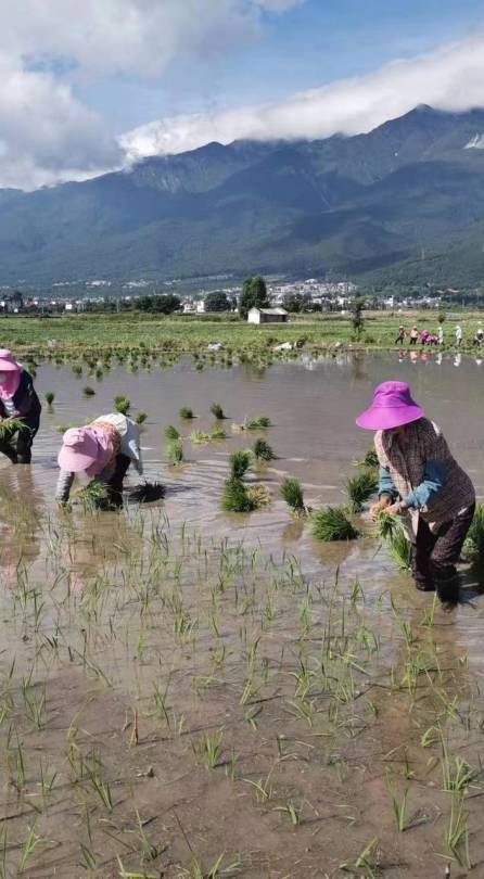 灌溉稻田的水来自于苍山的溪流,等到5月份,秧苗长粗了,田里也耙平了,接下来就是男女老少一起上,接力完成这个非常有技术含量的插秧工作,腰部得长期保存弯曲的状态,秧苗要插得周正,还要保证每一棵秧苗都是壮苗,很考验人的耐力、体力和专注力。