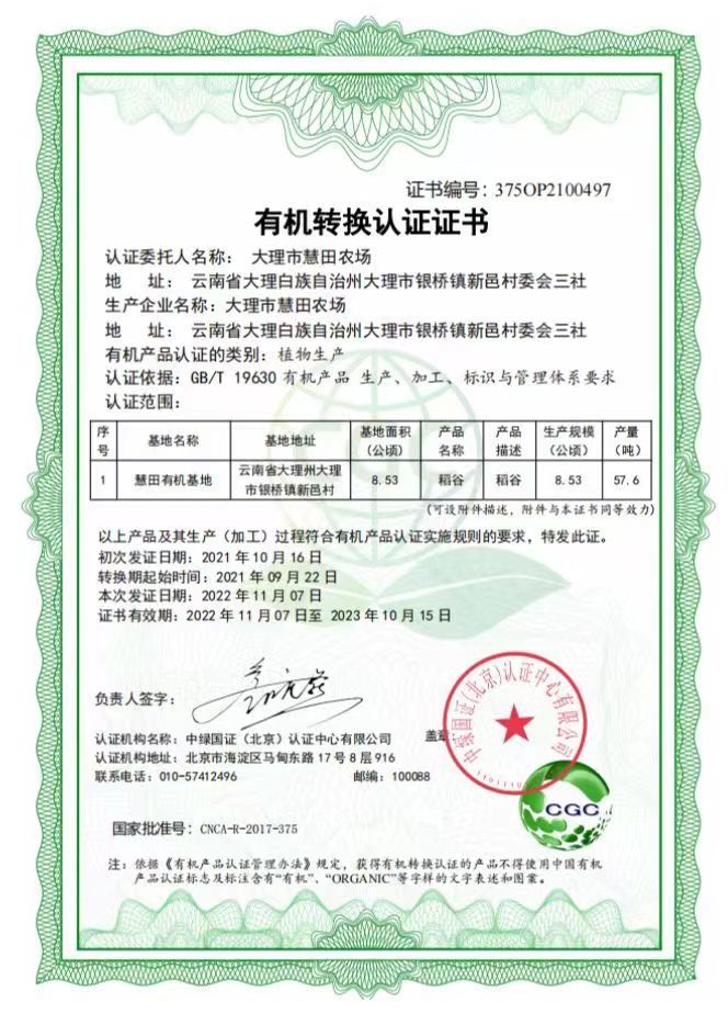 大米相对蔬菜来说更加能稳定供应,于是月萍姐决定给大米做有机认证,目前还在有机认证转换阶段。