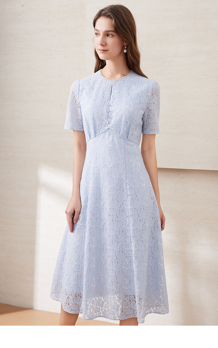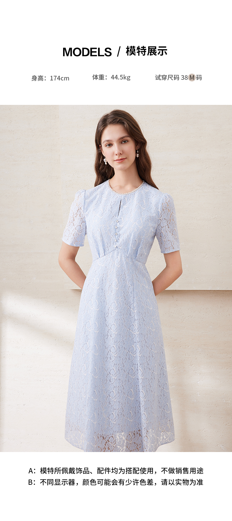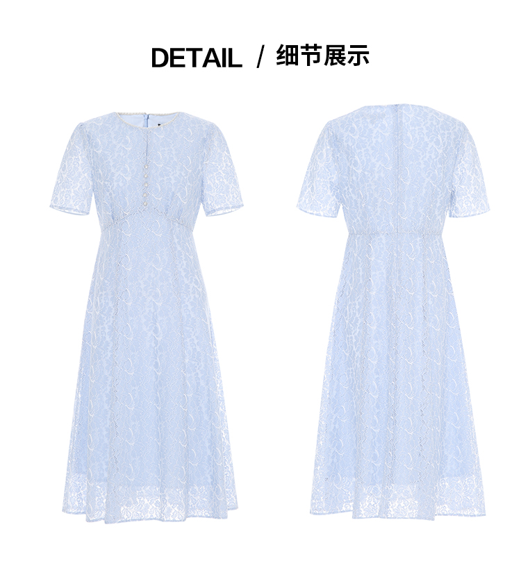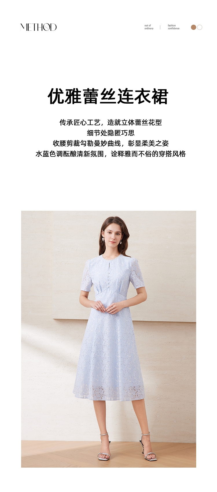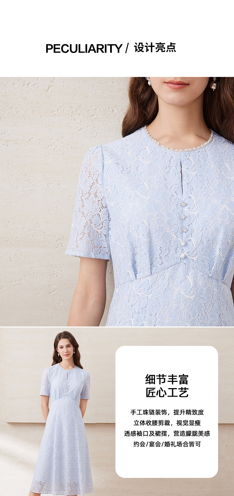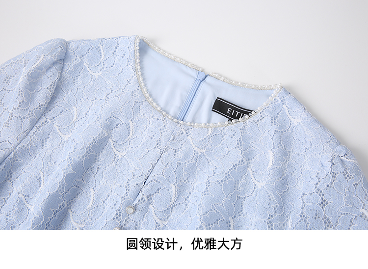 EITIE爱特爱浅蓝色丝绒绣花重工蕾丝收腰显瘦连衣裙2025夏季新款B2507630
