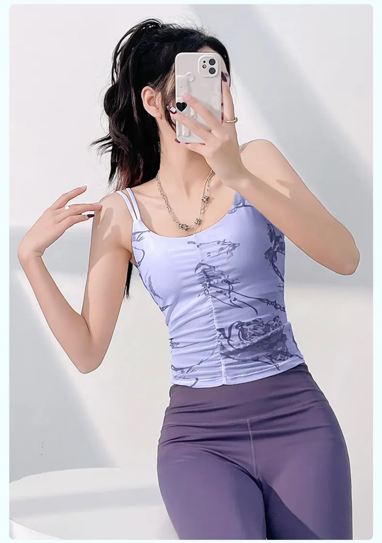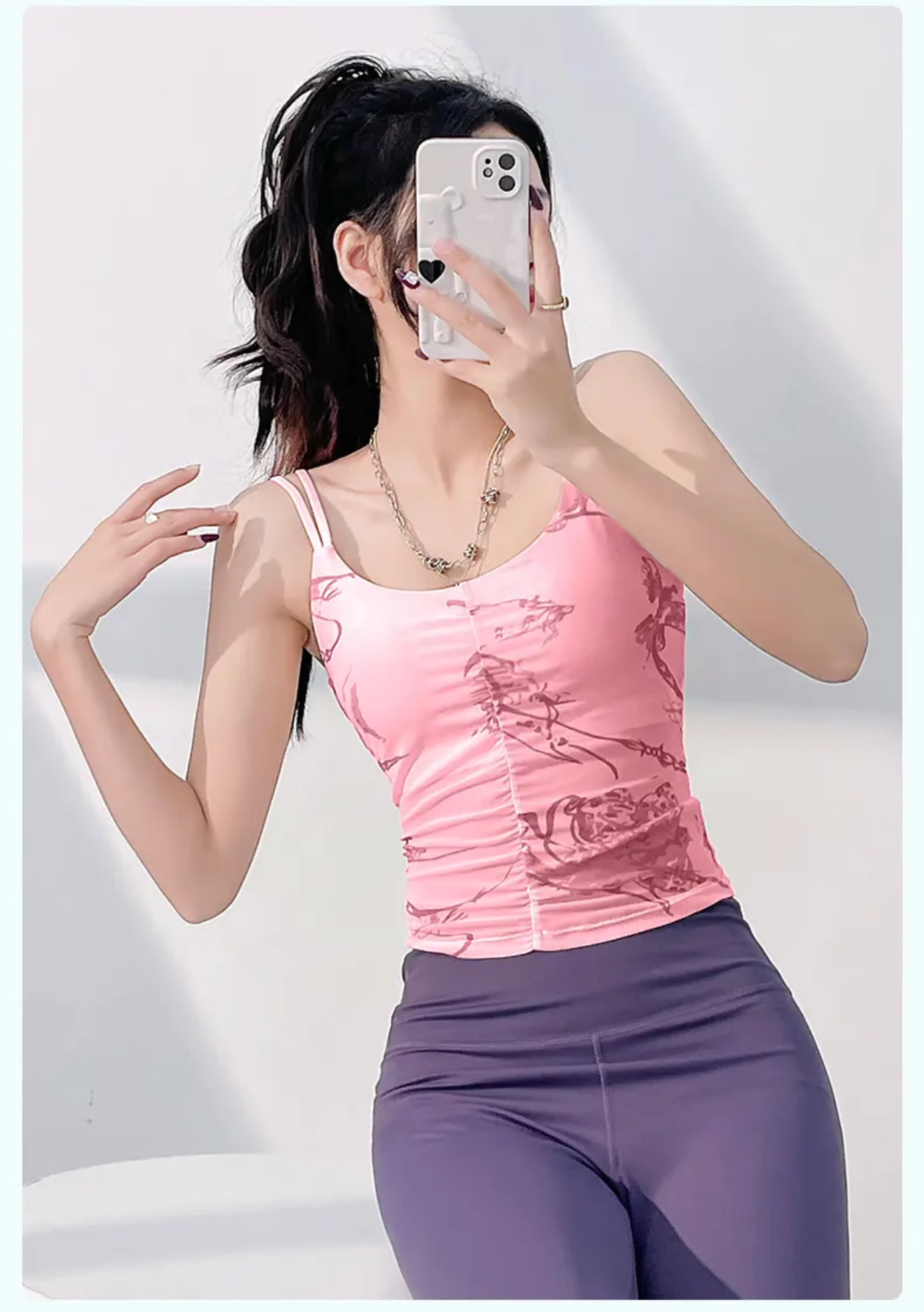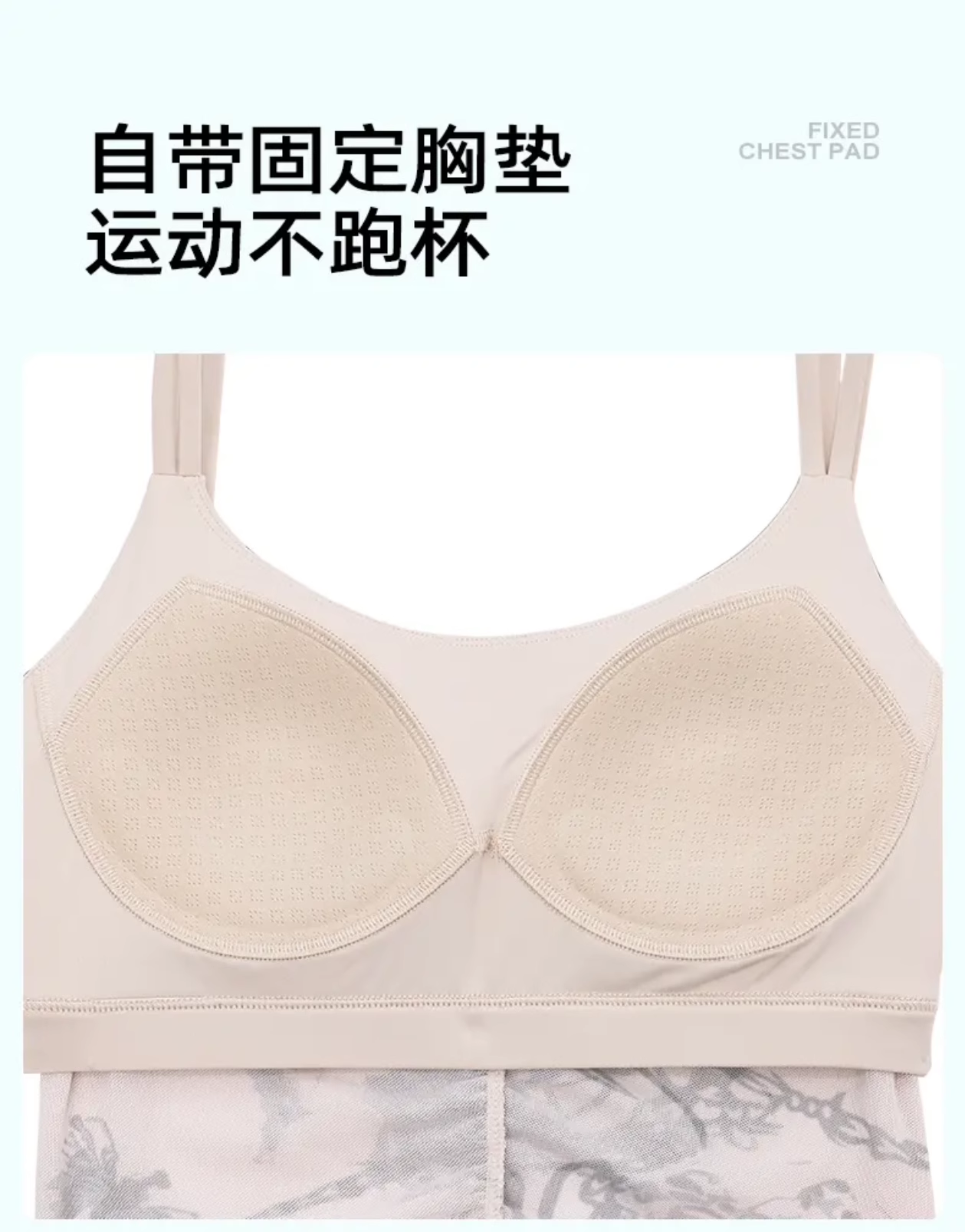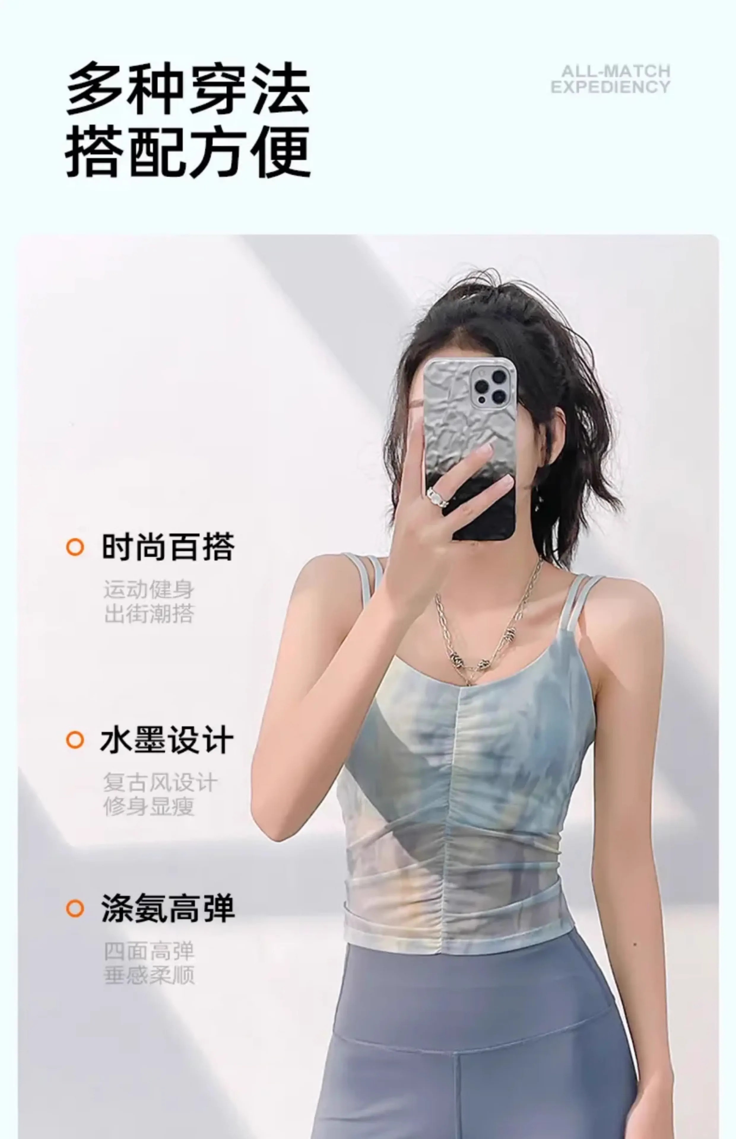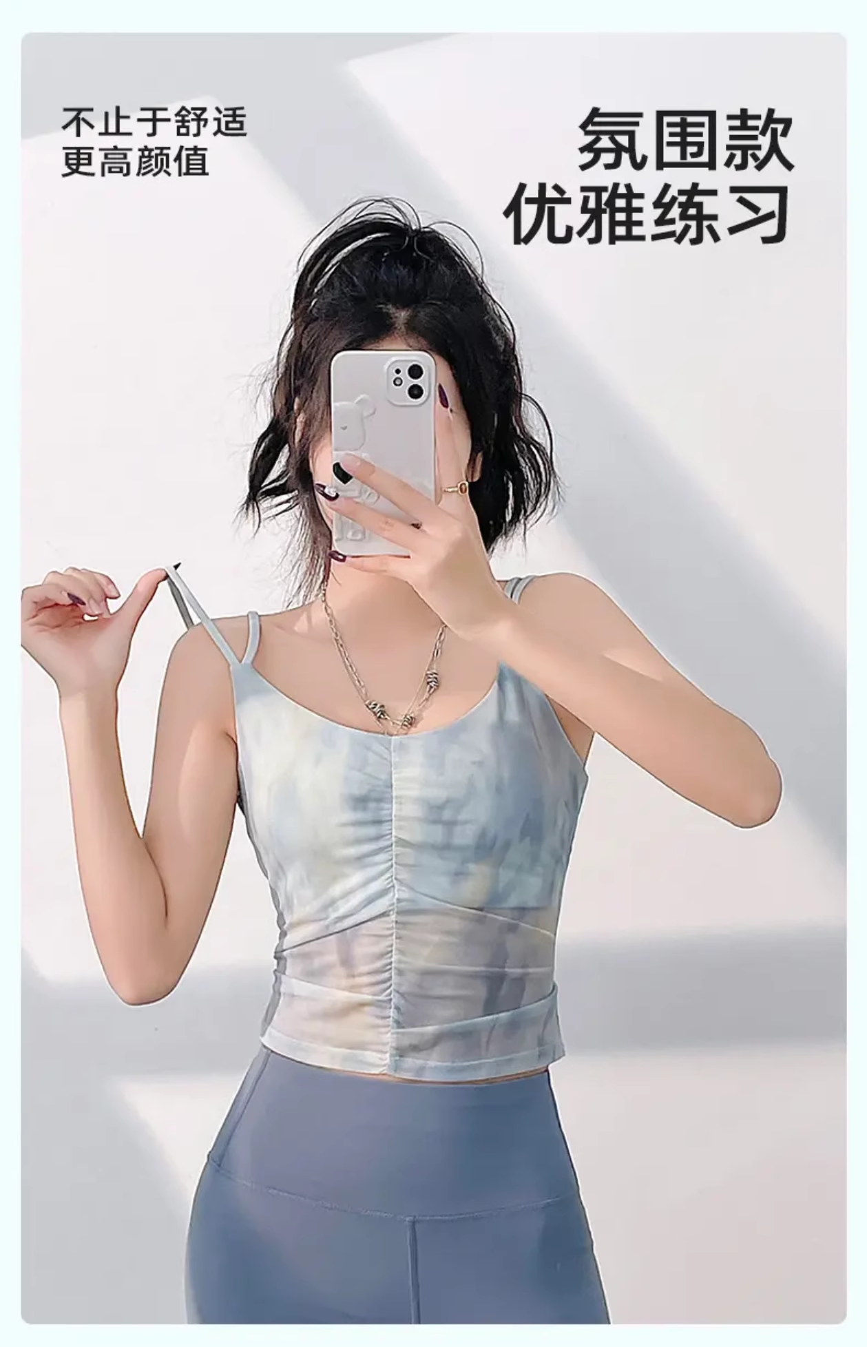 跃牌【瑜堂系列】新款国风印花背心网纱一体固定杯吊带外穿运动内衣女JYMB062