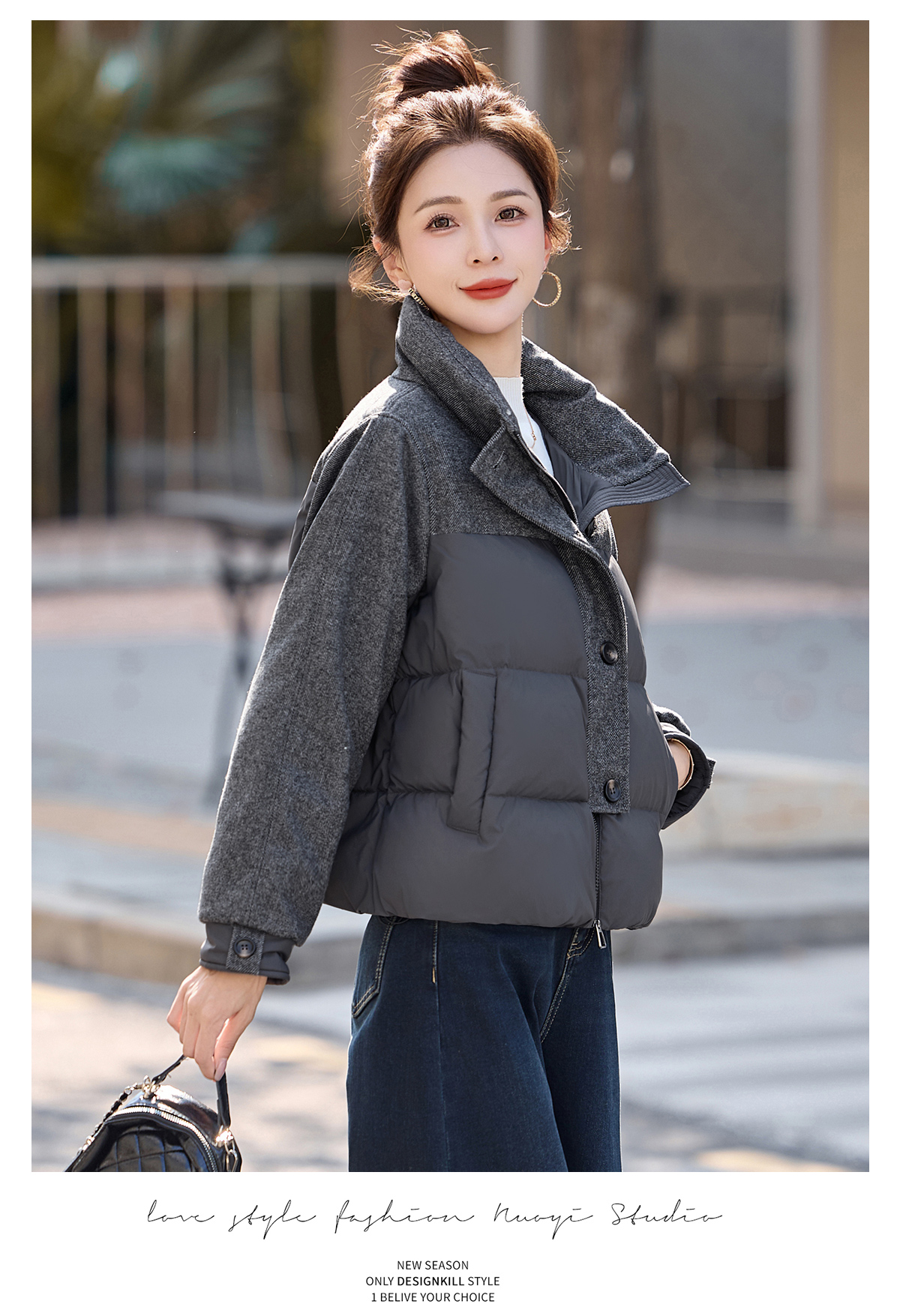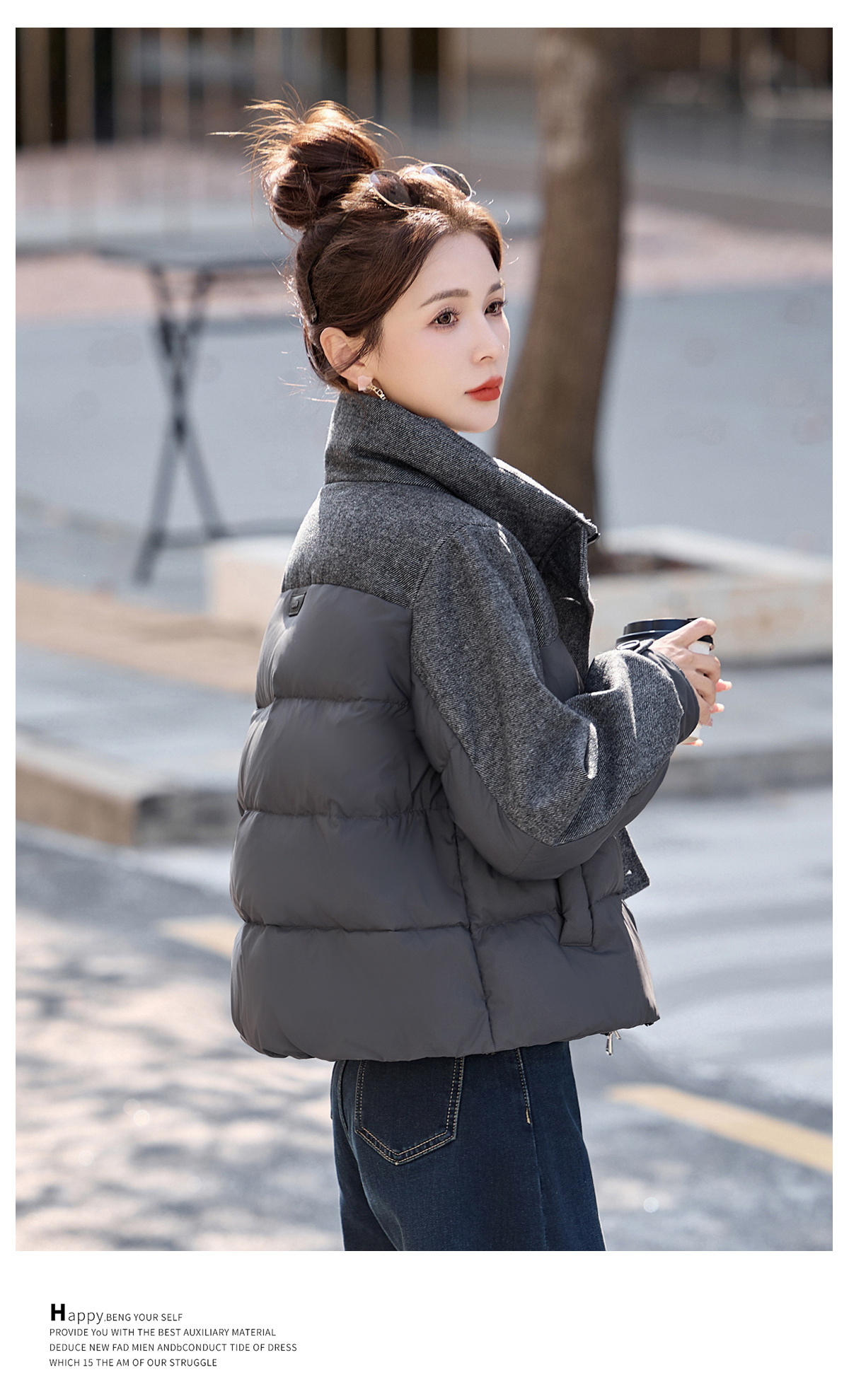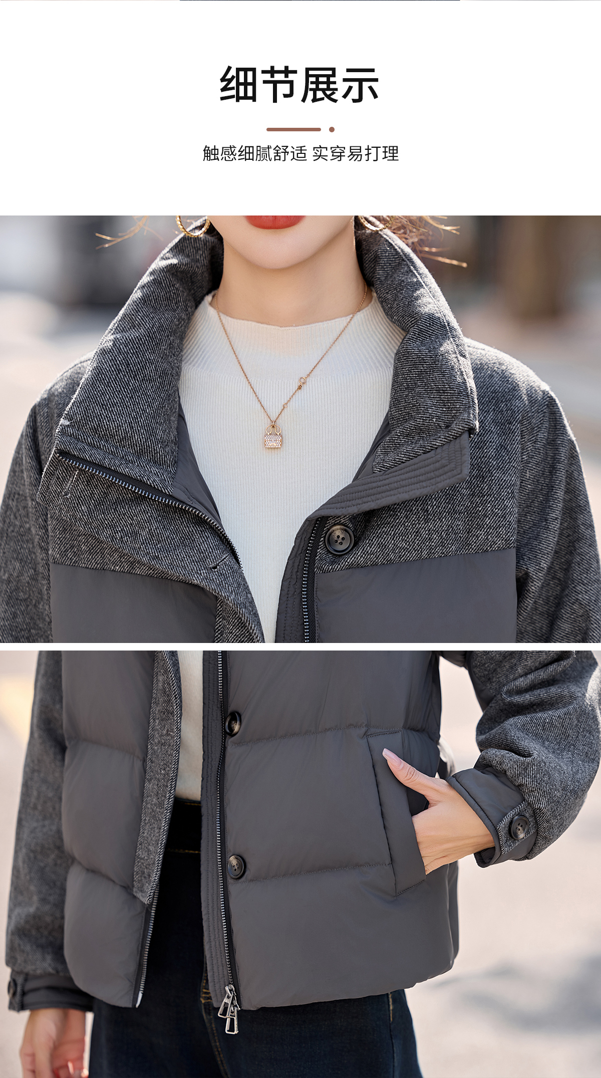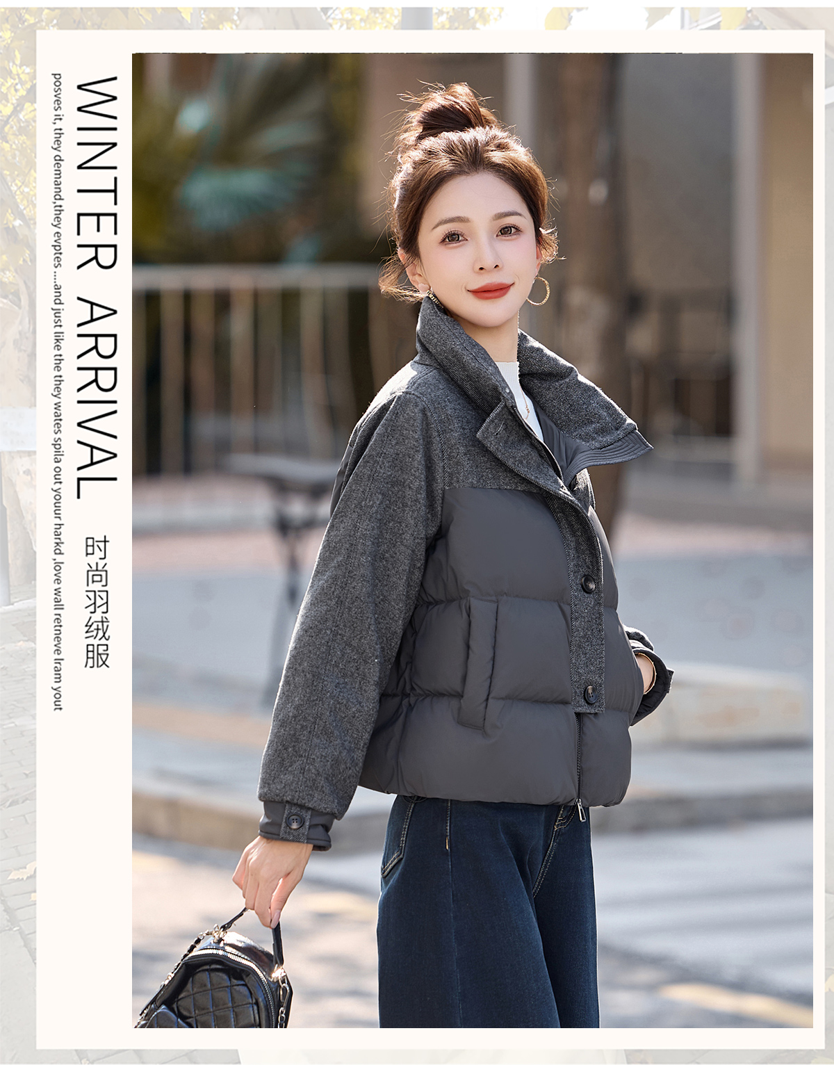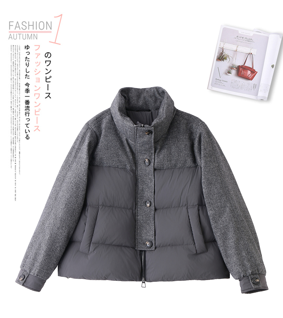 休闲时尚立领羽绒服,爆款毛呢拼接高端洋气外套HR-ZYF8896