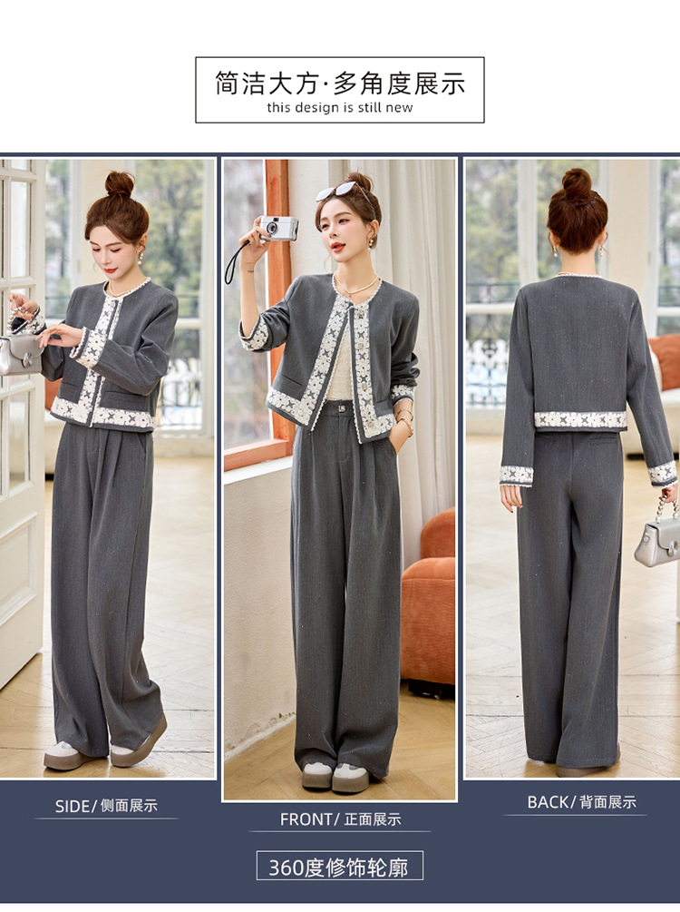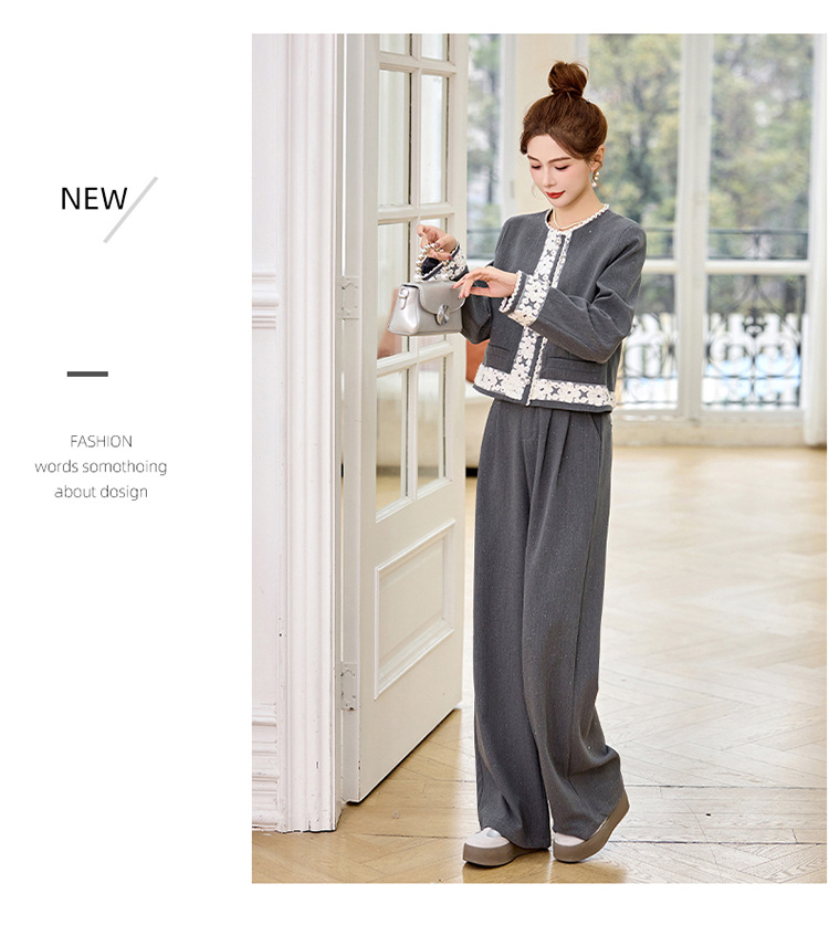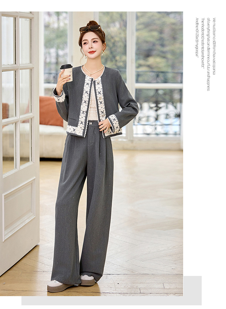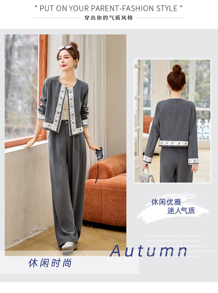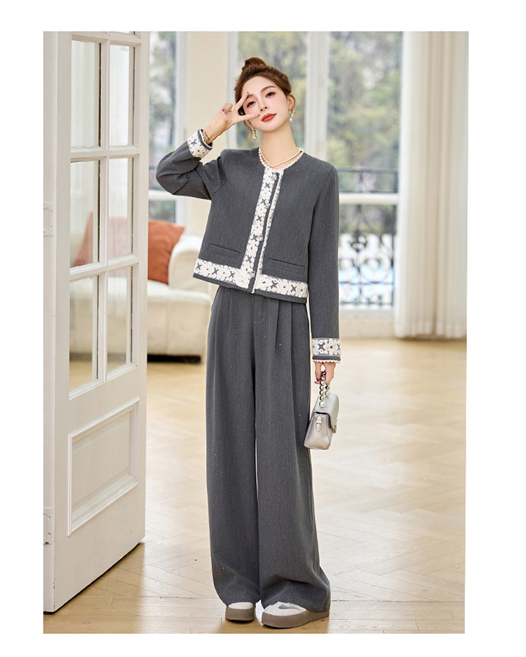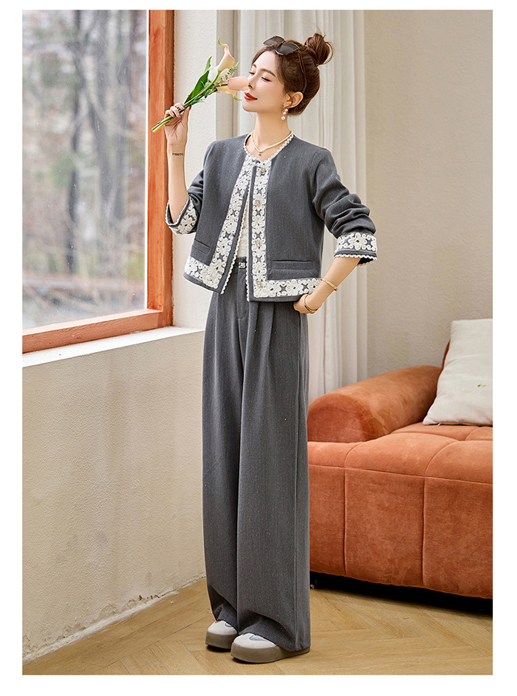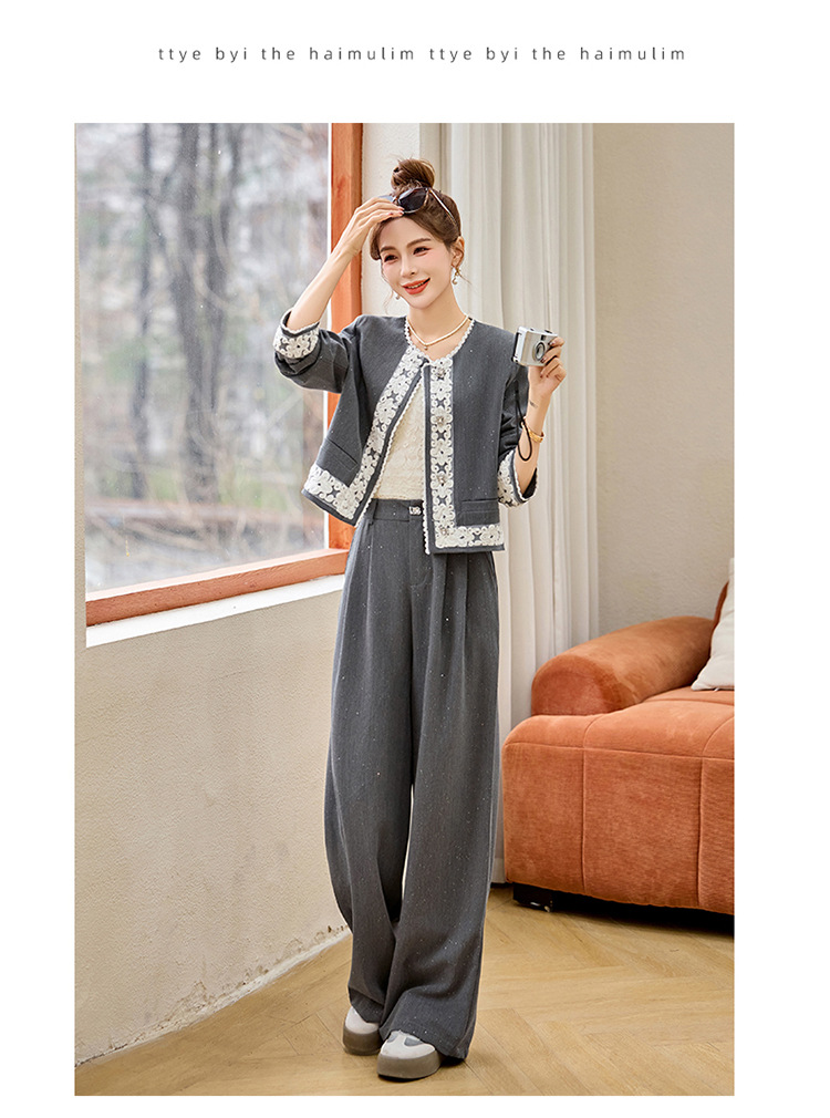 时尚刺绣钩花小香风套装,时尚气质休闲显瘦阔腿裤两件套HR-YQH2639