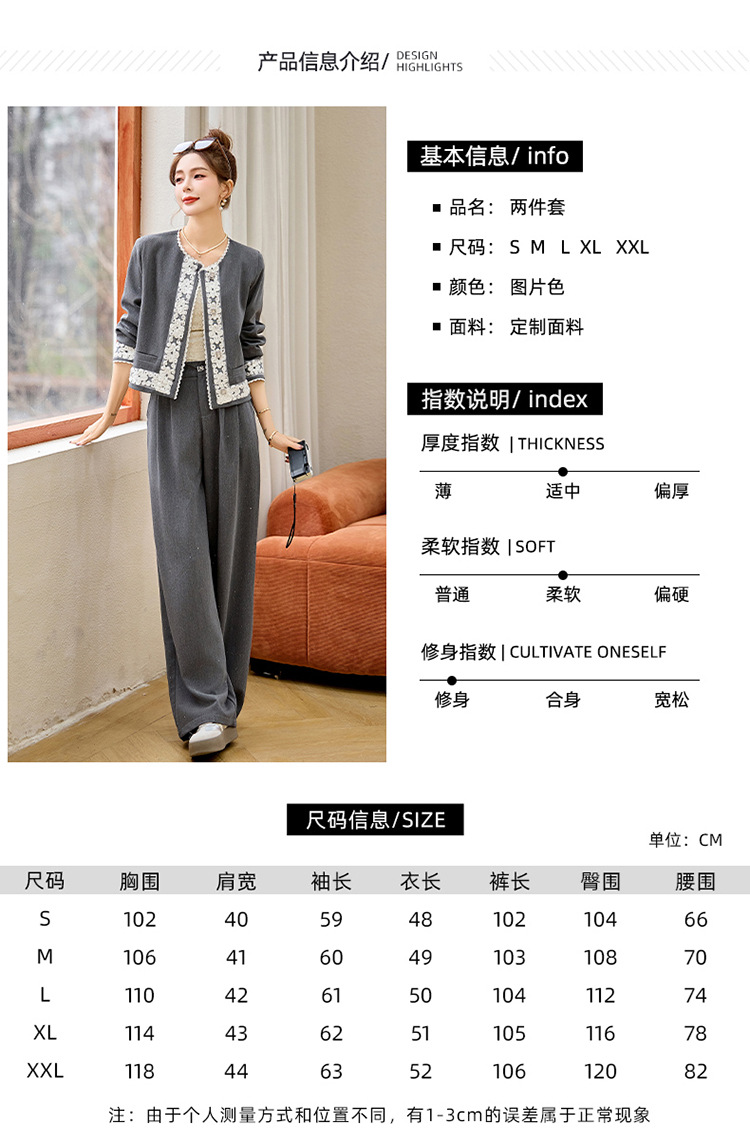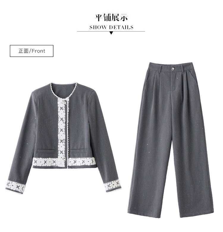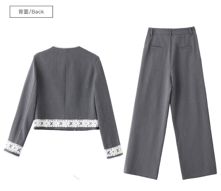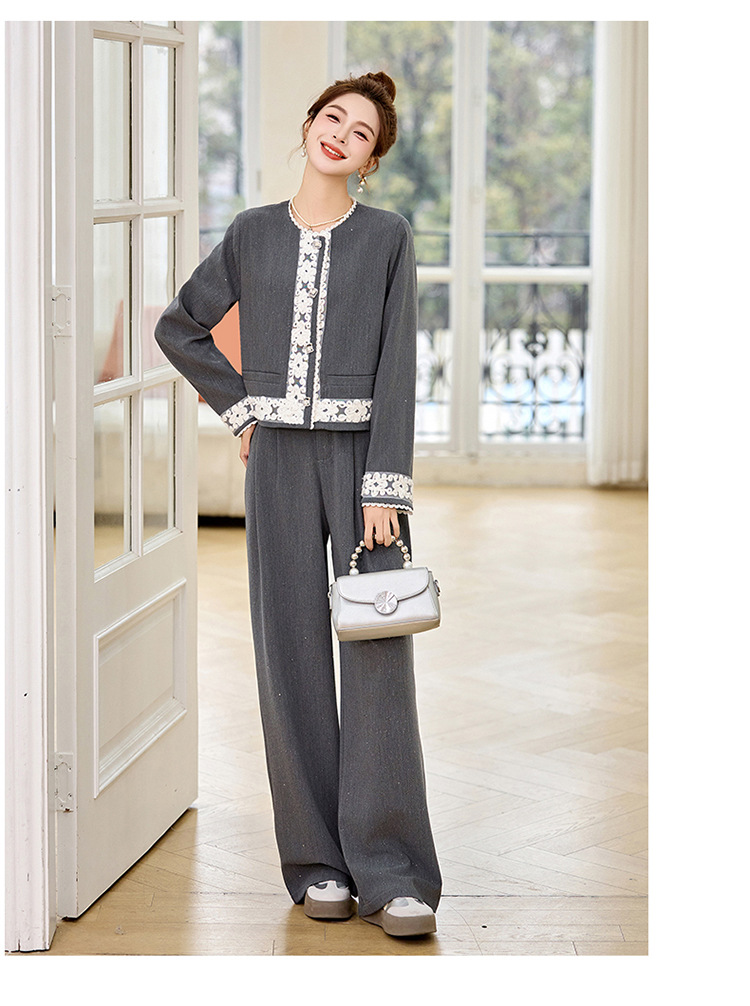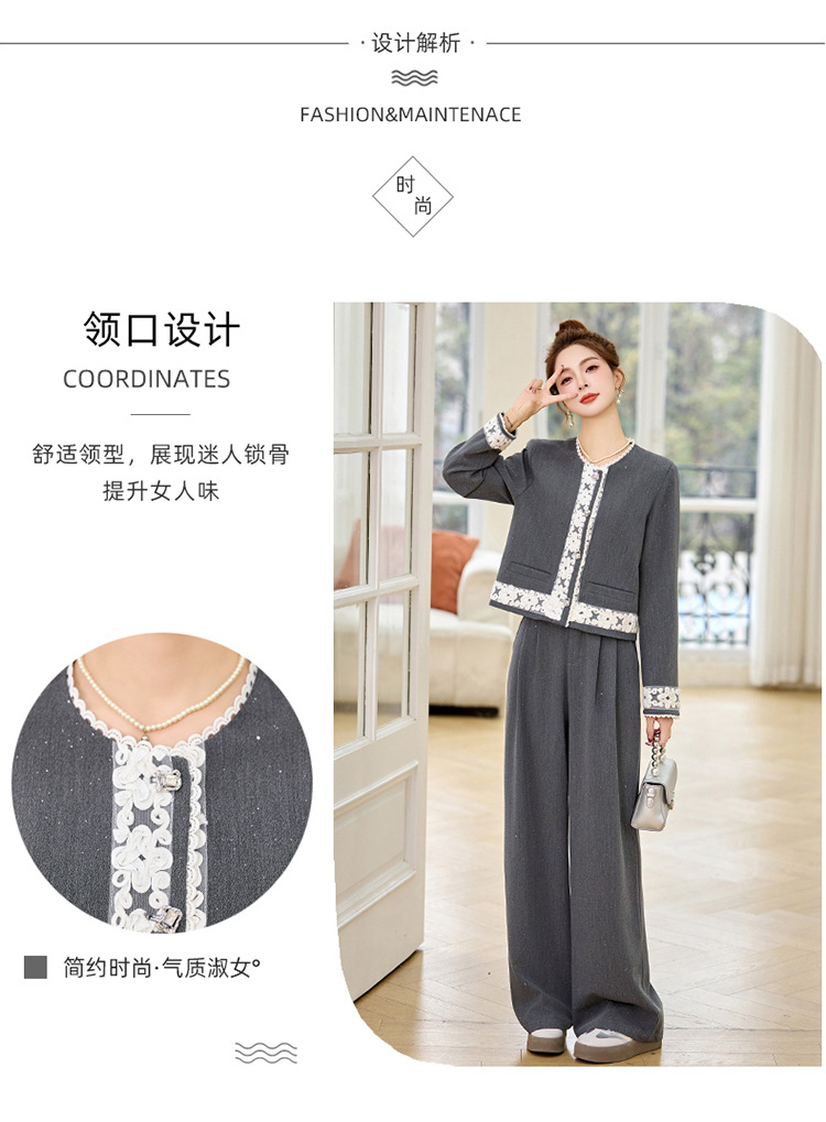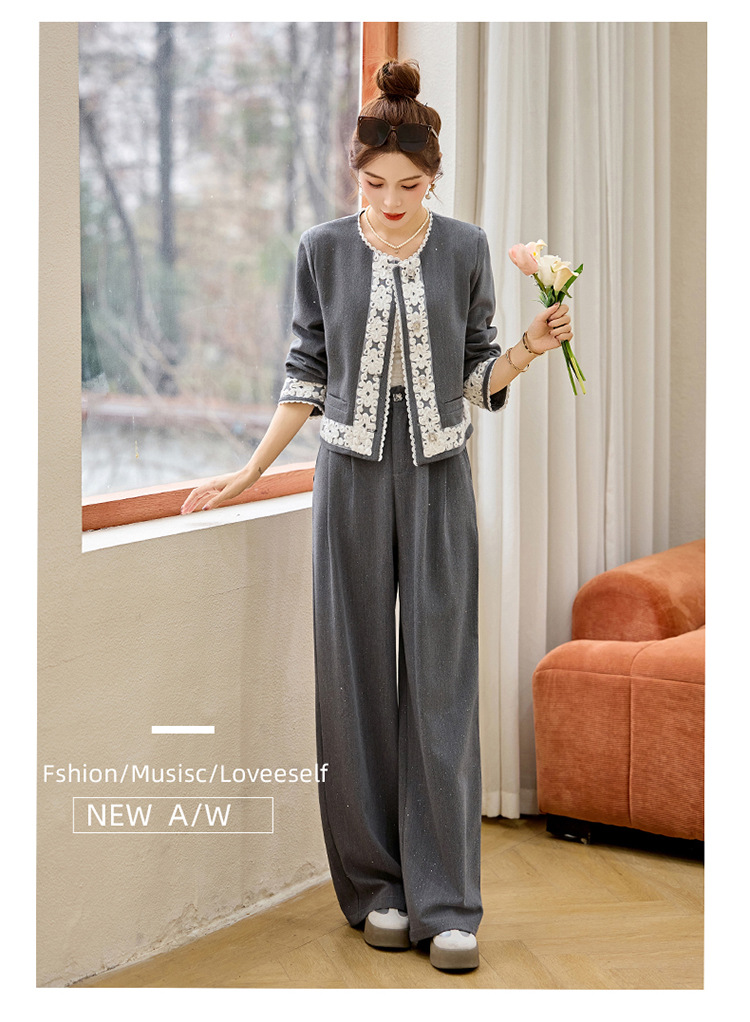 时尚刺绣钩花小香风套装,时尚气质休闲显瘦阔腿裤两件套HR-YQH2639