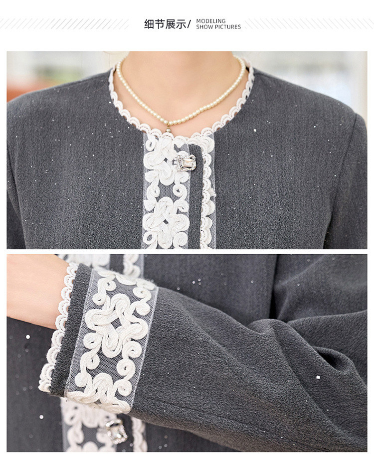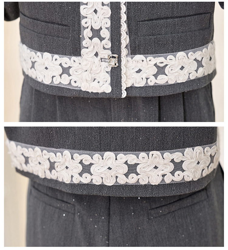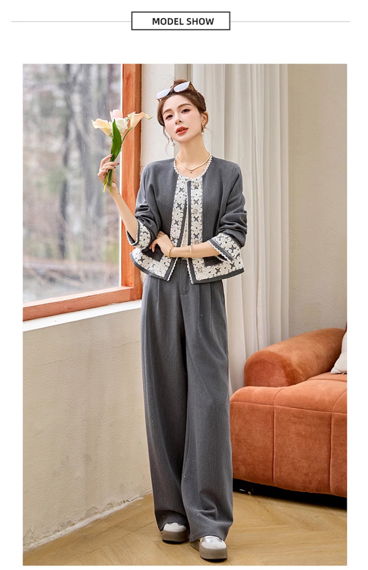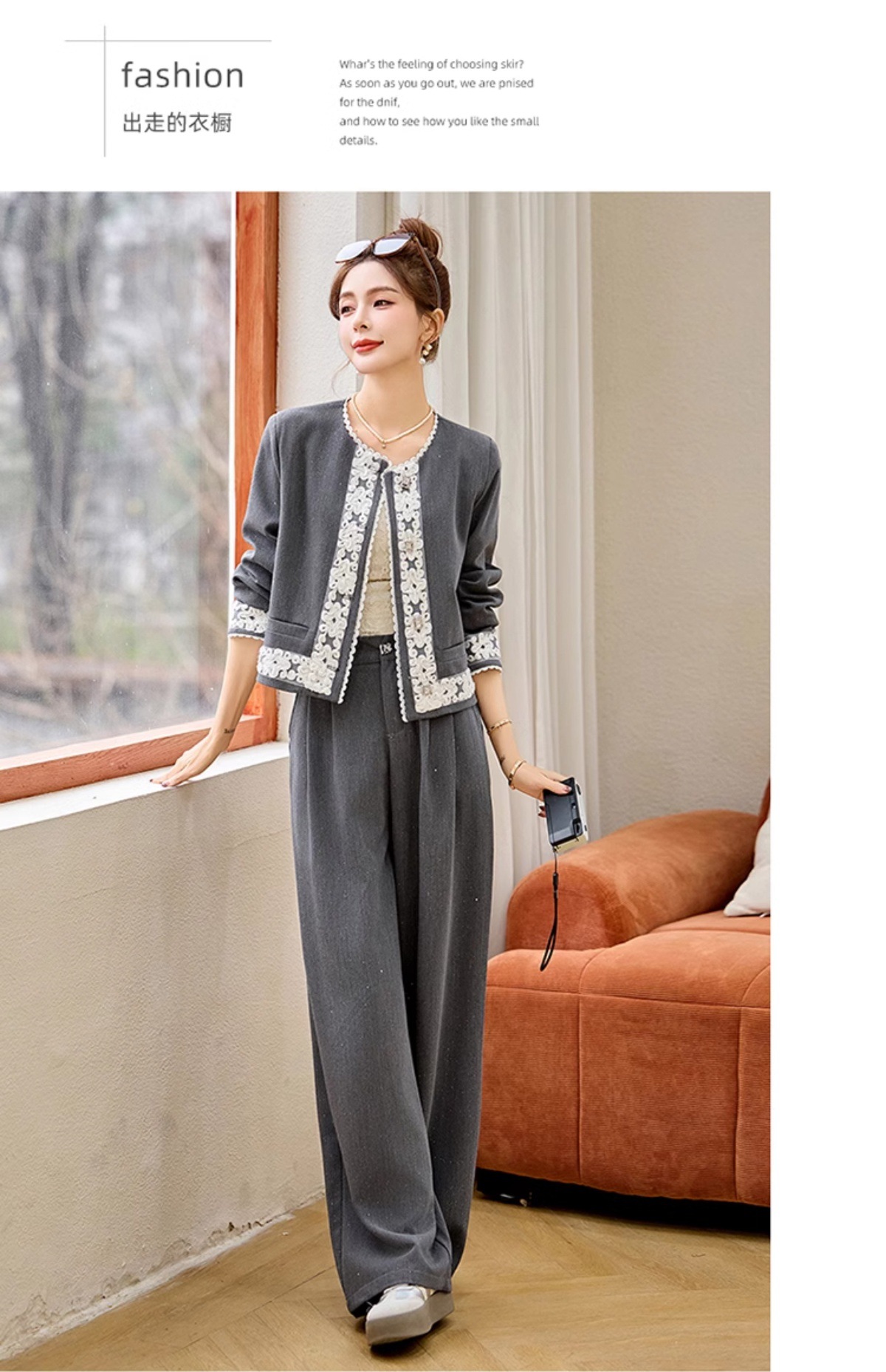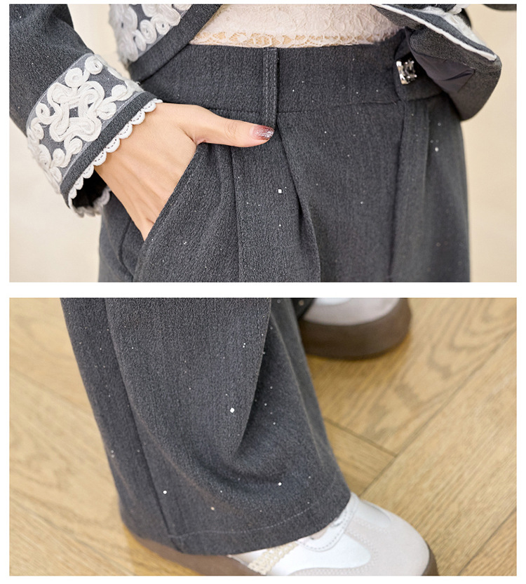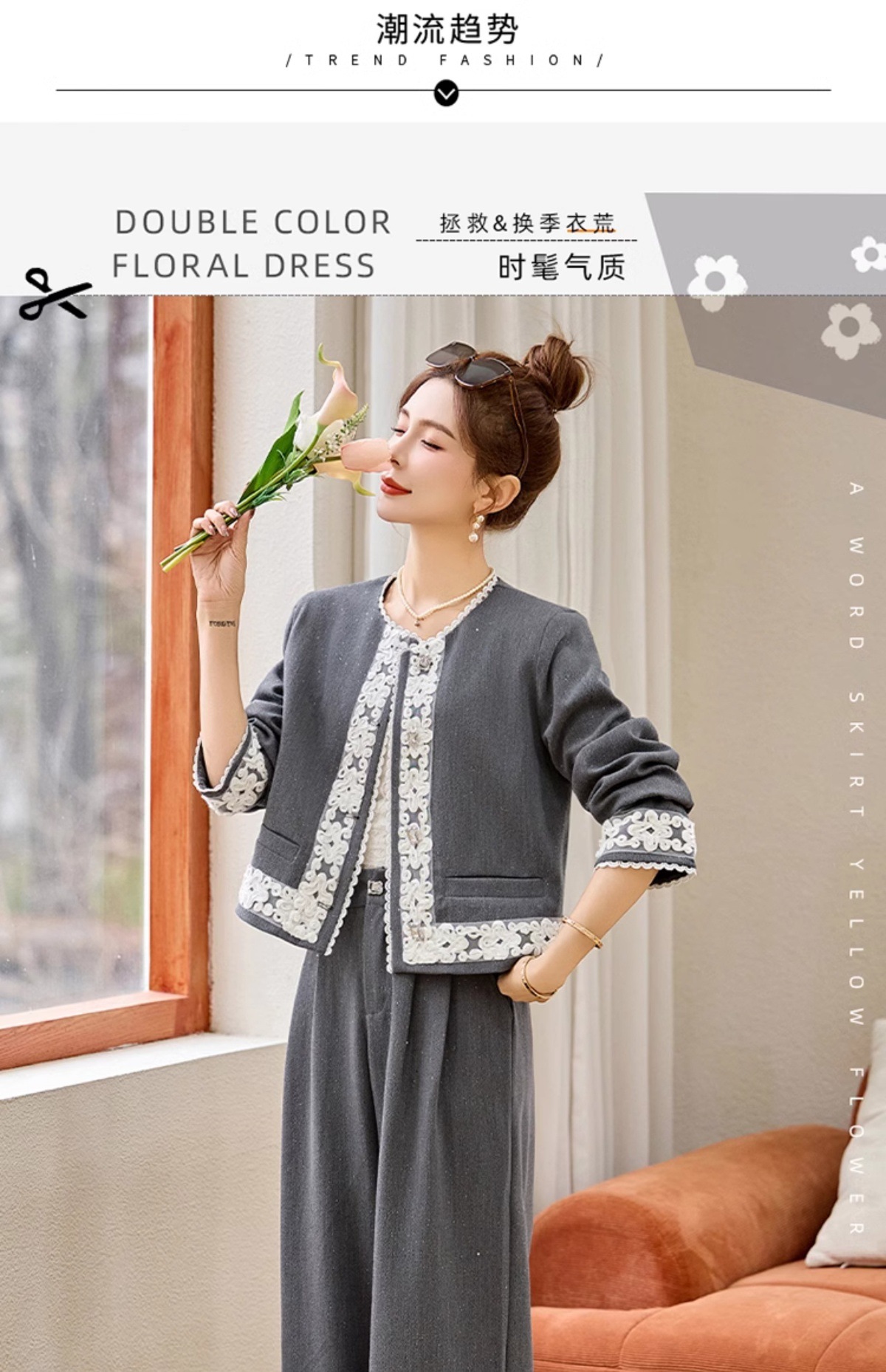 时尚刺绣钩花小香风套装,时尚气质休闲显瘦阔腿裤两件套HR-YQH2639