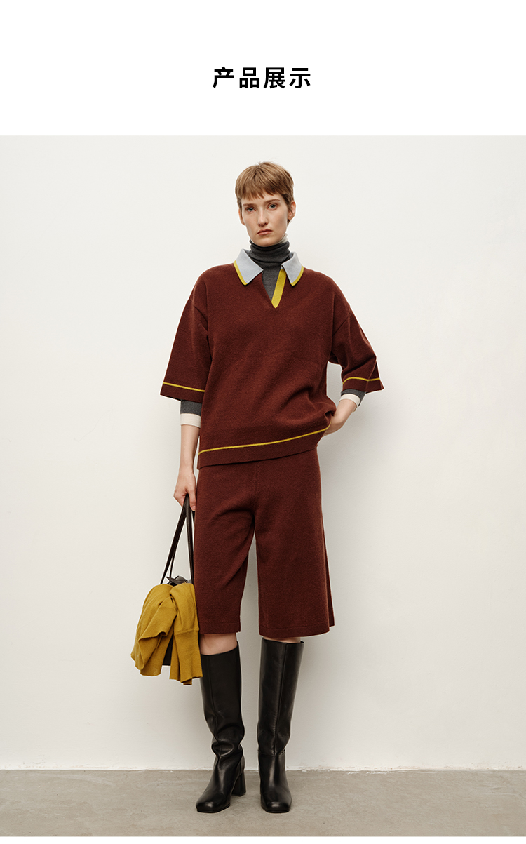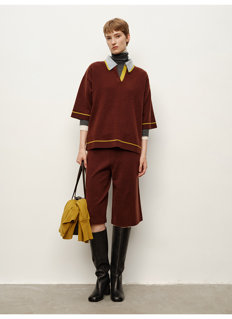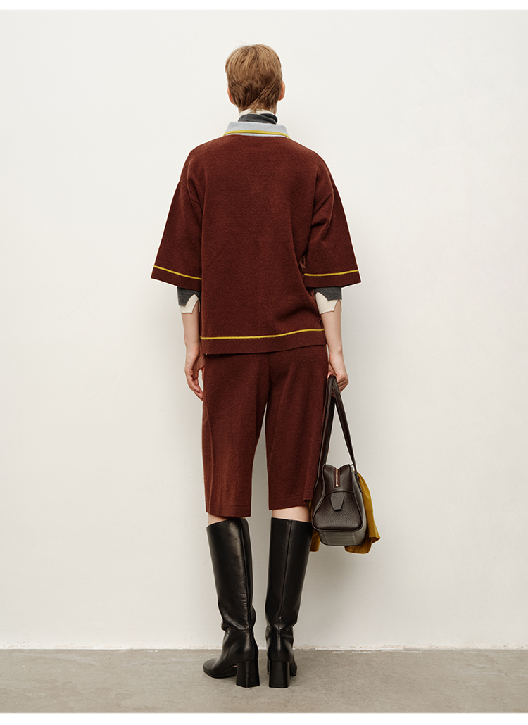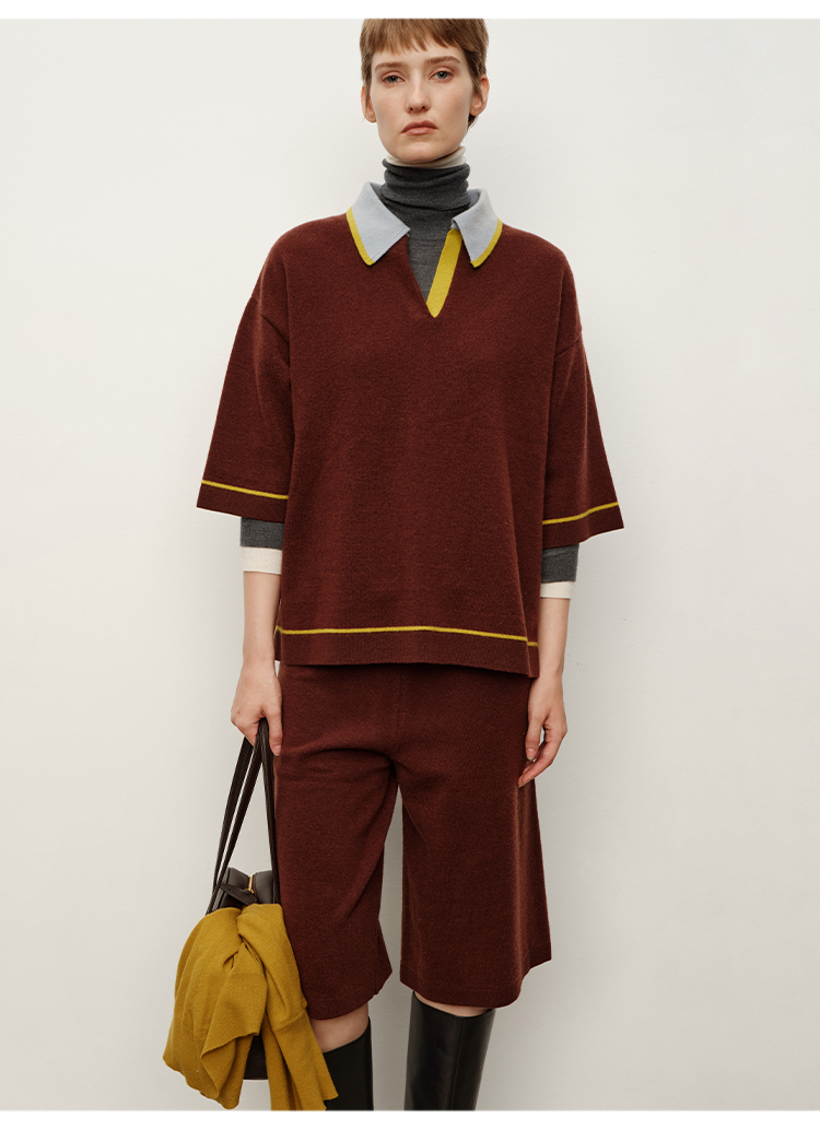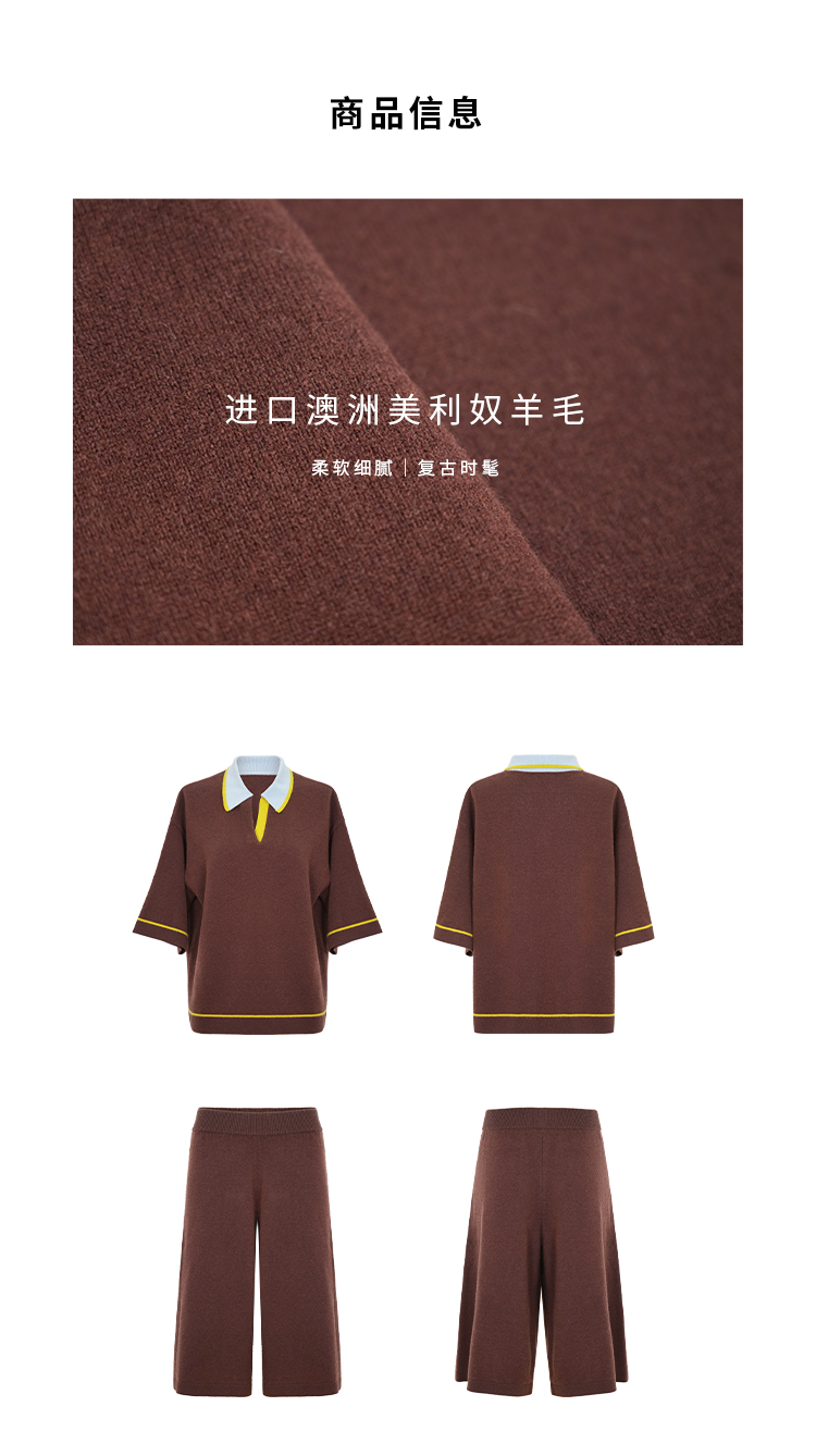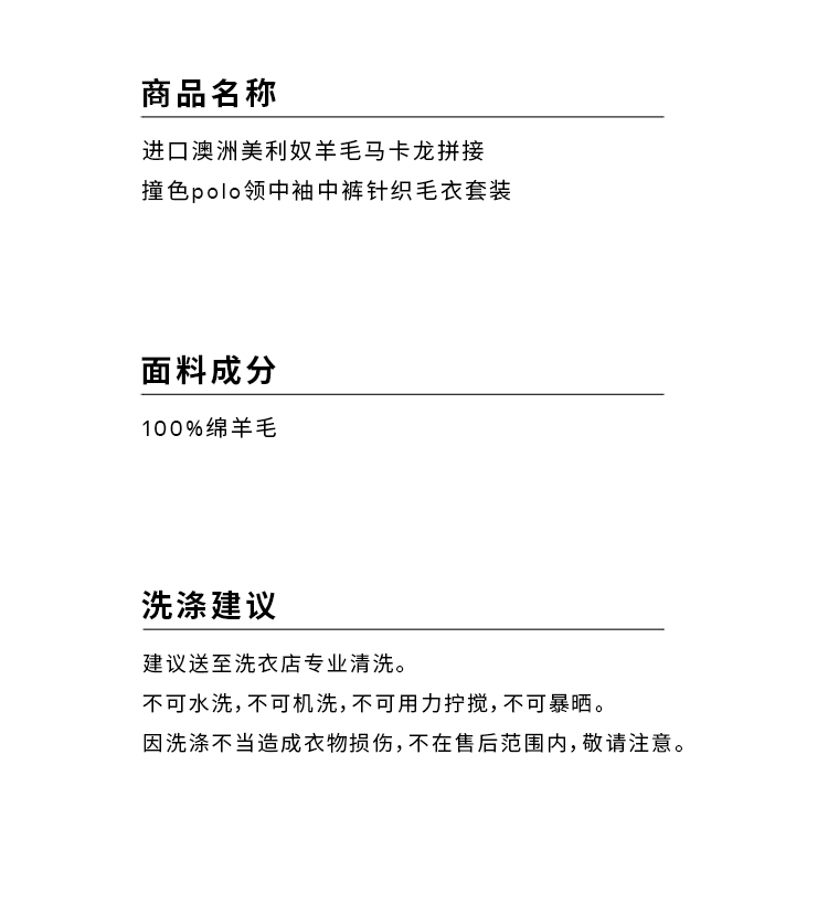 HIDEMI 进口澳洲美利奴羊毛马卡龙拼接撞色polo领中袖中裤针织毛衣套装 polo衫/中裤