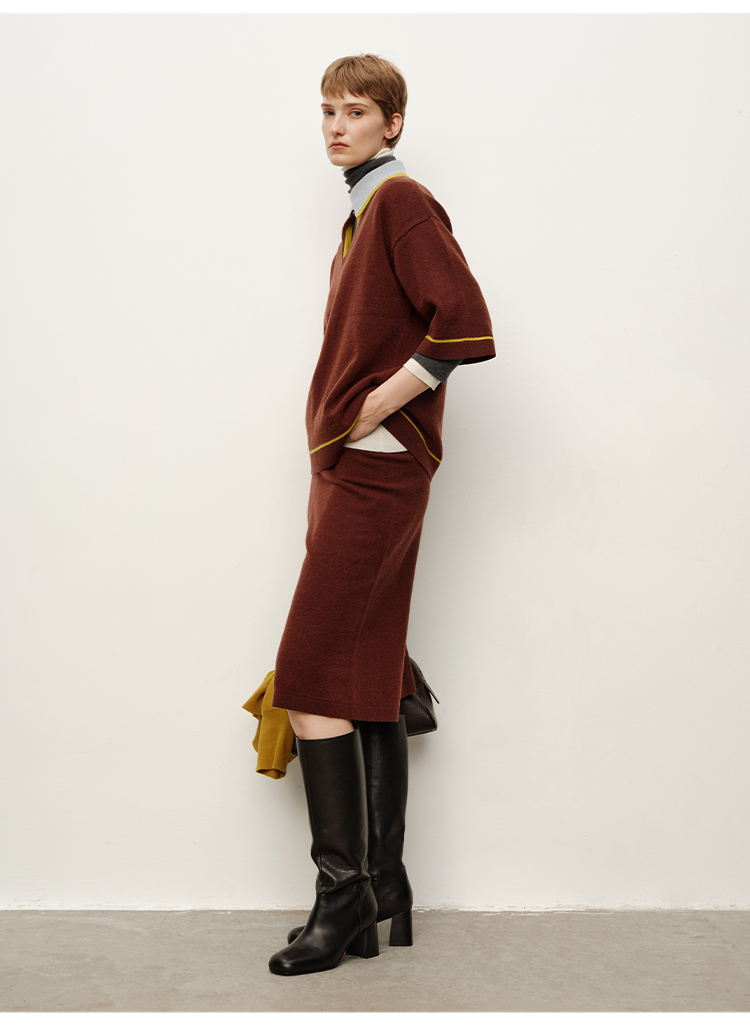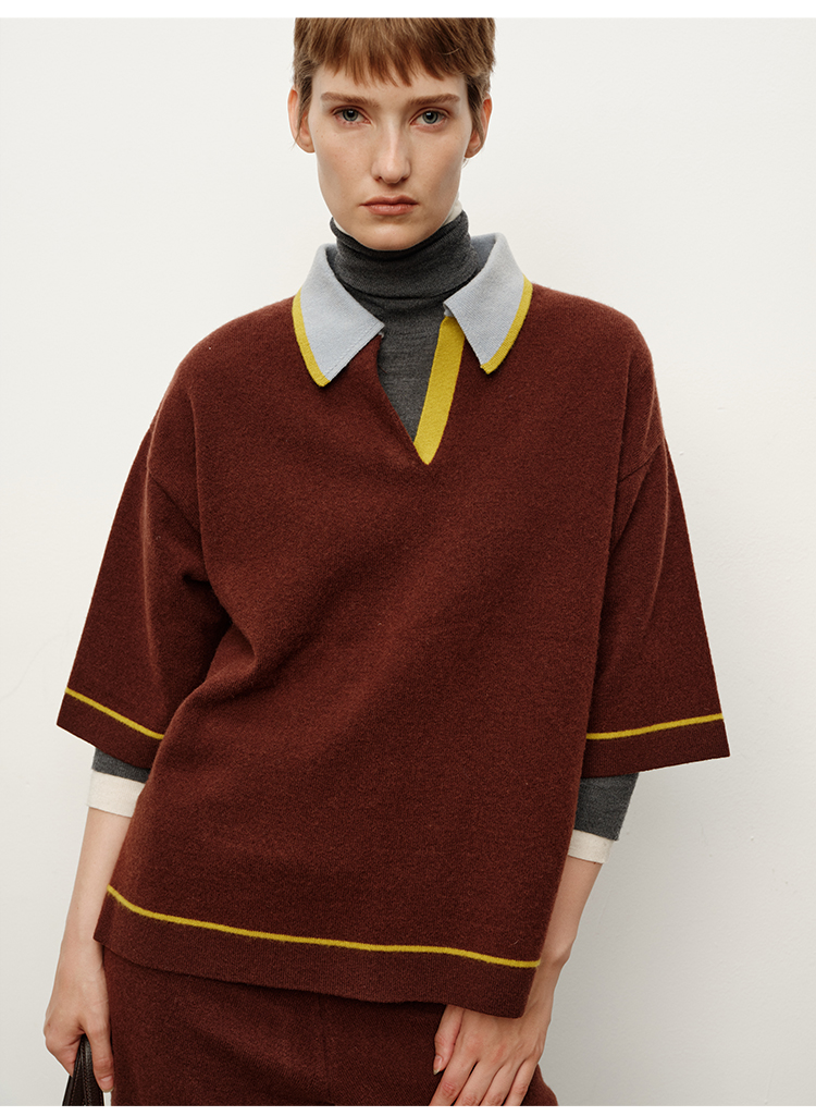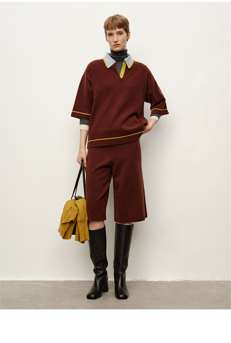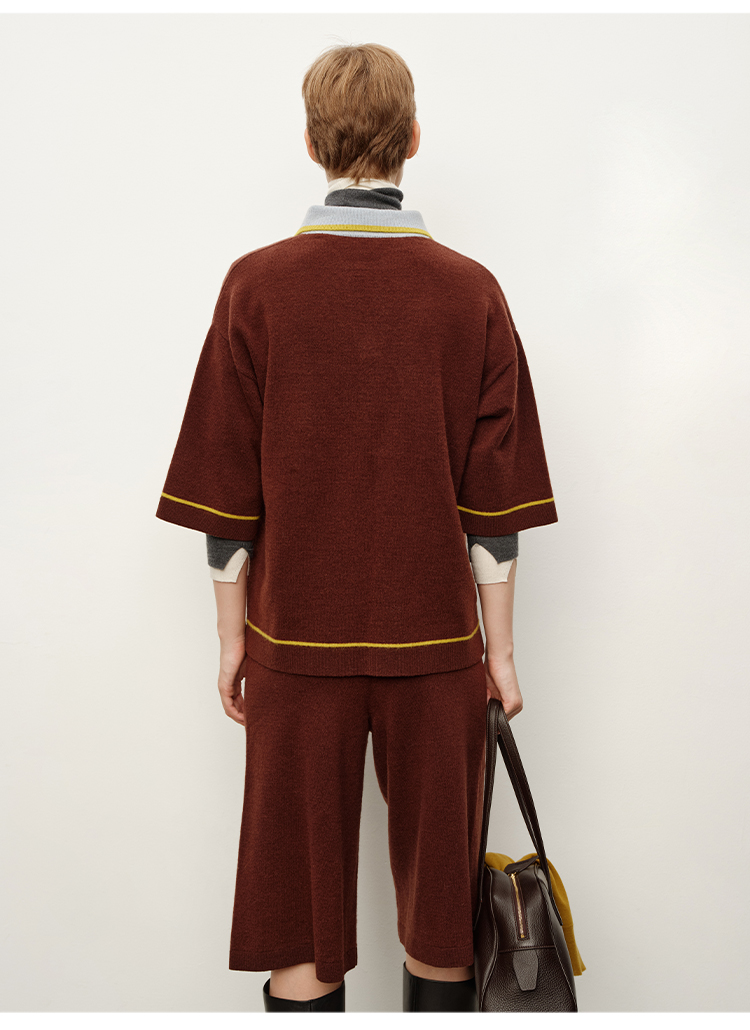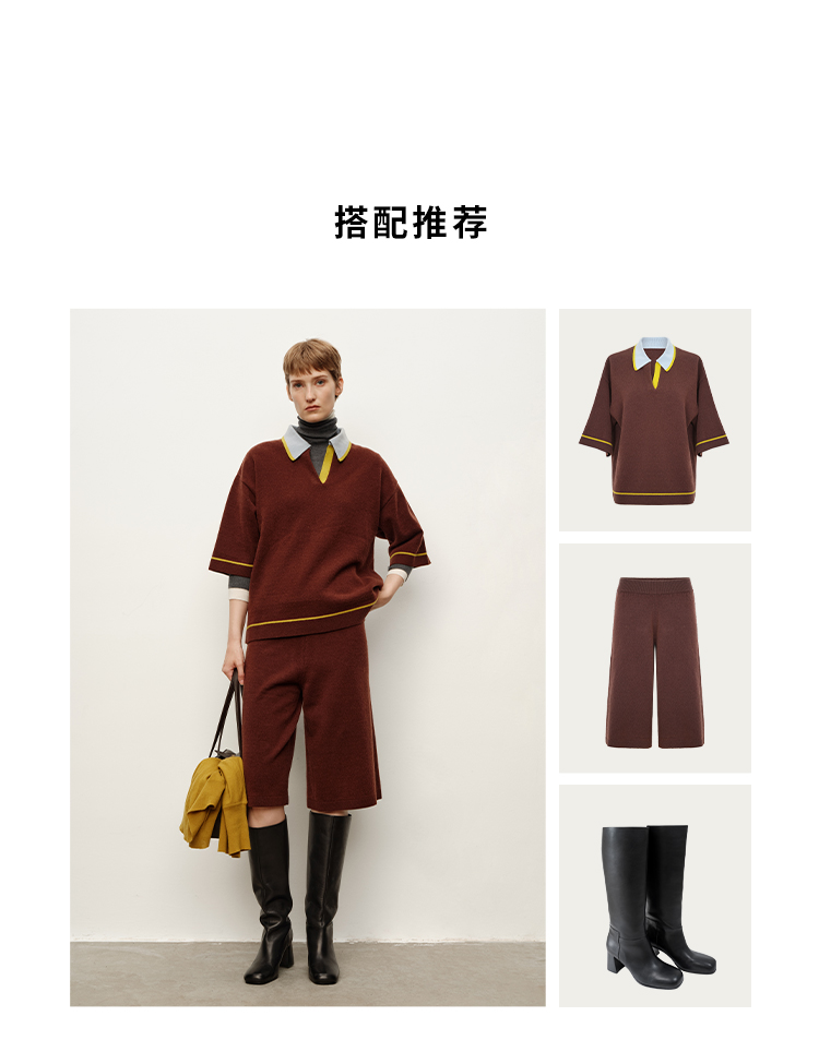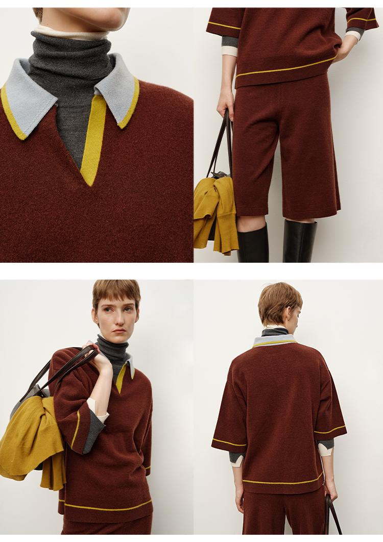HIDEMI 进口澳洲美利奴羊毛马卡龙拼接撞色polo领中袖中裤针织毛衣套装 polo衫/中裤
