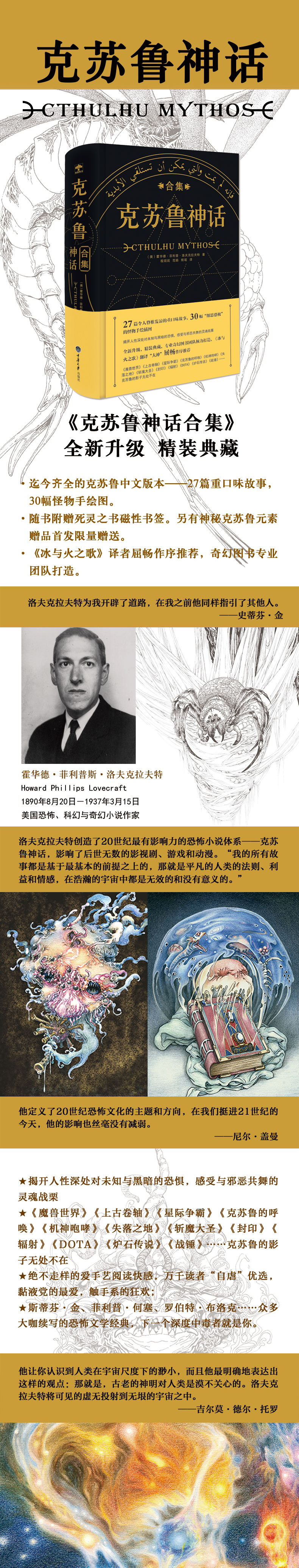 对于克苏鲁神话作品的*之处,或对于它的文学价值,我不想在此多做赘述,读者可以从这本堪称精华的集子里去自行欣赏认定,留下美好的第一印象(或者对早已熟络的读者来说,是加以收藏)。值得说明的是,这远不是国内发行的第一本《克苏鲁神话》故事集,当然也绝不会是*一本——事实上,这本集子本身是把重庆大学出版社曾经出版过的几本《克苏鲁神话》重新润色并增加新篇后结集出版——但它没有收录任何后继作家的作品,也没有任何同人或恶搞之作,它的成色是*正的、全部来源于H·P·洛夫克拉夫特本人的小说。