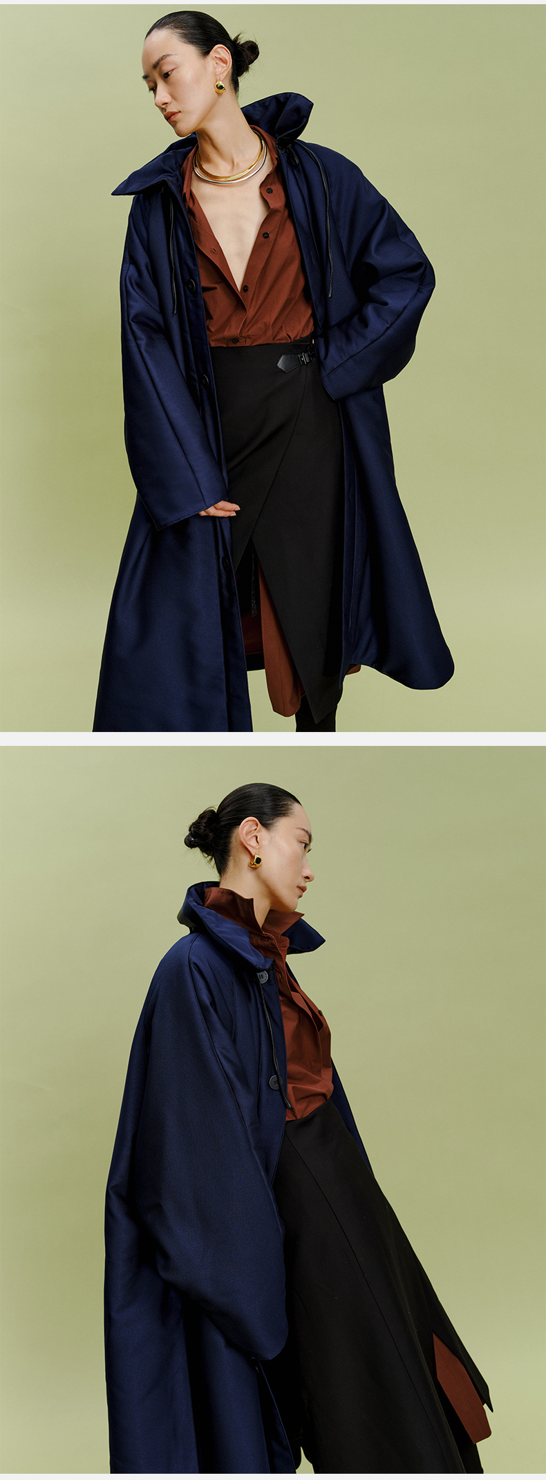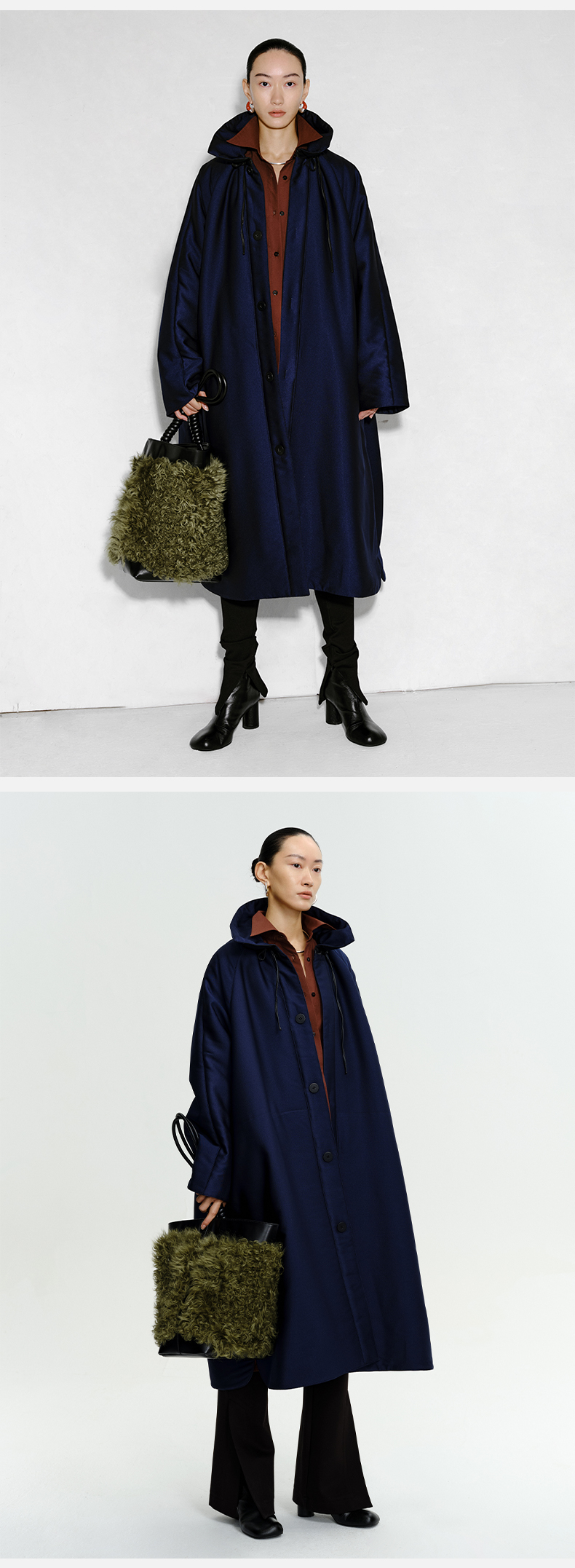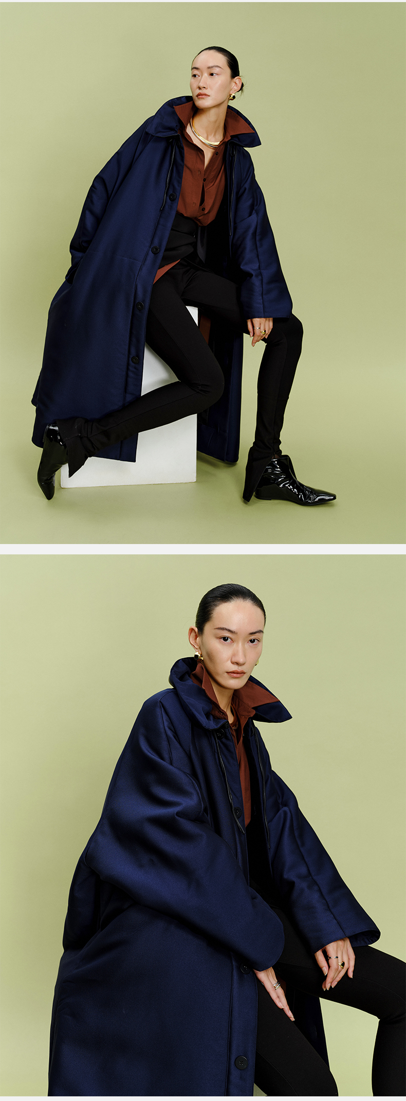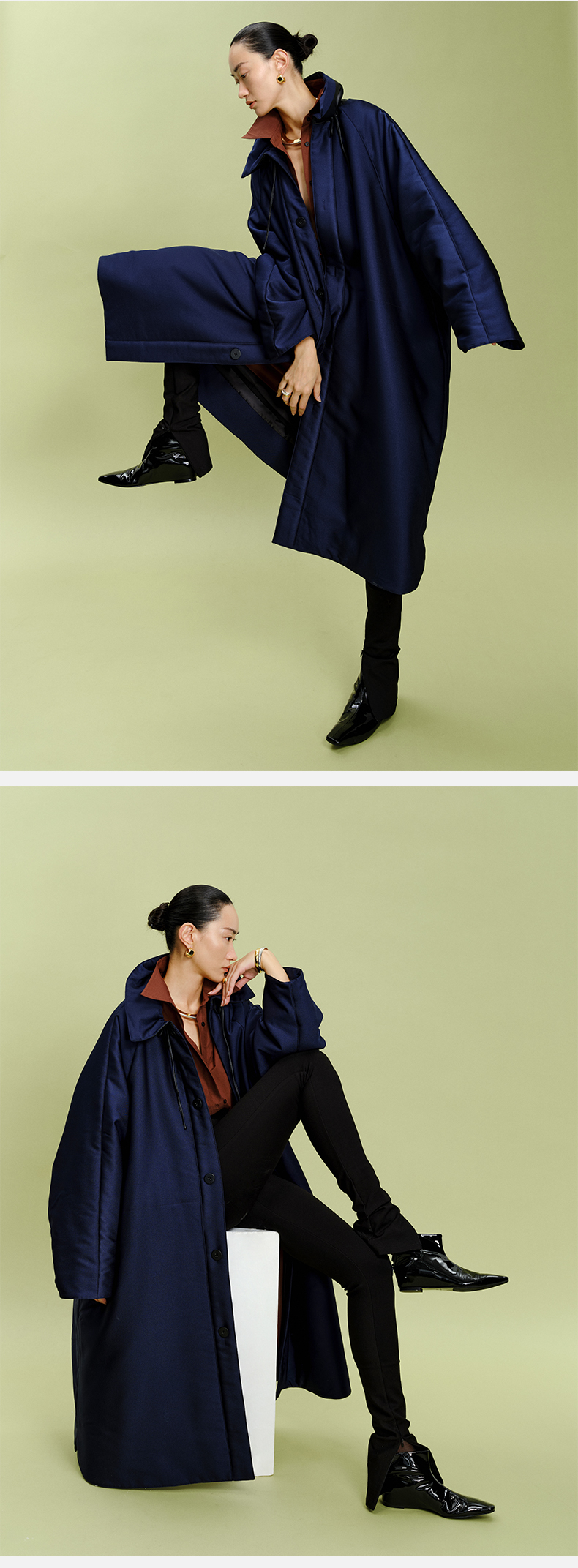 HIDEMI拼皮立领极简大廓型长款棉服