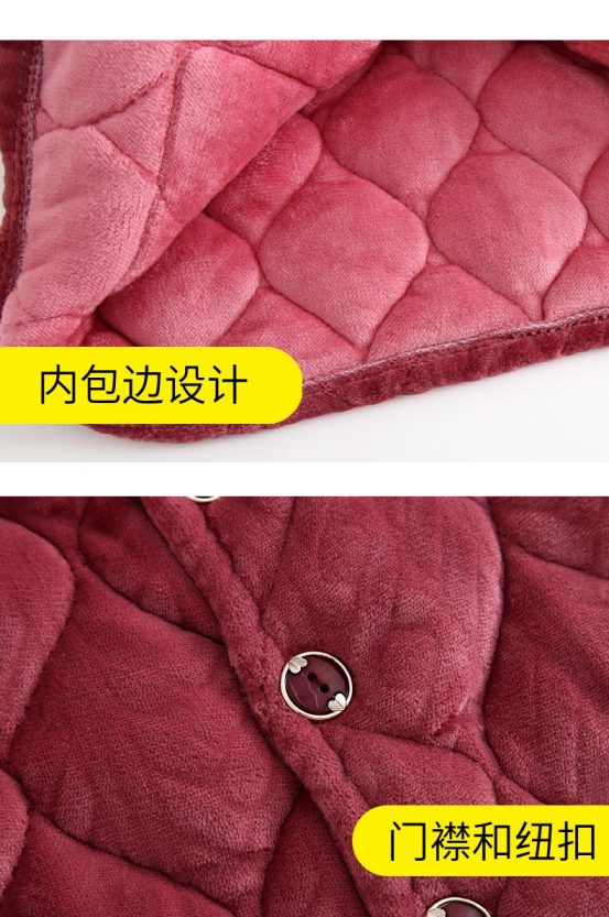 这款珊瑚绒面料不仅触感细腻滑爽,穿着起来还特别贴身且不显体型,非常适合日常休闲或冬季睡眠时使用。 而且其良好的透气性和亲肤性让婆婆们在享受冬日暖意的同时也能保持舒适度,不会过于闷热。