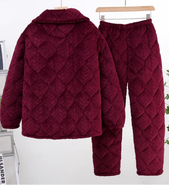 🧶这款睡衣采用了三层设计,从里到外都精心挑选了最优质的材料。 最内层为柔软的珊瑚绒面料,不仅贴身轻柔,还能有效隔离外界的寒冷; 中间层是高密度加厚棉布,提供额外的保温效果; 外面则是一层防风保暖的夹棉材质,让你即使在户外凛冽寒风中也能享受温暖如春。