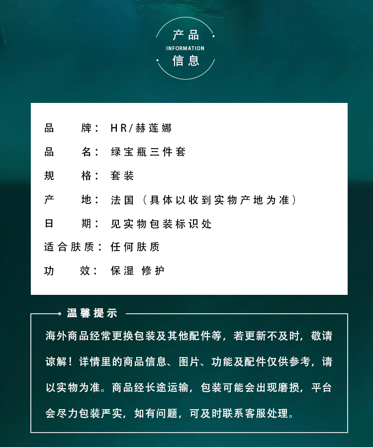 HR赫莲娜绿宝瓶三件套 悦活蓄能新肌水200ml修护精华露50ml洁面慕斯125ml(CDF)