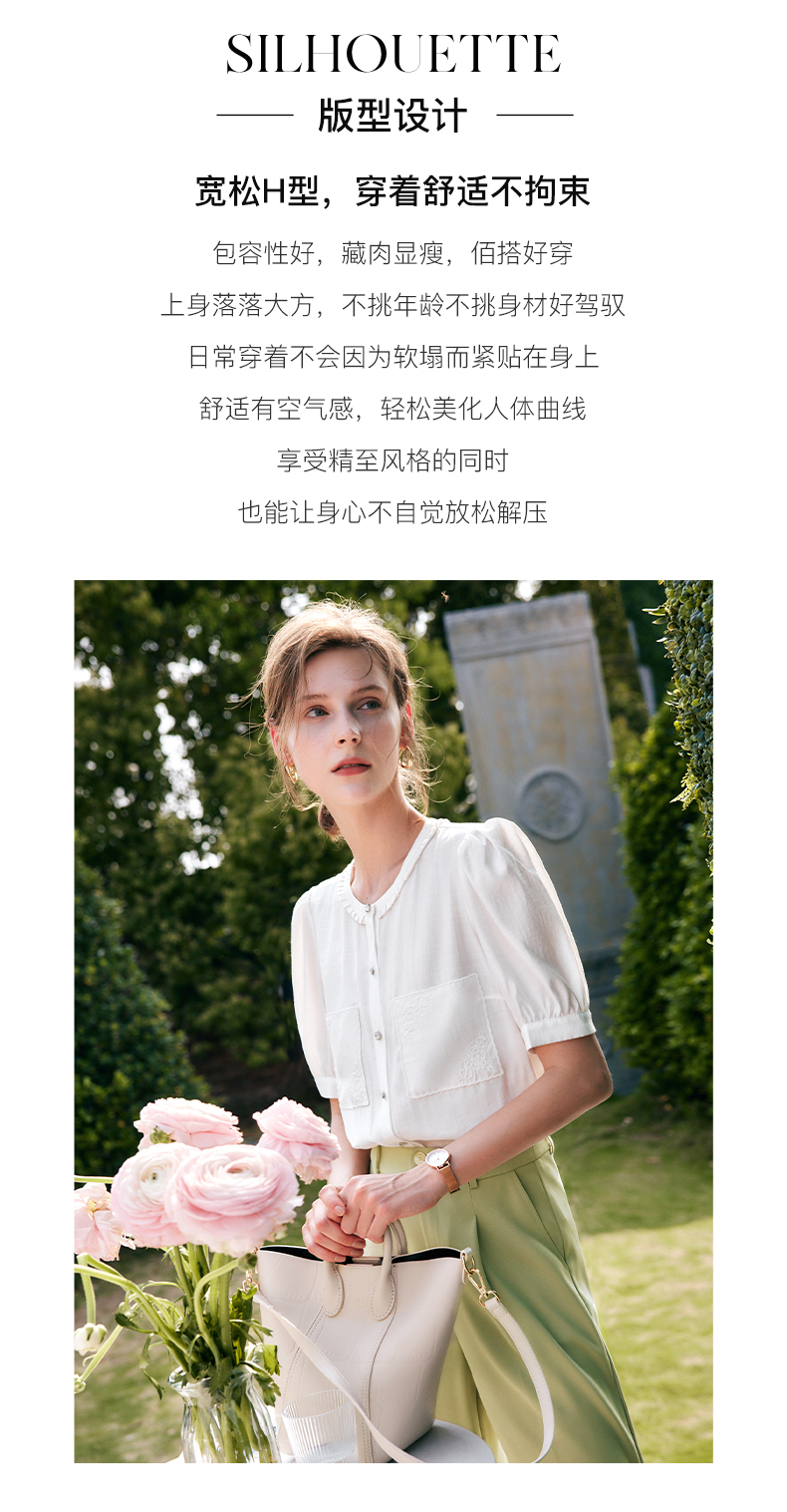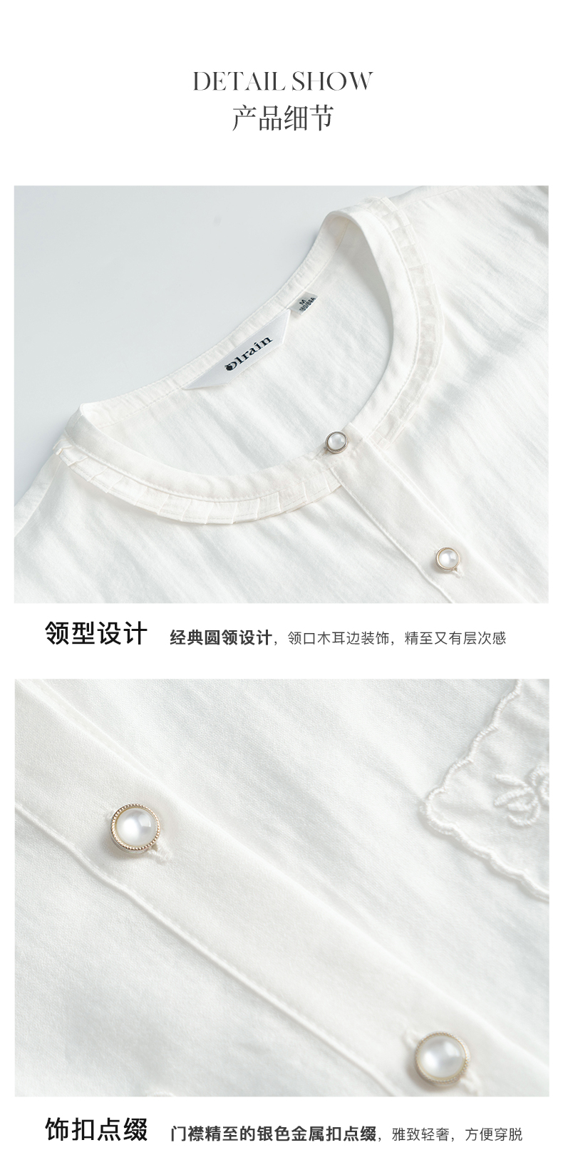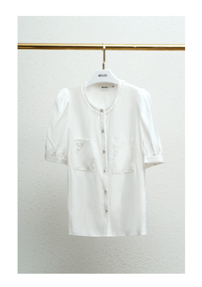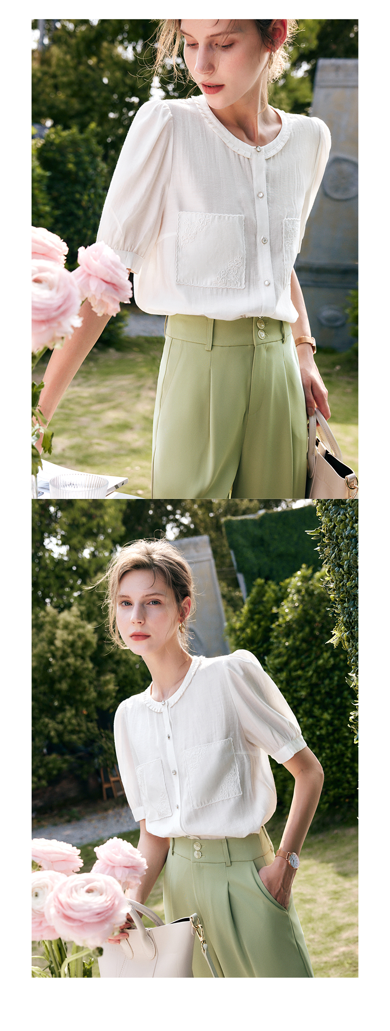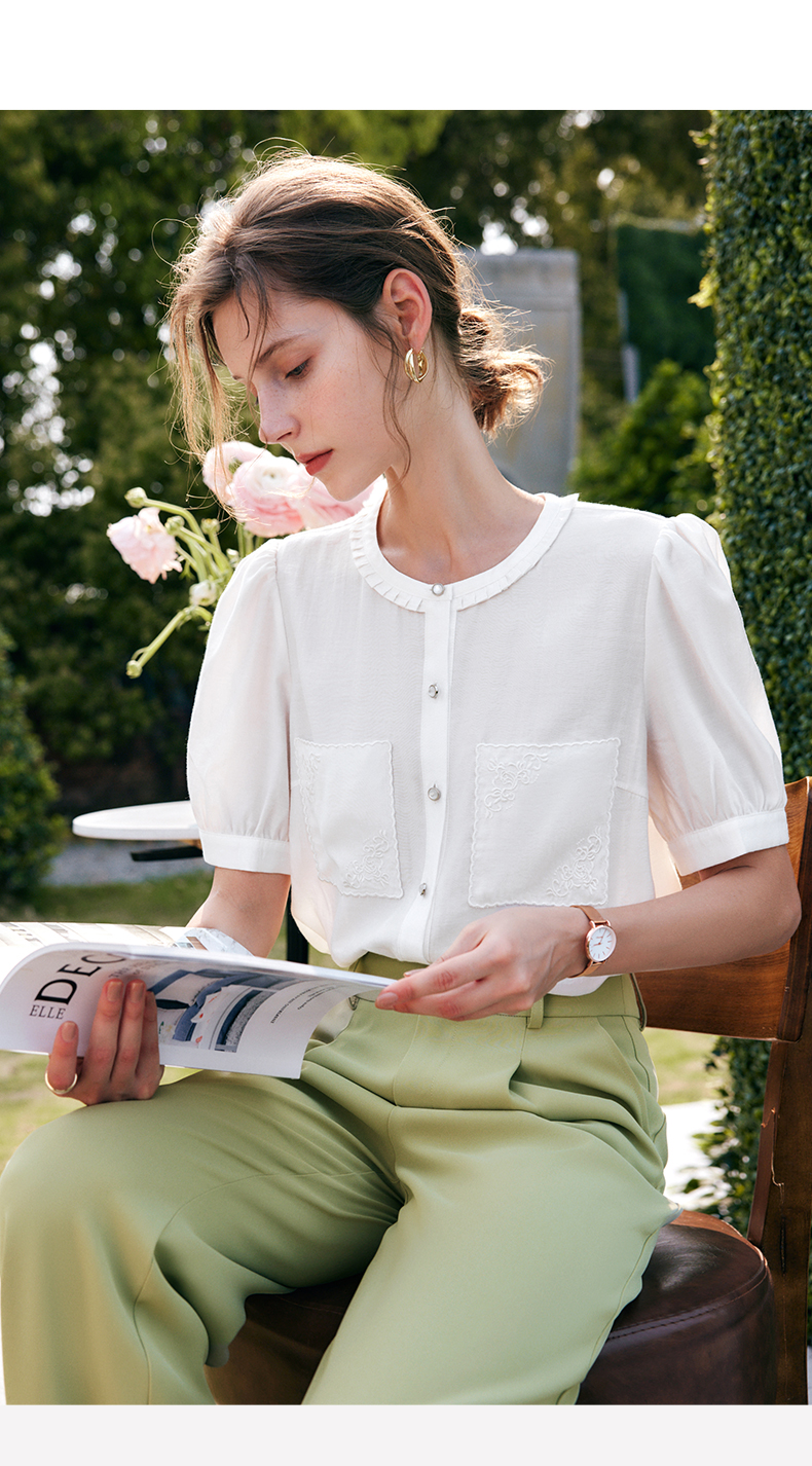 OLrain法式白色衬衫女夏季2022年新款刺绣泡泡袖薄款圆领短袖衬衣
