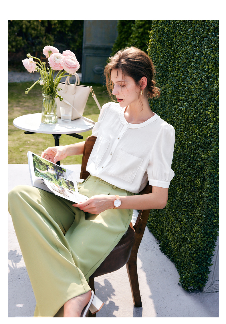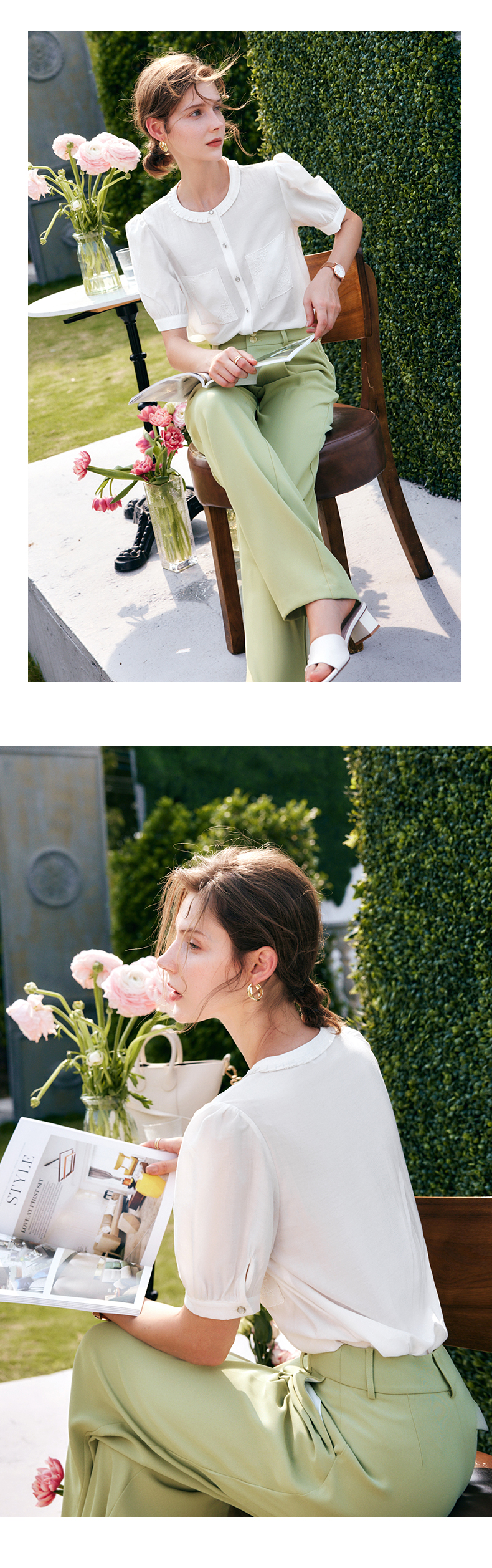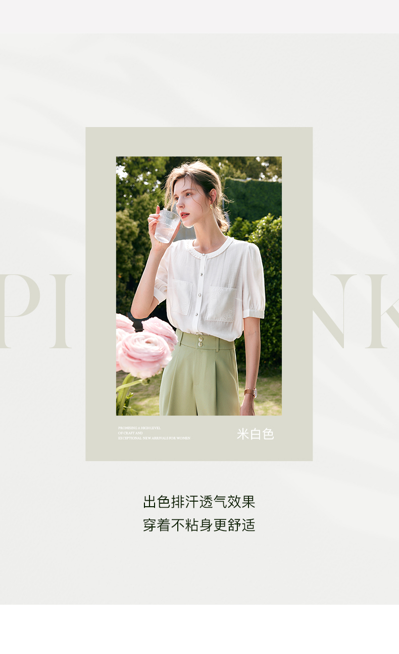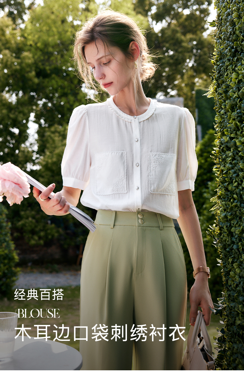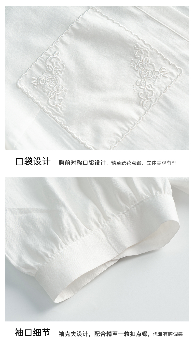 OLrain法式白色衬衫女夏季2022年新款刺绣泡泡袖薄款圆领短袖衬衣