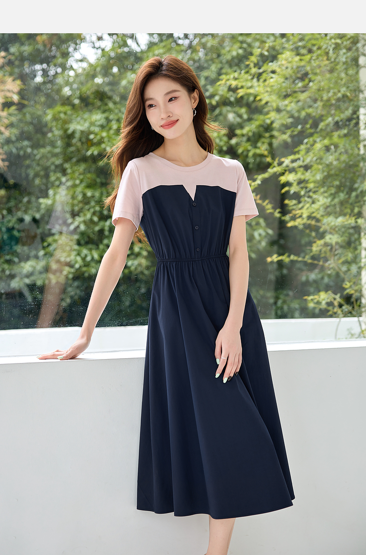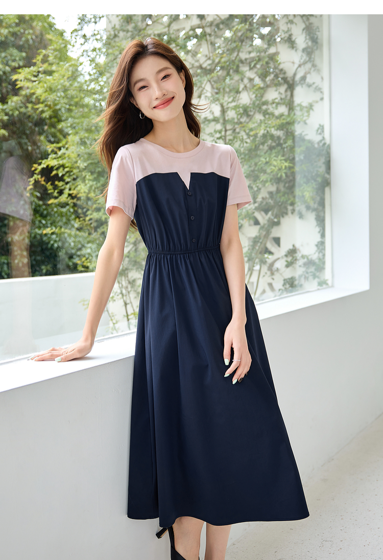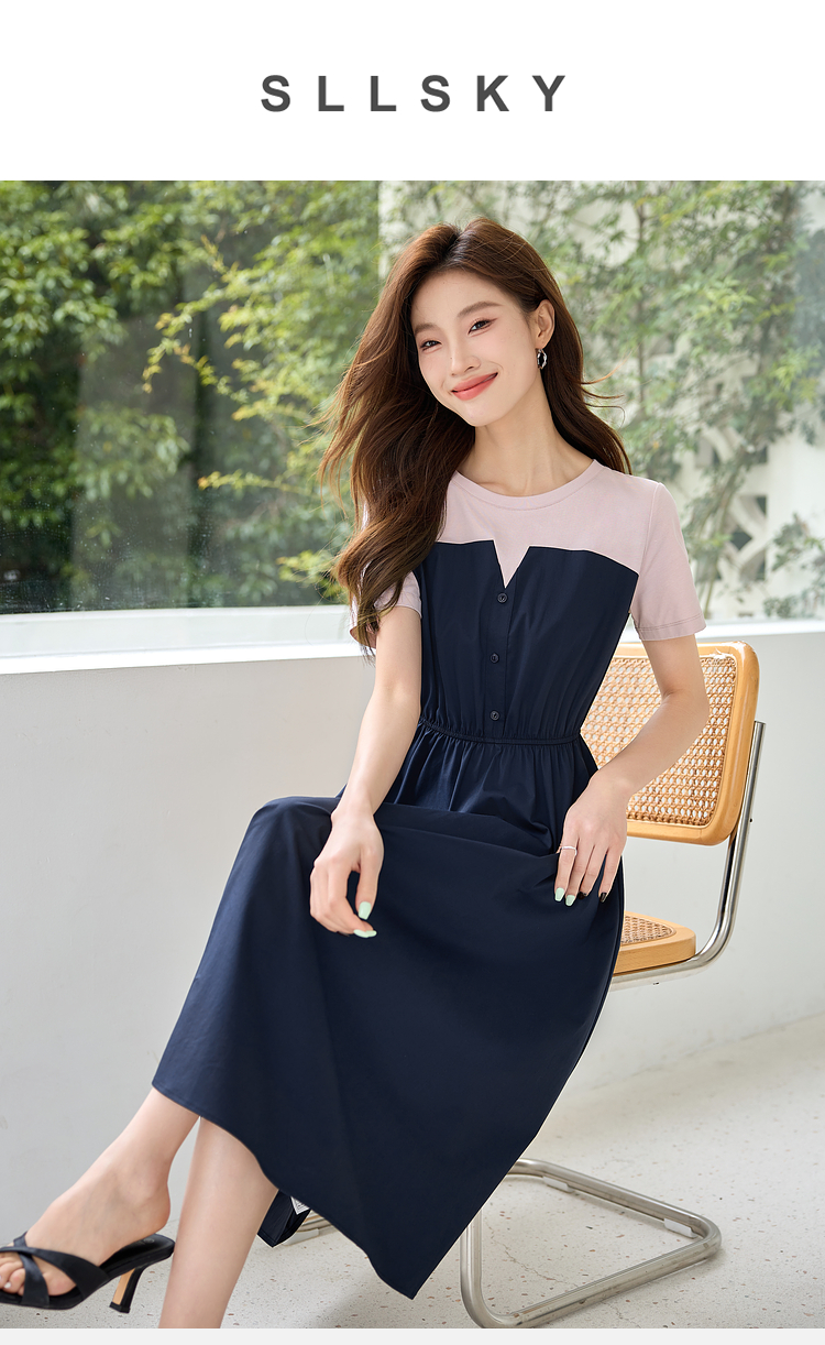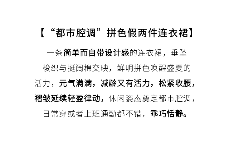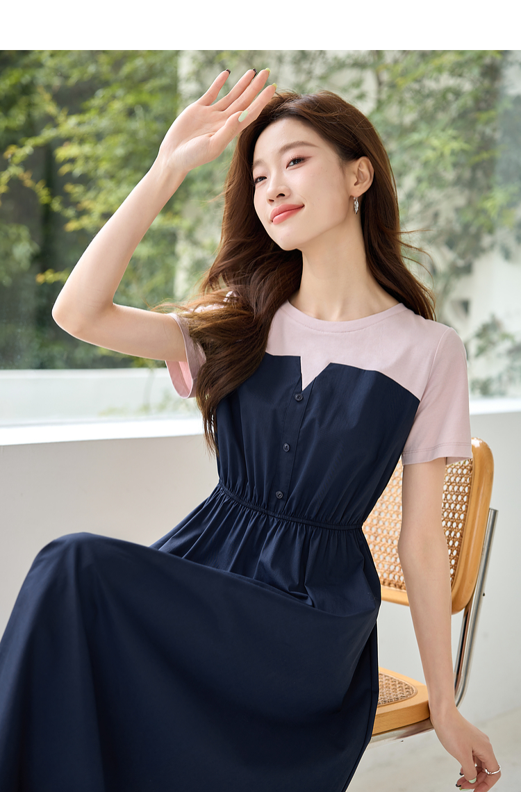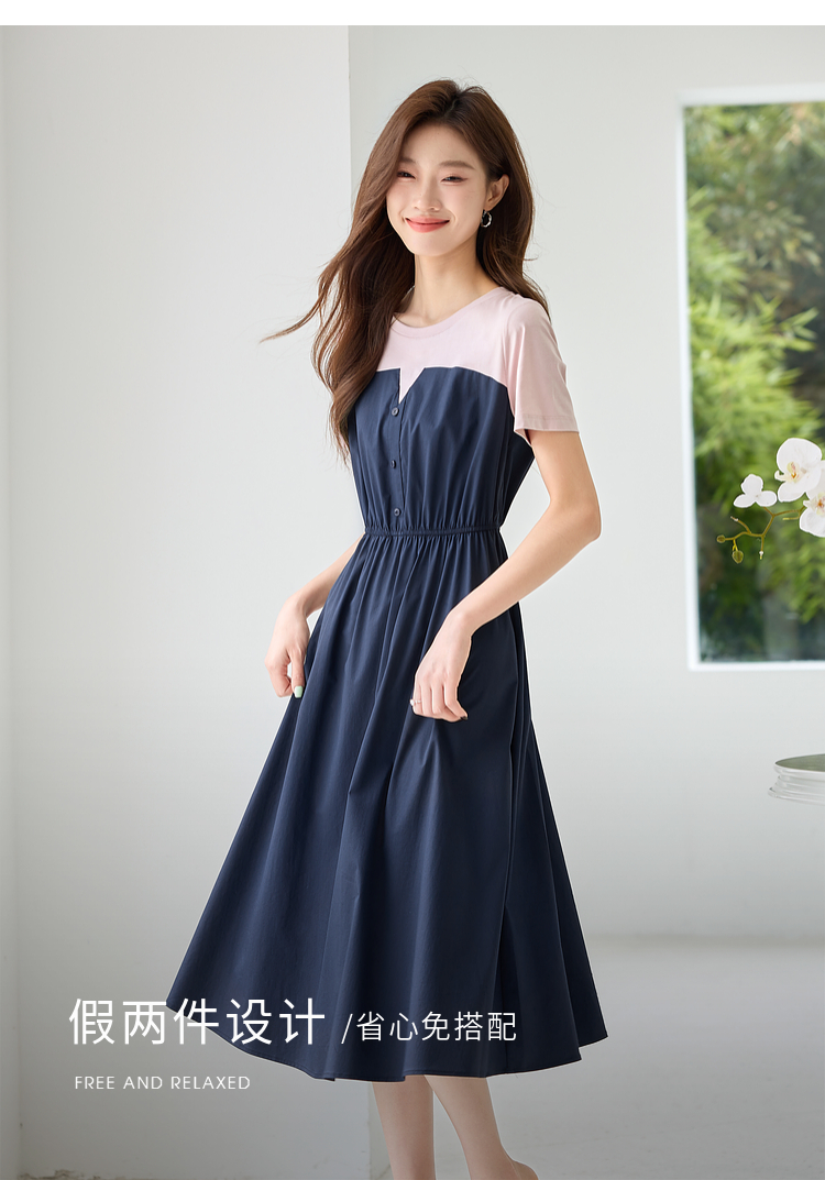 【专属特价】熙世界设计感气质收腰撞色短袖拼接假两件连衣裙子2025夏装新款