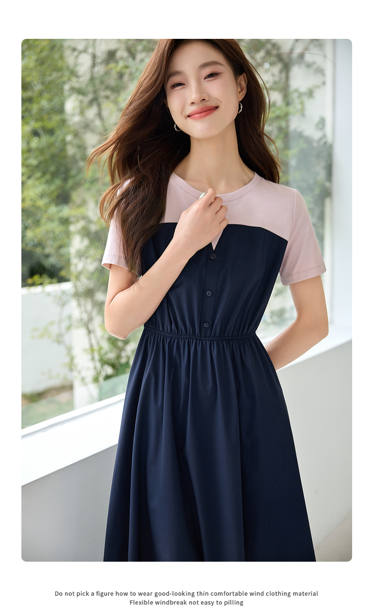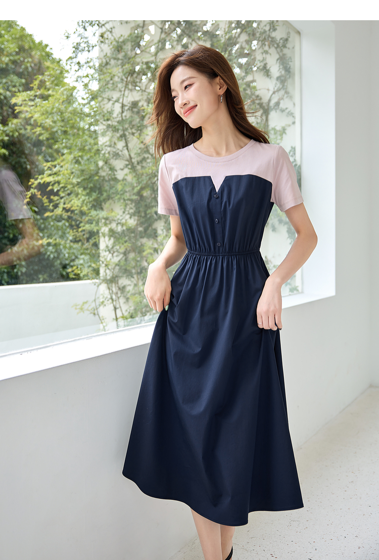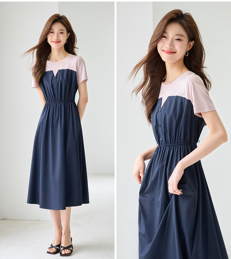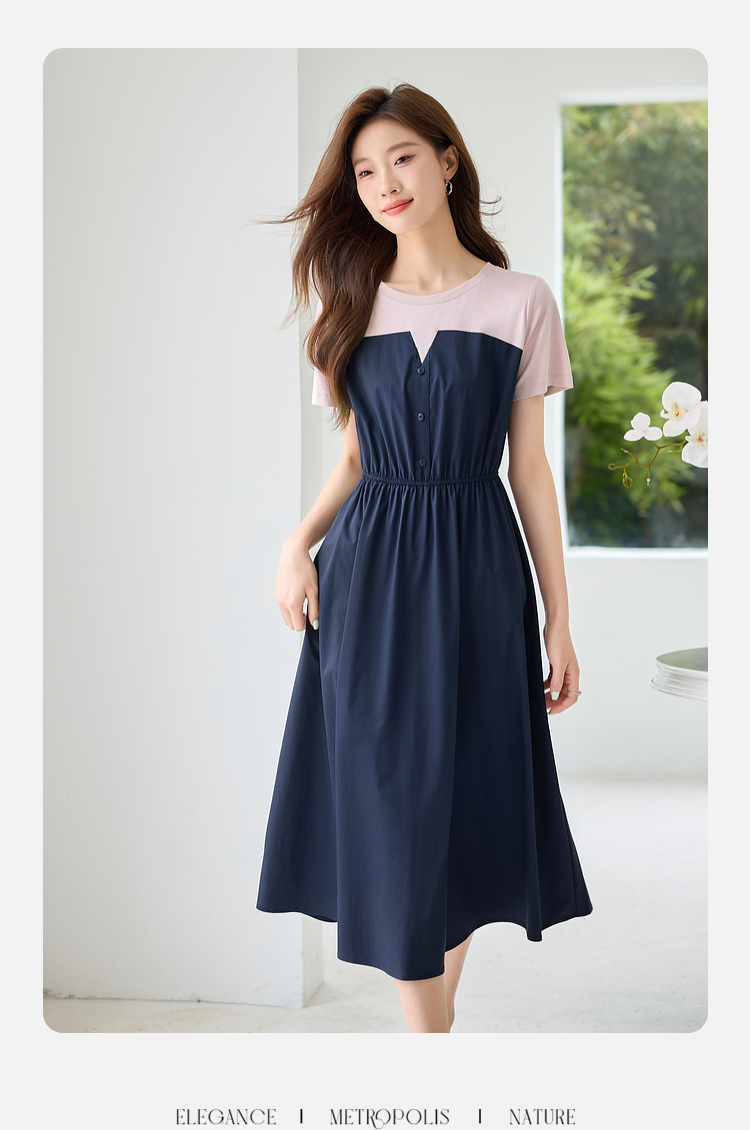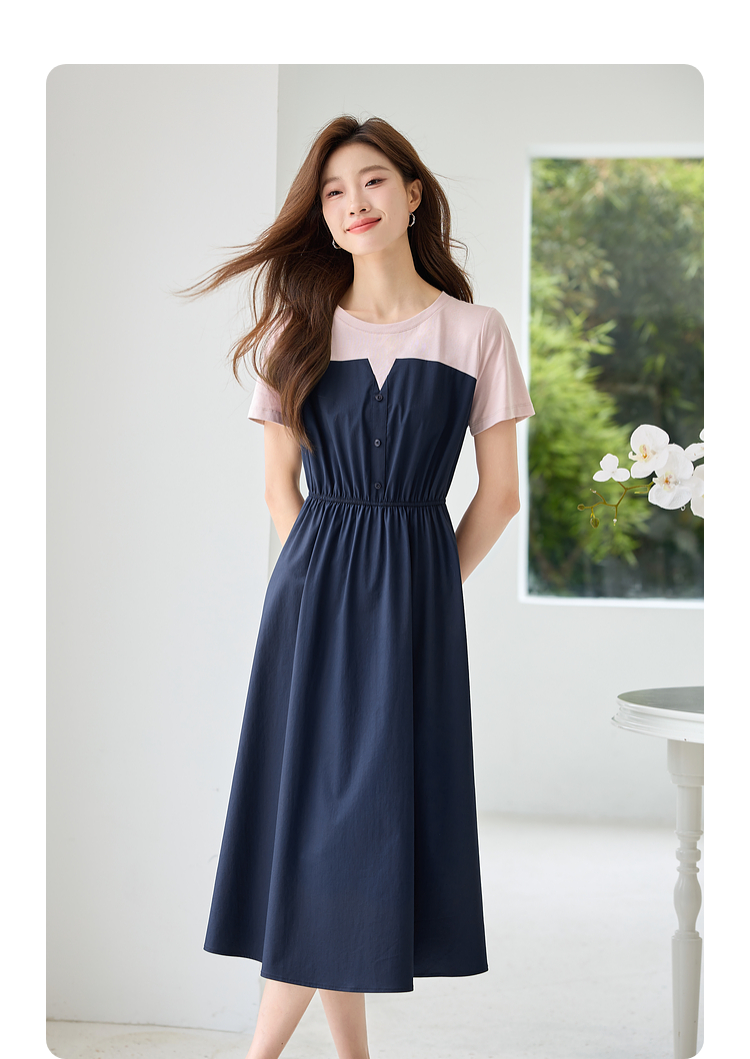 【专属特价】熙世界设计感气质收腰撞色短袖拼接假两件连衣裙子2025夏装新款