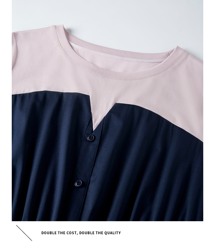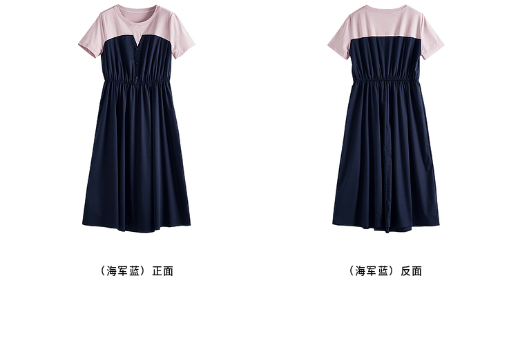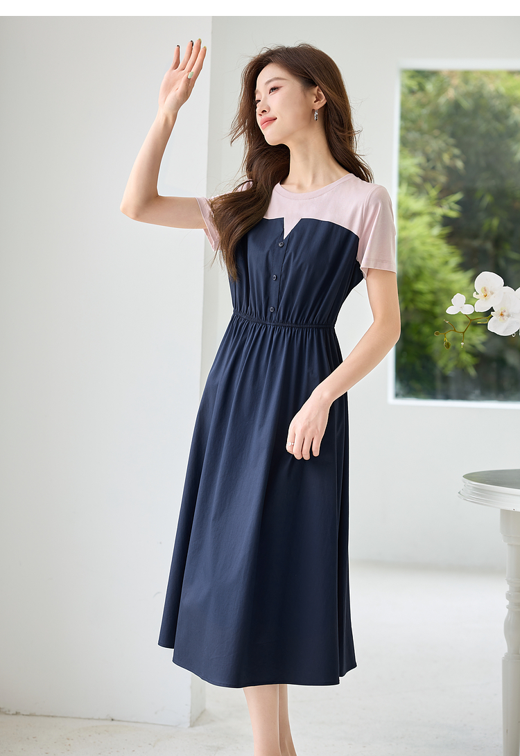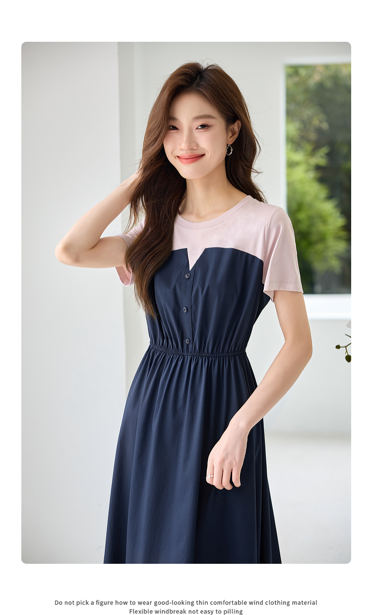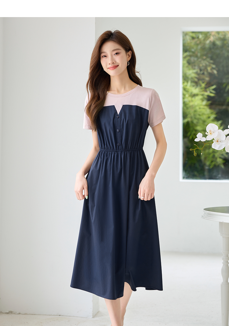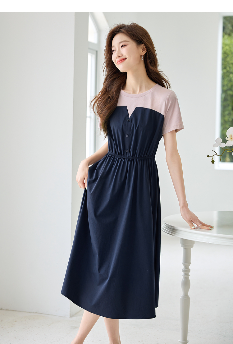【专属特价】熙世界设计感气质收腰撞色短袖拼接假两件连衣裙子2025夏装新款