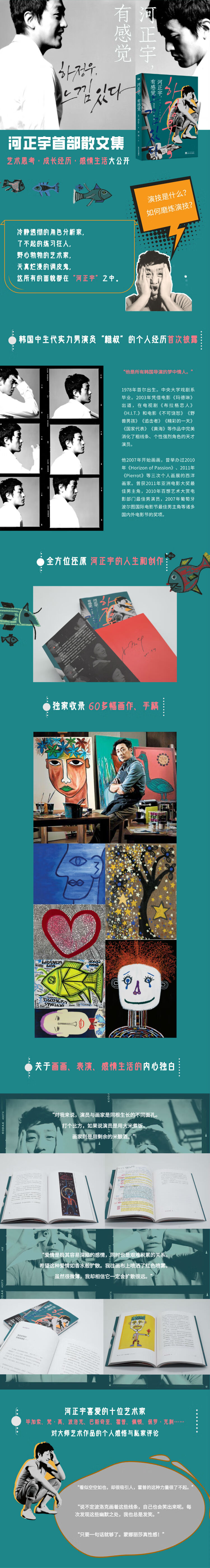 《河正宇,有感觉》收录了河正宇讲述个人经历、生活感悟、友情爱情、演艺事业和艺术创作的散文22篇,另有10篇河正宇对毕加索等艺术大师的介绍和评论,均为中文世界首次出版,除此之外,更收录有河正宇画作八十余幅,全方位还原河正宇的人生和创作。