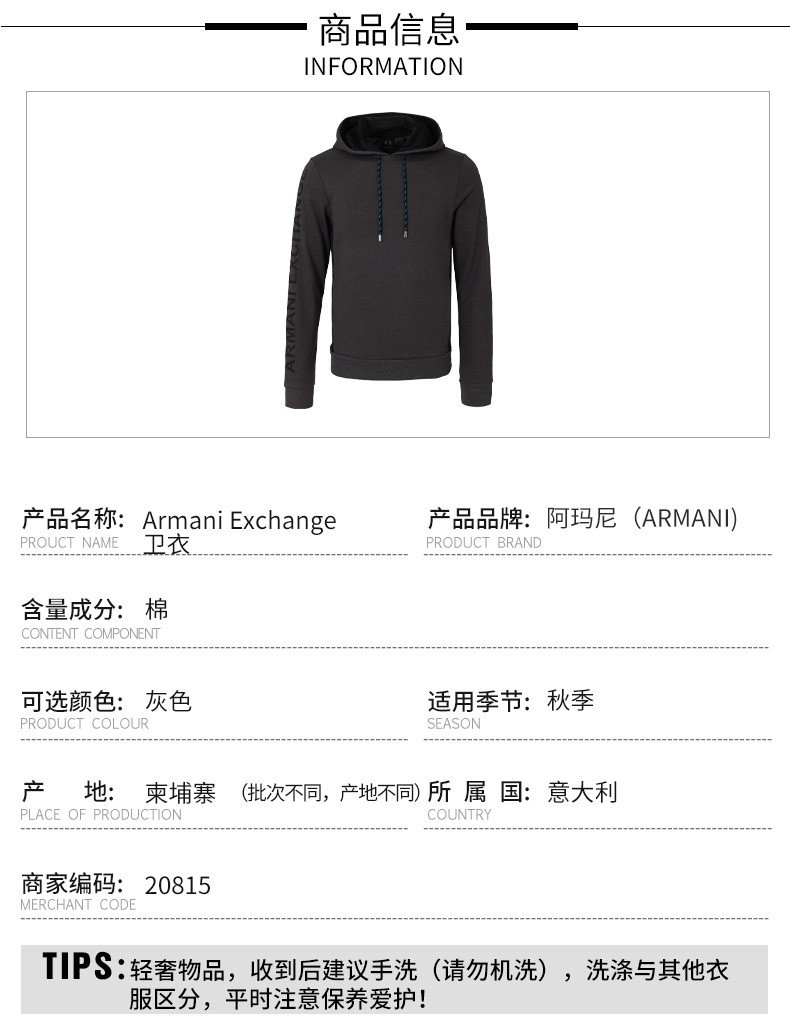 阿玛尼(ARMANI) 男款时尚百搭连帽休闲卫衣20815