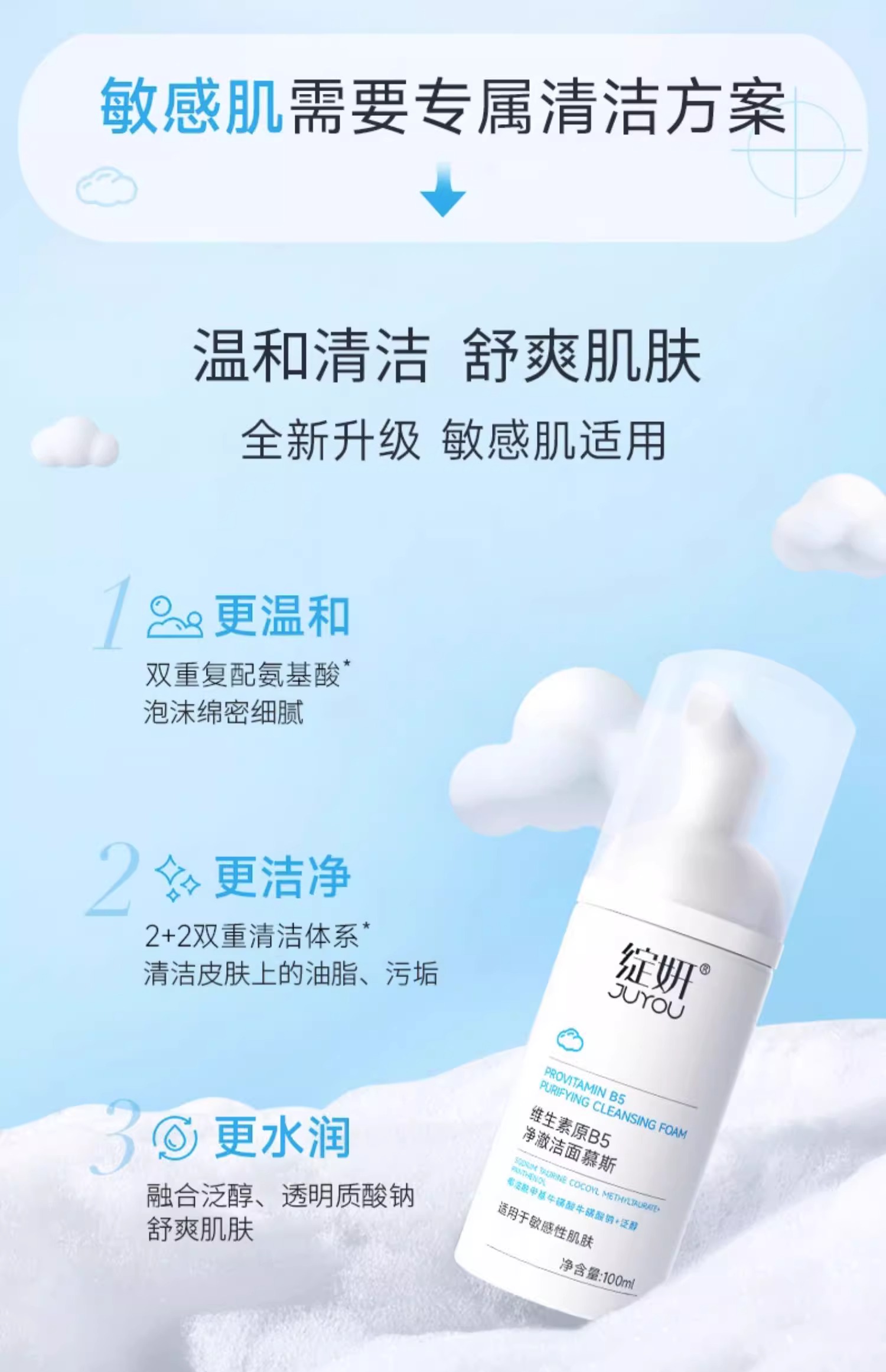 绽妍洗面奶氨基酸洁面泡沫100ml清洁男女敏感肌洁面慕斯